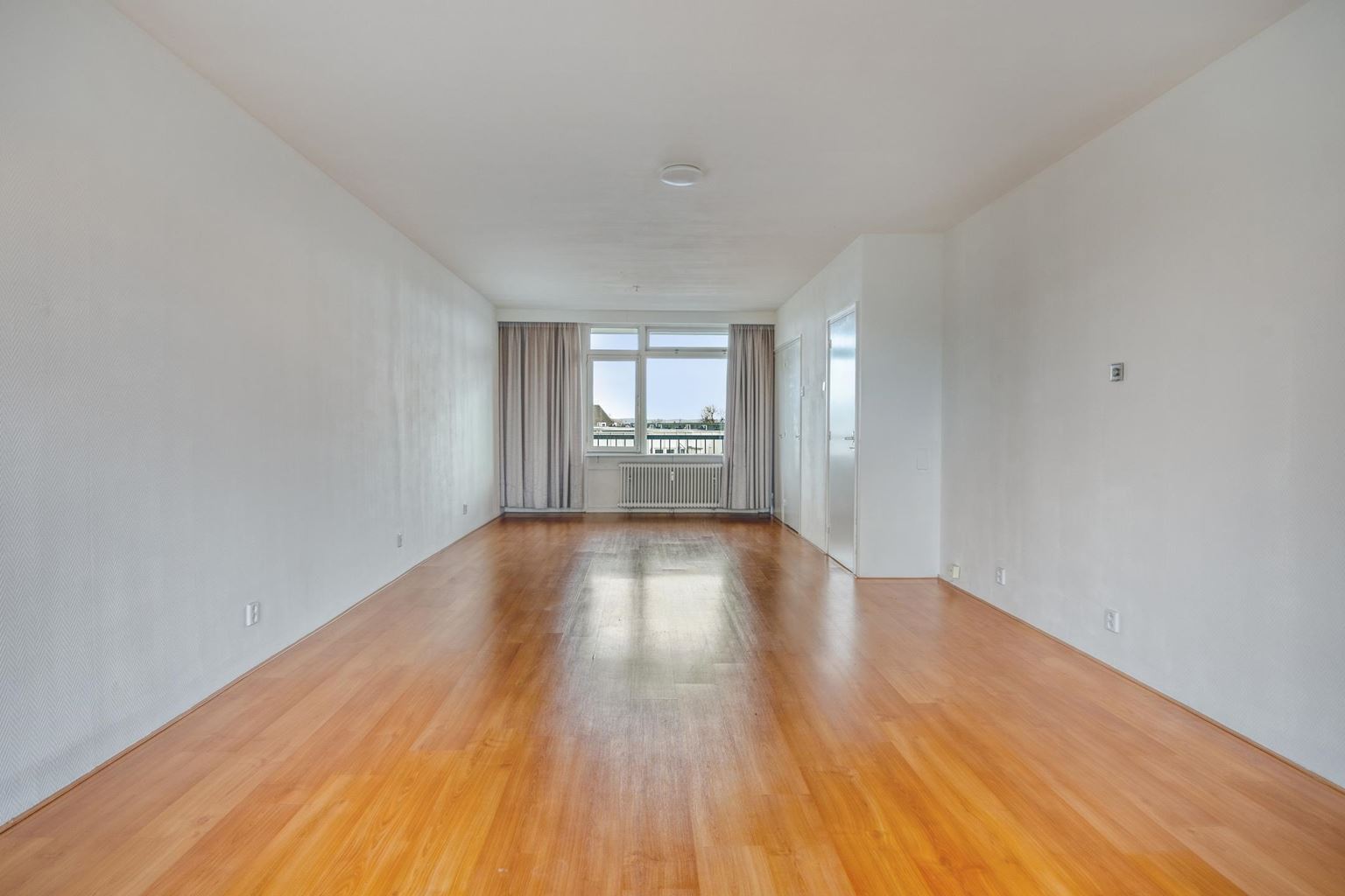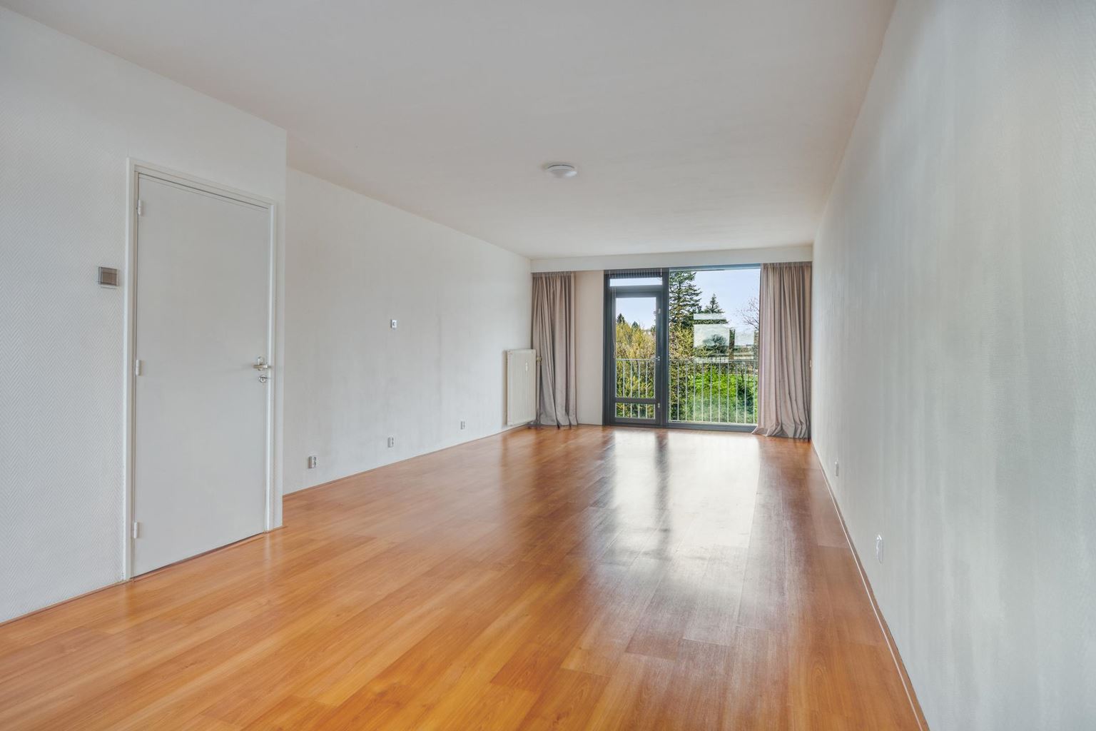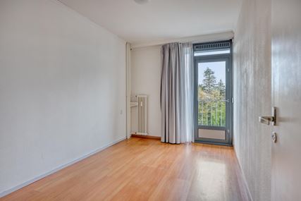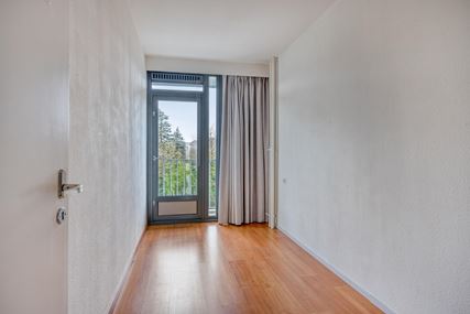 All rooms in the apartment are accessible via the spacious hall. The bright, open-plan living room (38m²) features attractive laminate flooring, and the large windows allow plenty of natural light to flood in. There are two practical built-in cupboards at the front. French doors lead directly onto the spacious west-facing balcony (9m²), where you can enjoy the beautiful views and complete privacy in peace and quiet.
