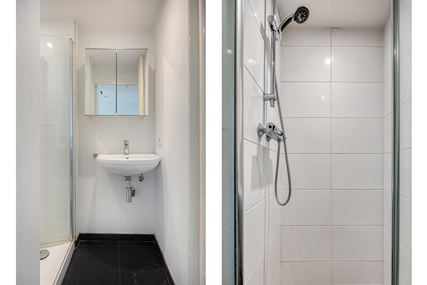 The flat features two full-sized bedrooms, measuring 11m² and 8m² respectively, which are situated at the rear; they have laminate flooring and French doors leading onto the balcony. One of these rooms also has a practical built-in wardrobe. The neat bathroom (2m²) is fitted with a shower, a washbasin and a mirror cabinet. Adjacent to this is a wall cupboard and a separate modern wall-hung toilet.