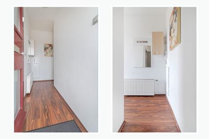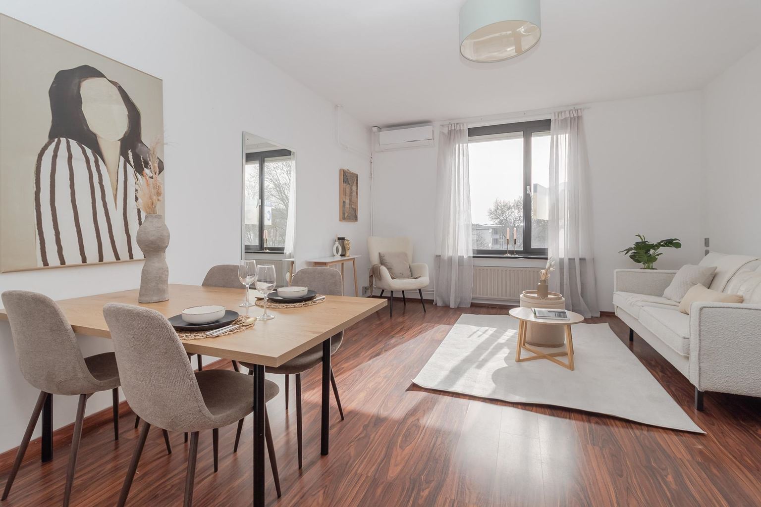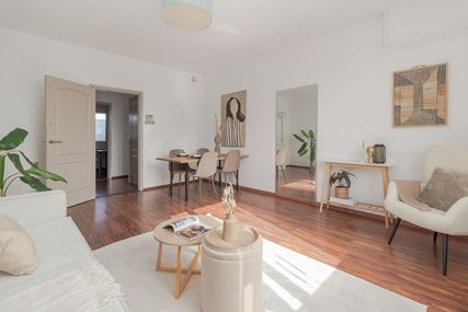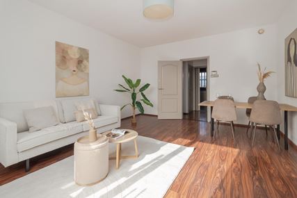 From the hall, you can access the living room, the kitchen and the staircase leading to the fourth floor. The living room, measuring approximately 21.5 m², is pleasantly light thanks to the large windows at the front of the complex. The room features neat laminate flooring and is equipped with air conditioning that can both cool and heat, ensuring comfortable living conditions all year round.