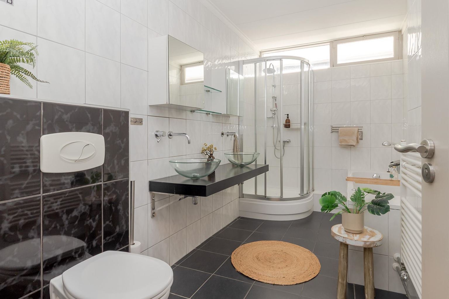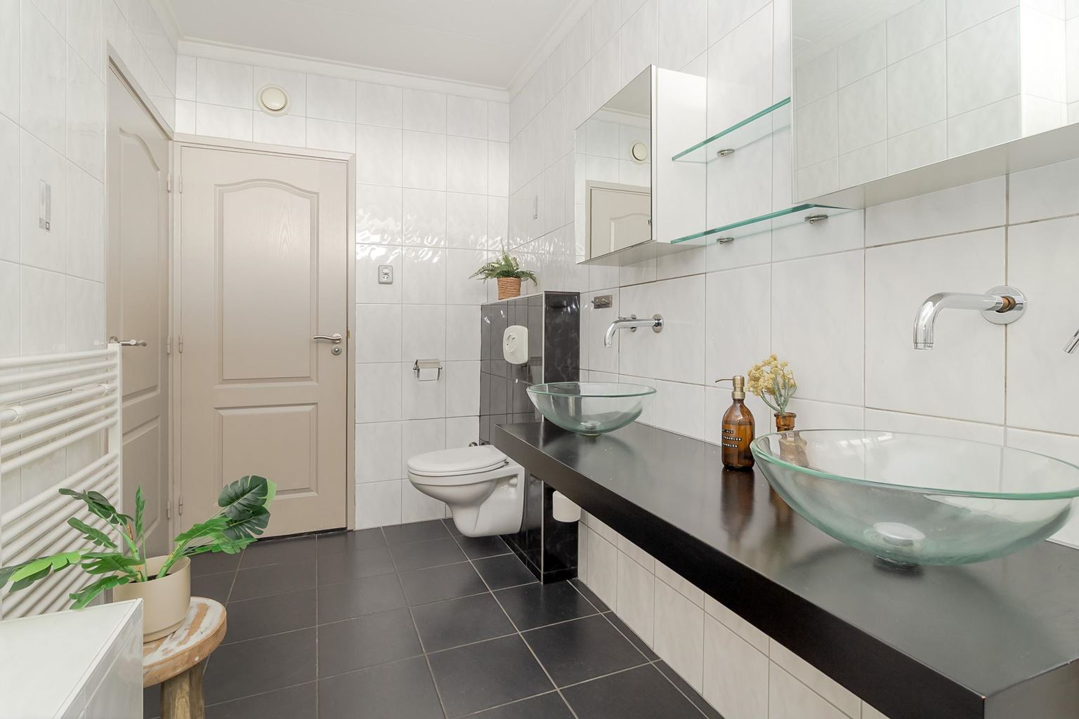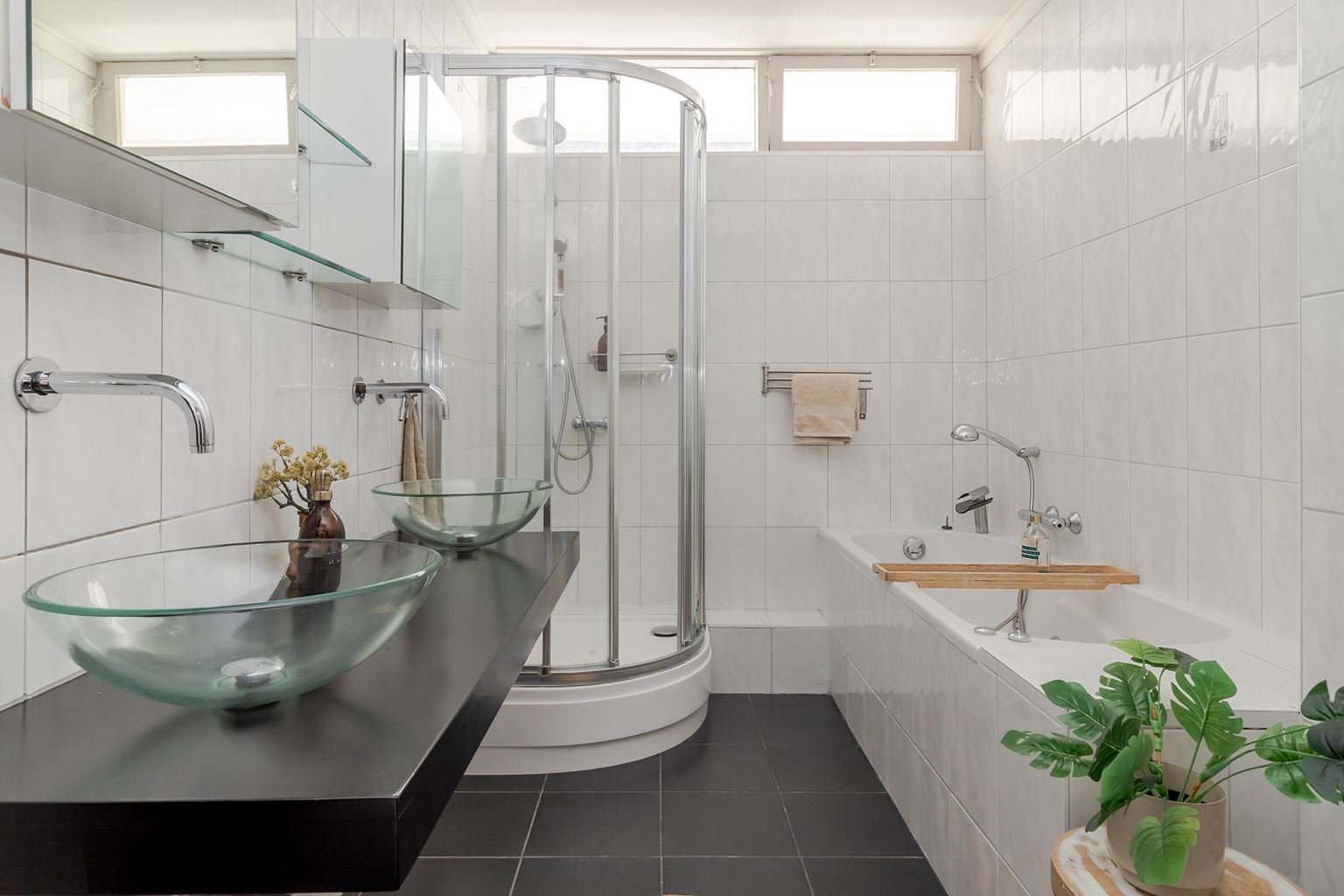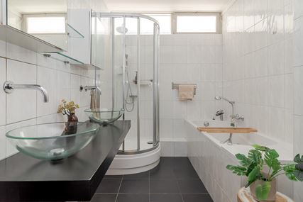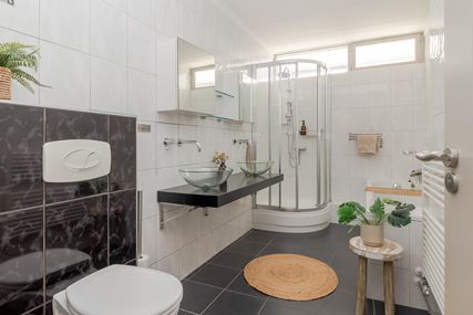 The bathroom is spacious and fully tiled. This room features a bath, shower, double washbasin, wall-mounted toilet and a built-in cupboard. There is also a towel radiator and two medicine cabinets.