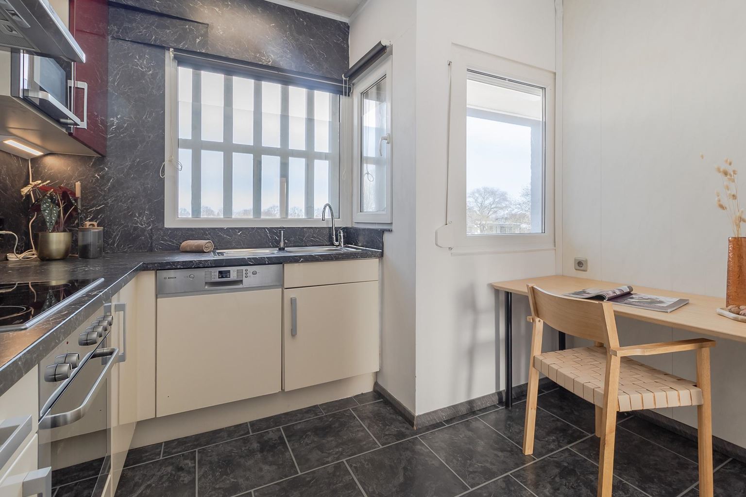 The separate kitchen, measuring approximately 8 m², features a modern corner unit with wall and base cabinets and various built-in appliances, namely: a sink, a 4-ring ceramic hob with a stainless steel extractor hood, a combi-oven, an additional oven, a dishwasher, a fridge and a freezer. There is also ample space for a dining table.