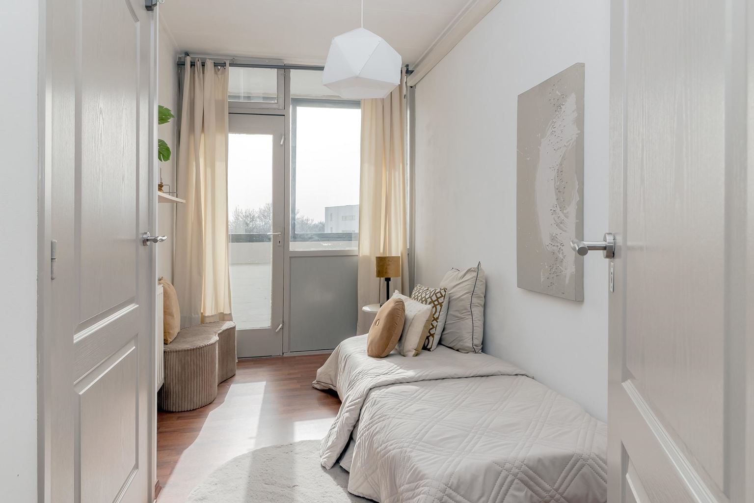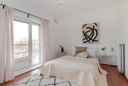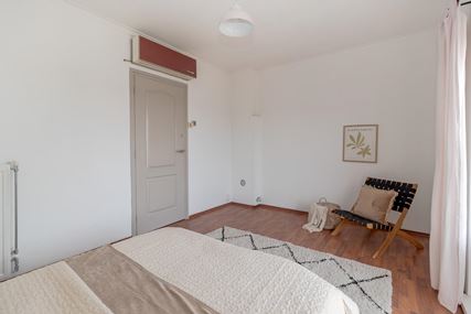 The master bedroom, measuring approximately 13 m², is situated at the rear of the flat and features an air-conditioning system capable of both cooling and heating. The second bedroom, measuring approximately 7.5 m², is located at the front of the flat, features practical built-in cupboards and provides access to the loggia via French doors.