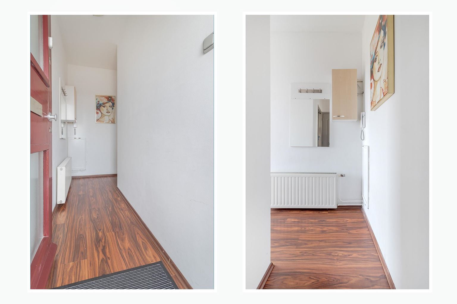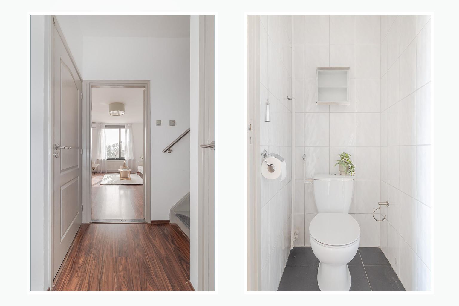 The covered entrance leads into the apartment's hallway. The hallway houses the meter cupboard, a practical stair cupboard and the toilet. The toilet is partially tiled and fitted with a wall-mounted toilet and a washbasin.
