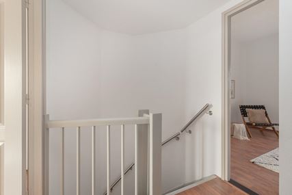 The staircase leads to the landing on the fourth floor. From here, you can access two bedrooms, the bathroom and a practical utility room.