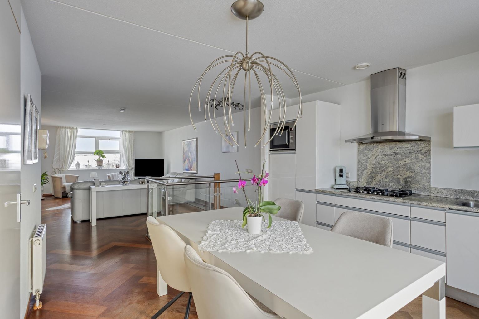 The living room is divided into a sitting area at the front and a dining area at the rear. Adjacent to the dining area is the modern open kitchen, designed in a practical row configuration and equipped with a granite worktop, microwave, dishwasher and a 5-burner gas stove with extractor hood. The separate fridge with freezer will be taken by the seller.