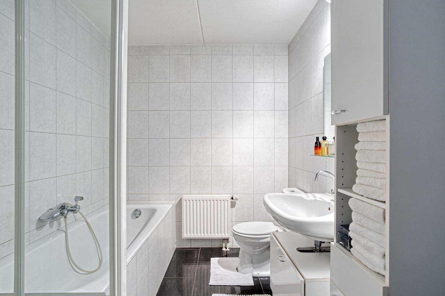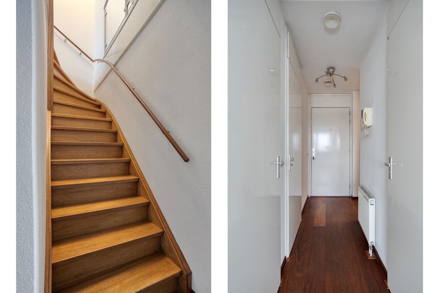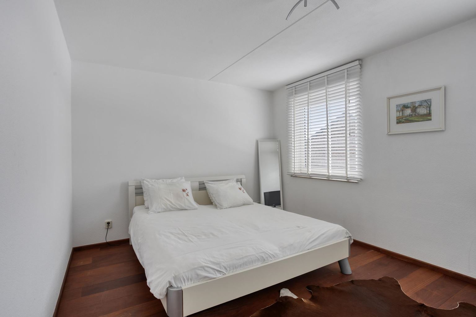 The entrance leads to the hall, which provides access to the various rooms. At the rear is the spacious bedroom (16m²), with beautiful parquet flooring and stylish shutters. This floor also has a practical storage room (2m²) and the bathroom. The storage room has connections for a washing machine and dryer, and houses the heat recovery unit and combi boiler. The spacious bathroom (6m²) is fully tiled and equipped with a shower, bathtub, toilet and washbasin with cabinet.