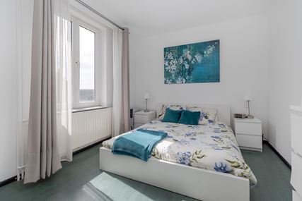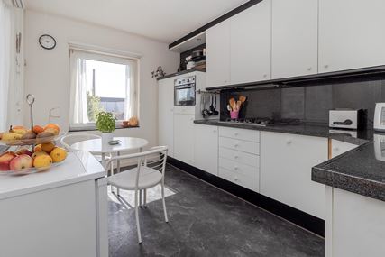 The simple closed kitchen (10 m²) is designed in a practical corner layout and equipped with a 4-burner gas stove with extractor hood, sink, combination microwave oven, dishwasher, and refrigerator. From the kitchen, there is access to the balcony and the lower-lying backyard. Here too, large windows provide ample daylight.
