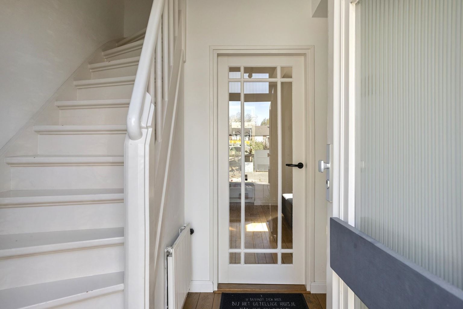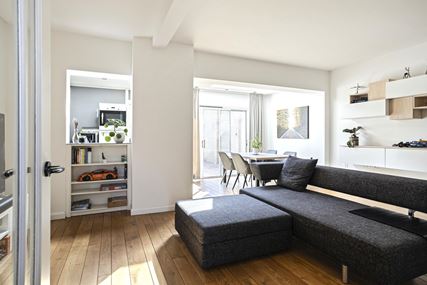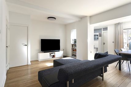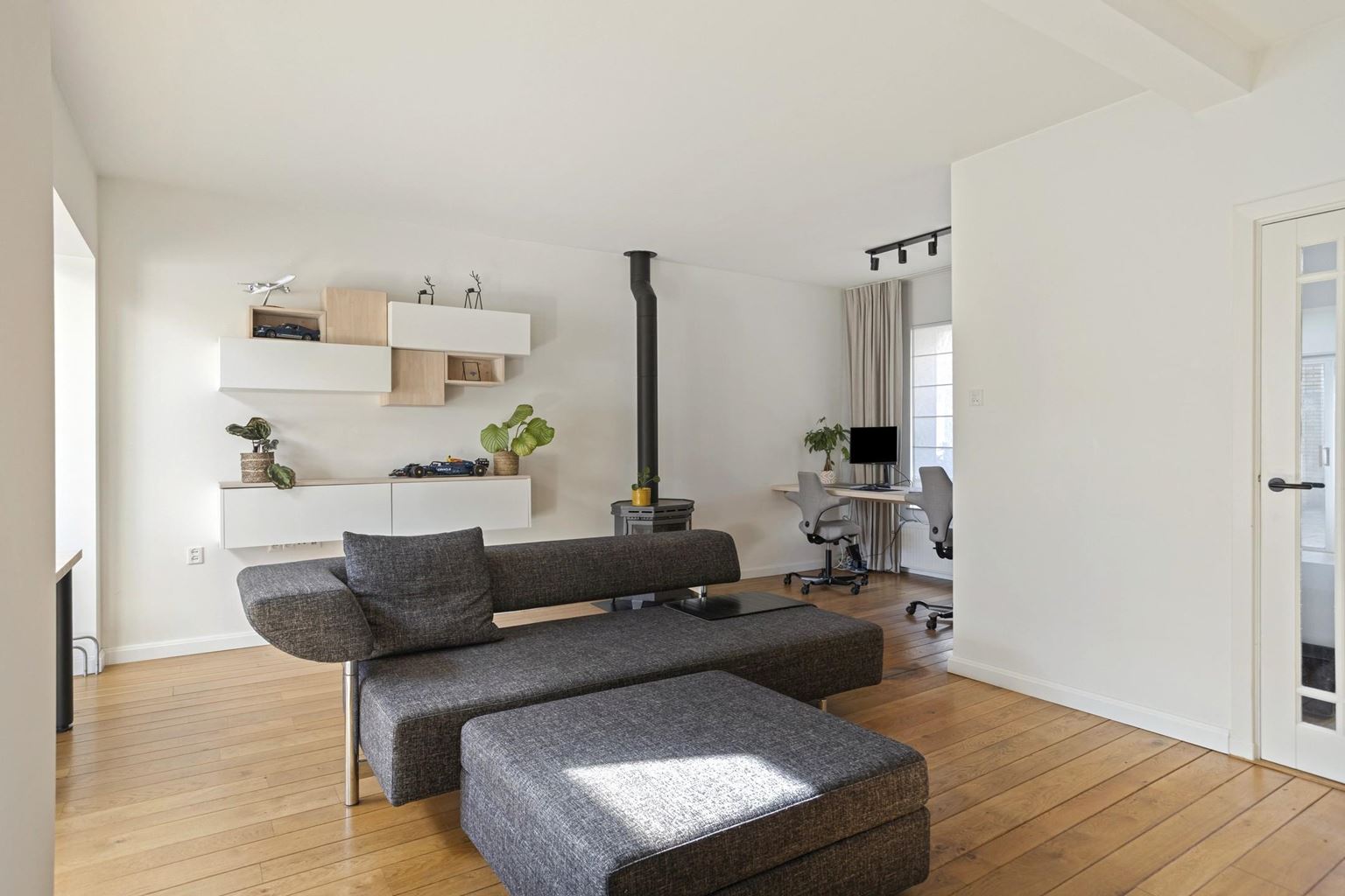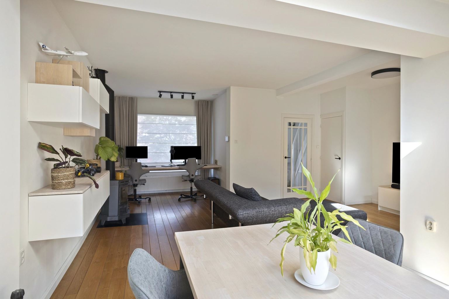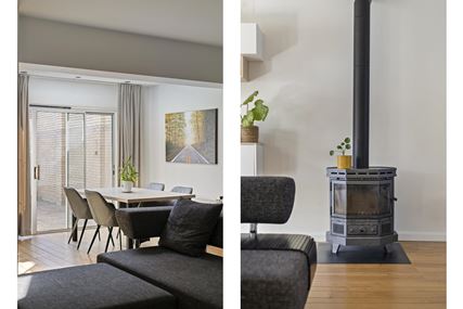 Through the entryway/hallway, which features a modern, fully tiled half-bath, a utility closet, and a coat closet, you enter the living room, approximately 34 m². The living room features original hardwood flooring and a cozy wood-burning stove. The large sliding glass doors at the rear not only allow plenty of natural light to flood in but also provide direct access to the garden.