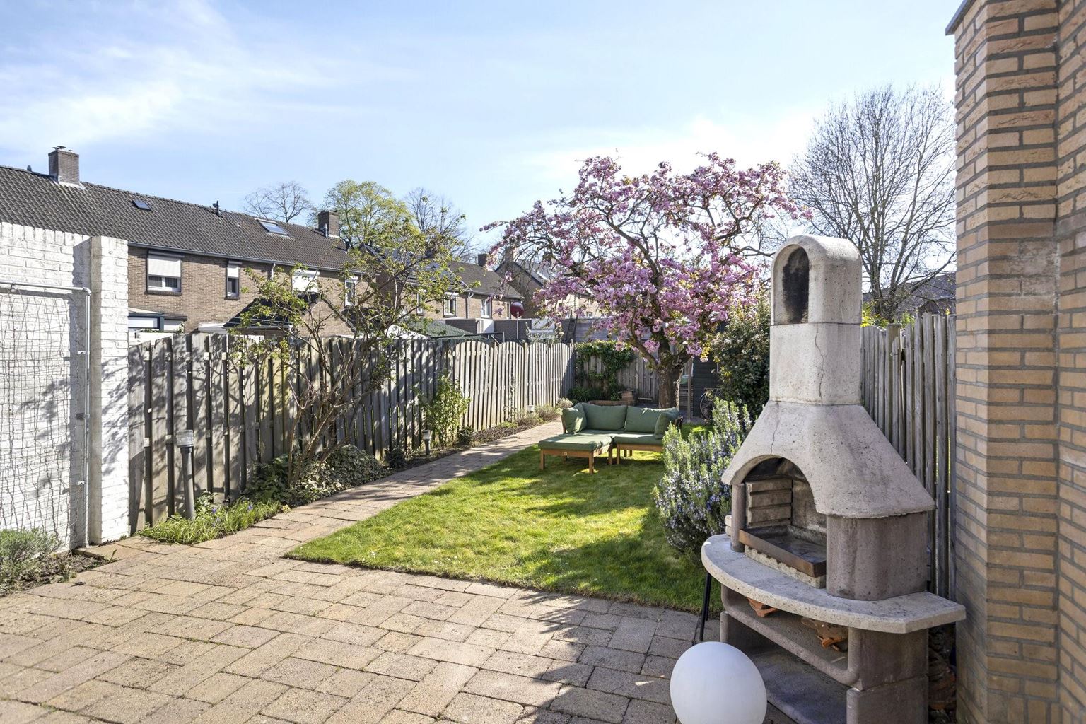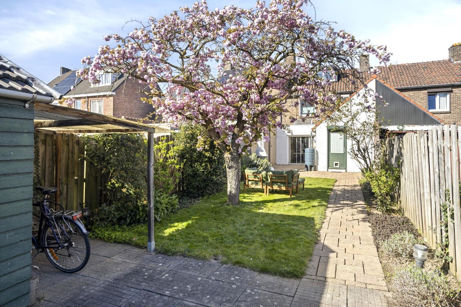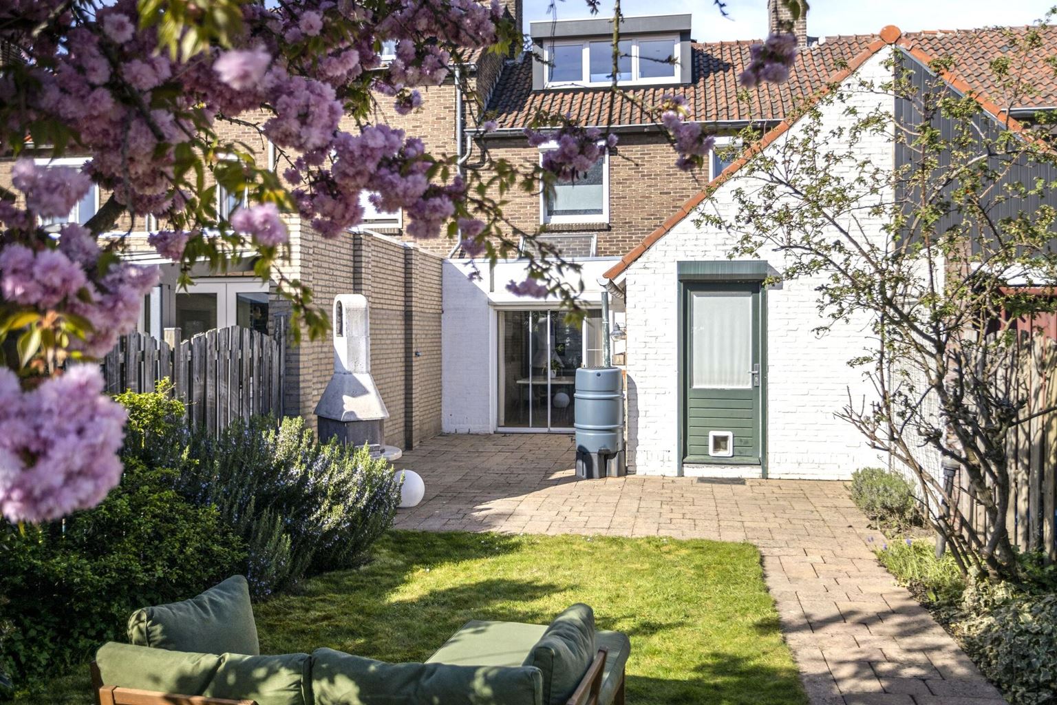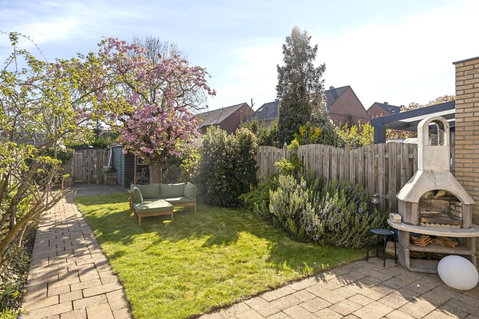 The backyard is surprisingly spacious and conveniently south-facing. The garden is beautifully landscaped with a patio, permanent plantings, and features a practical garden shed and a back entrance.