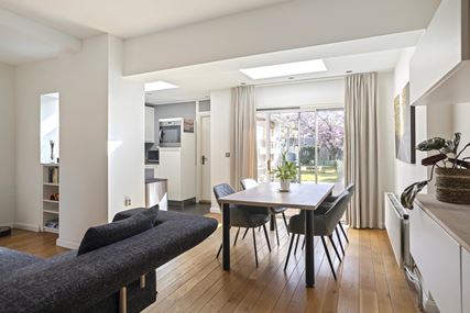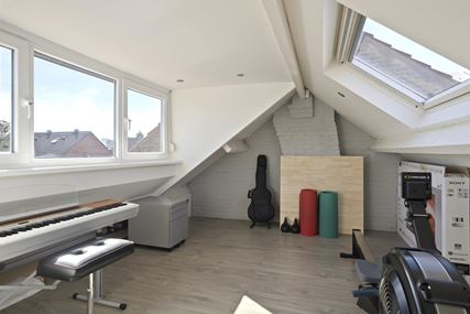 Adjacent to this is the spacious utility room (approx. 9 m²), equipped with connections for appliances and offering extra storage space thanks to the loft. The garden is also accessible from the utility room. A particularly special feature is the double skylight above the living room and kitchen, which provides an abundance of natural daylight and a sense of spaciousness.