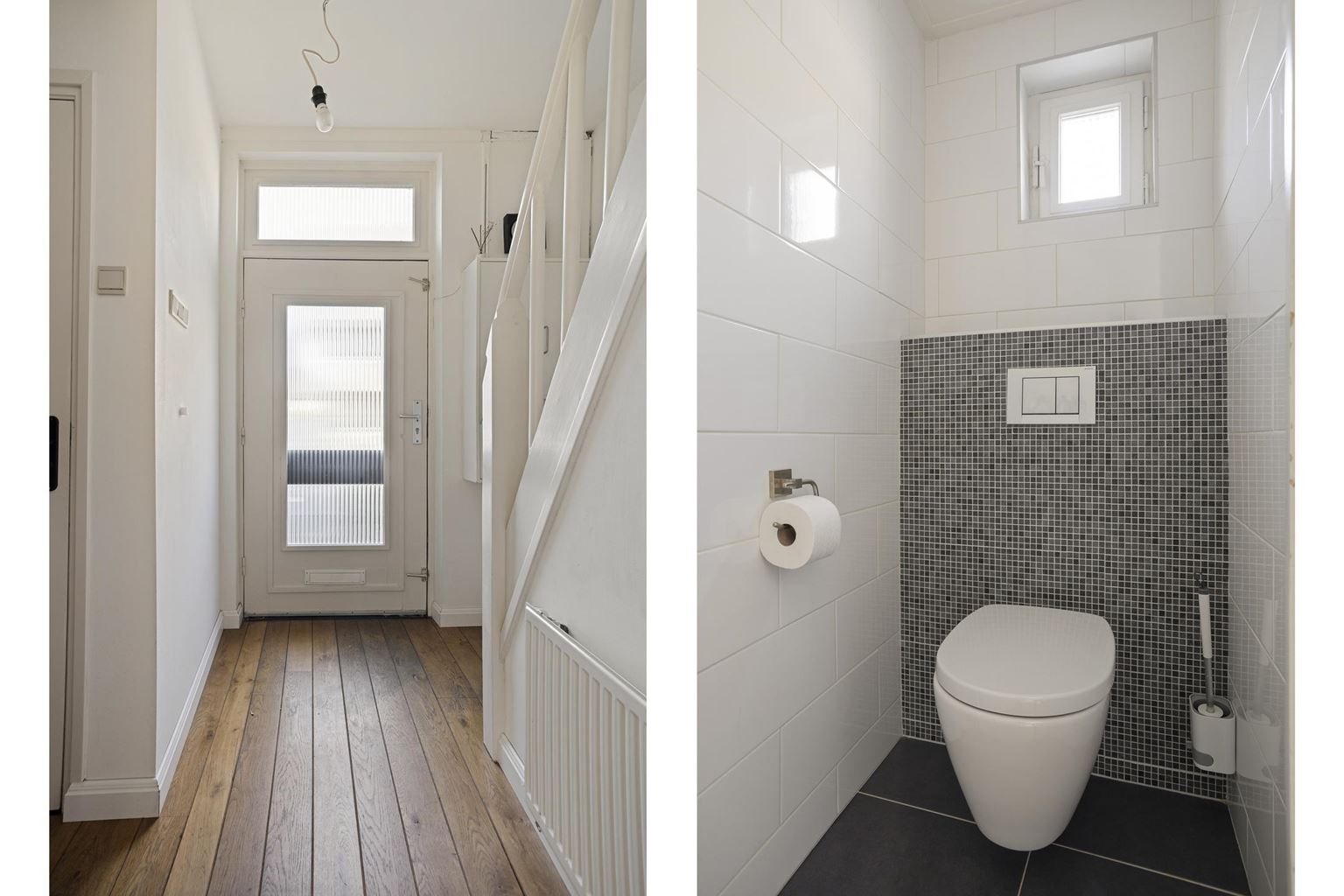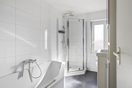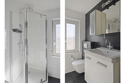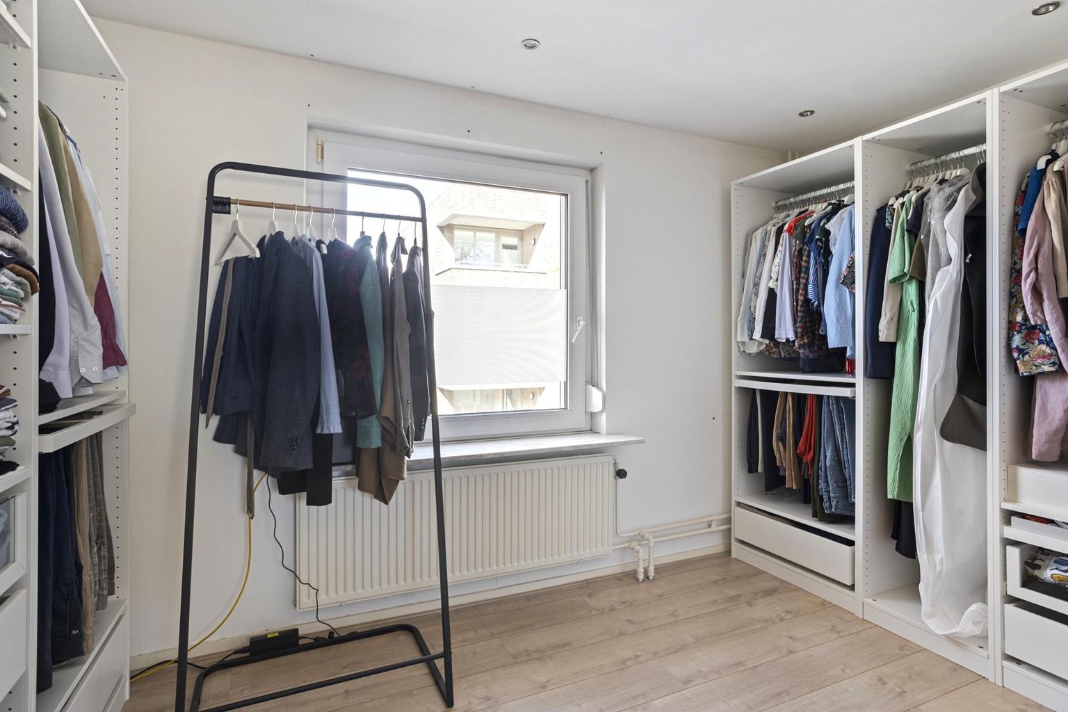 The landing provides access to two bedrooms measuring approximately 11 m² and 10 m² respectively, both of which enjoy plenty of natural light. The bedroom at the front features a practical built-in closet and is currently used as a walk-in closet. The neat, fully tiled bathroom (approx. 6 m²) is equipped with a bathtub, a separate shower, a vanity sink with cabinet, and a second toilet. A storage room has also been created in the former bathroom.