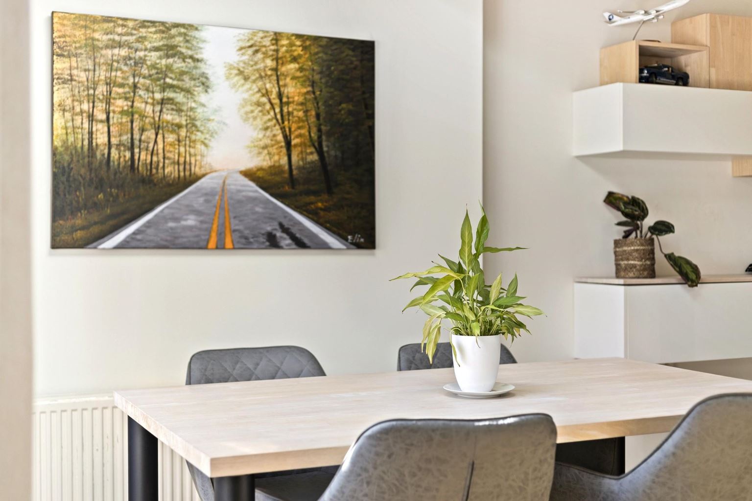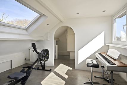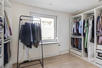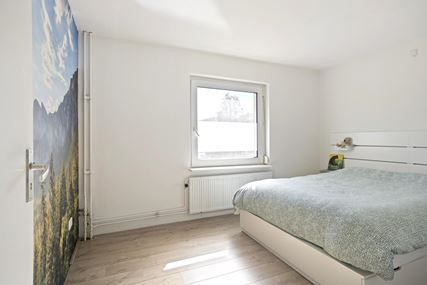 A fixed staircase leads to the second floor. Here you will find a landing with storage space and the central heating system. The third bedroom (approx. 12 m²) features sloped walls, a dormer window, and a Velux skylight, providing extra space and light.