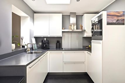 The open kitchen, measuring approximately 8 m², features a modern design and is arranged in a practical corner layout. The kitchen is equipped with various built-in appliances, including a range hood, a 4-burner induction cooktop, an oven, a dishwasher, and a refrigerator.