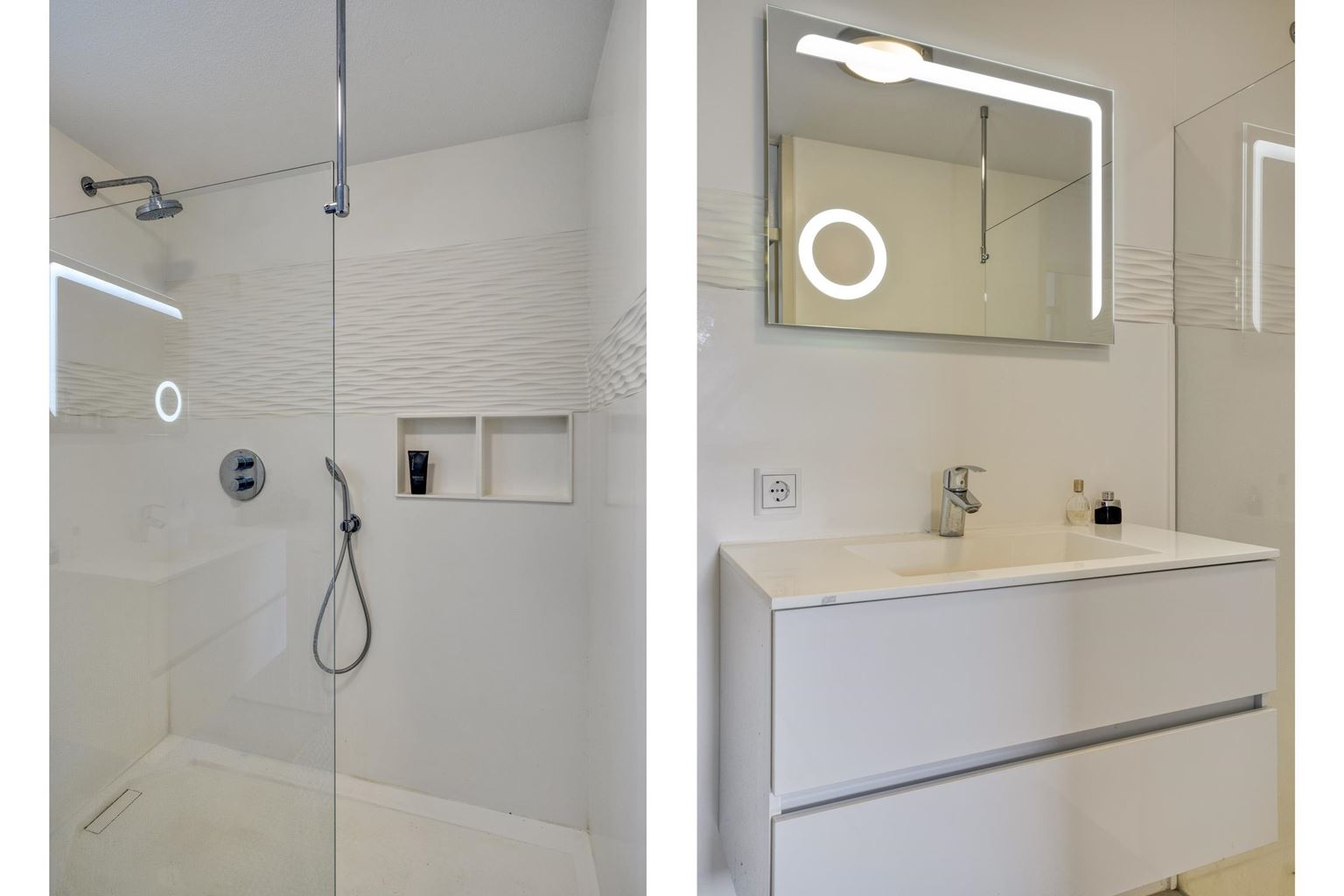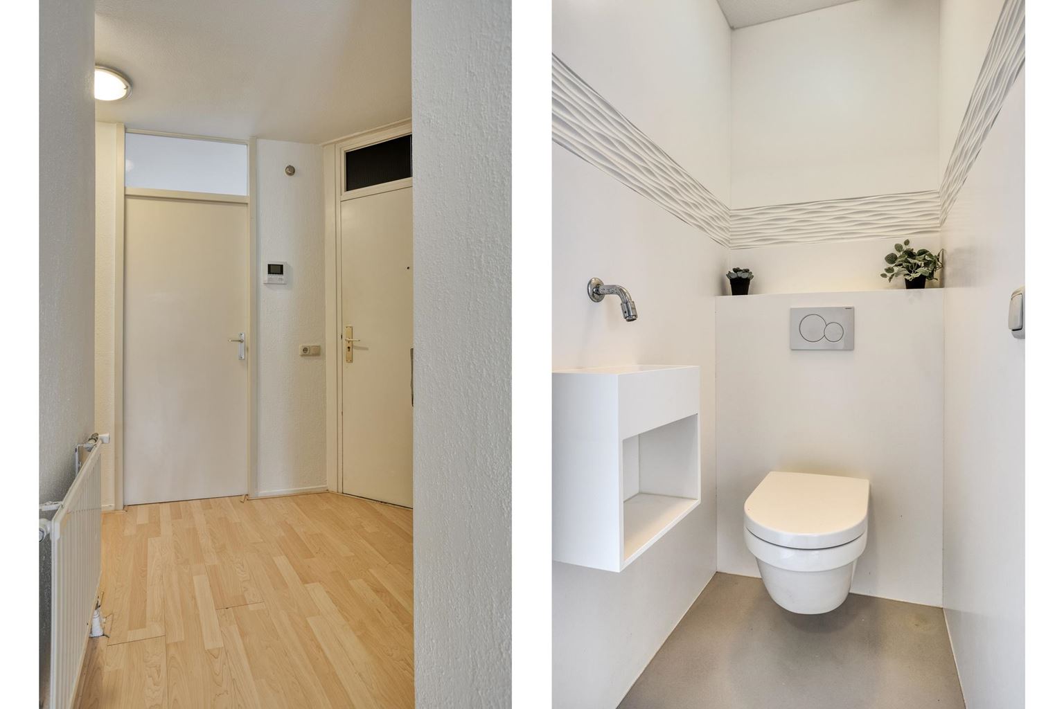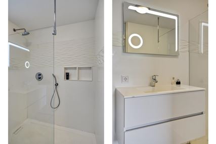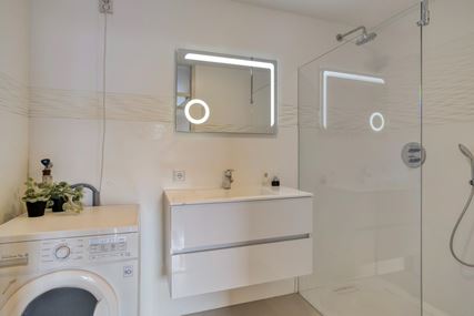 The apartment has two full-sized bedrooms of approximately 12 m² and 9 m², both fitted with laminate flooring. The toilet, renovated in 2018, is modern and equipped with a wall-mounted toilet and a small sink. The bathroom (5 m²) was also modernized that year and includes a spacious walk-in shower with rain function, a fixed washbasin with cabinet, and a washing machine connection. Additionally, underfloor heating and extra wall heating provide optimal comfort.