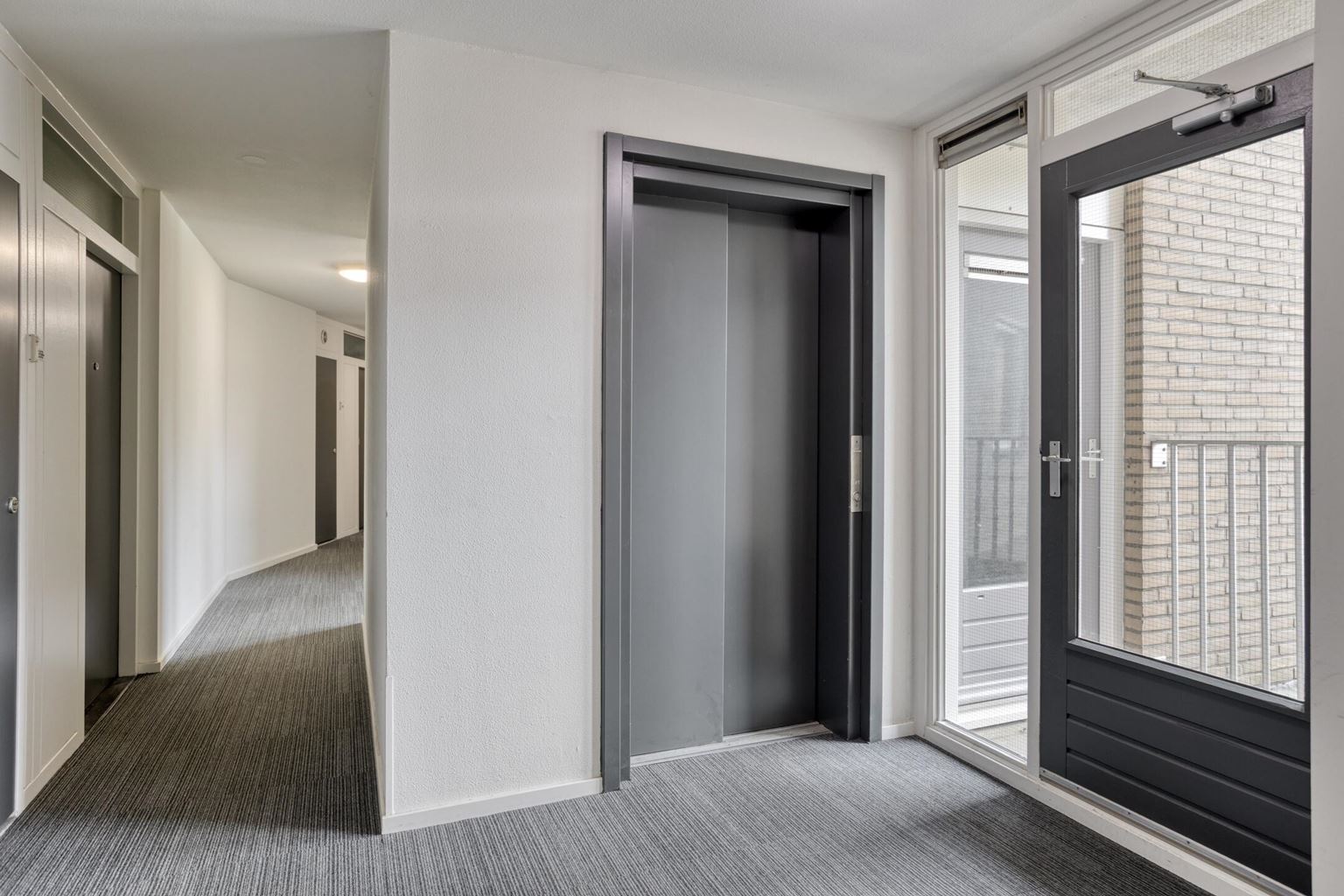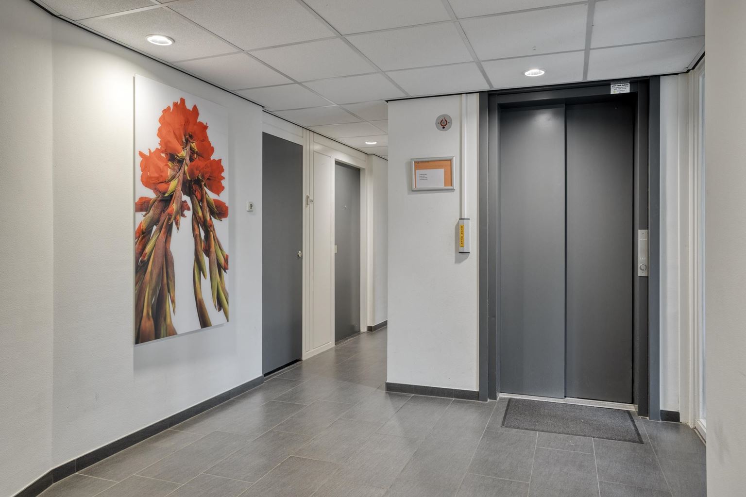 Shared entrance with doorbells, intercom system, mailboxes, staircase, and elevator. The indoor storage room of approximately 3 m² is also located here.