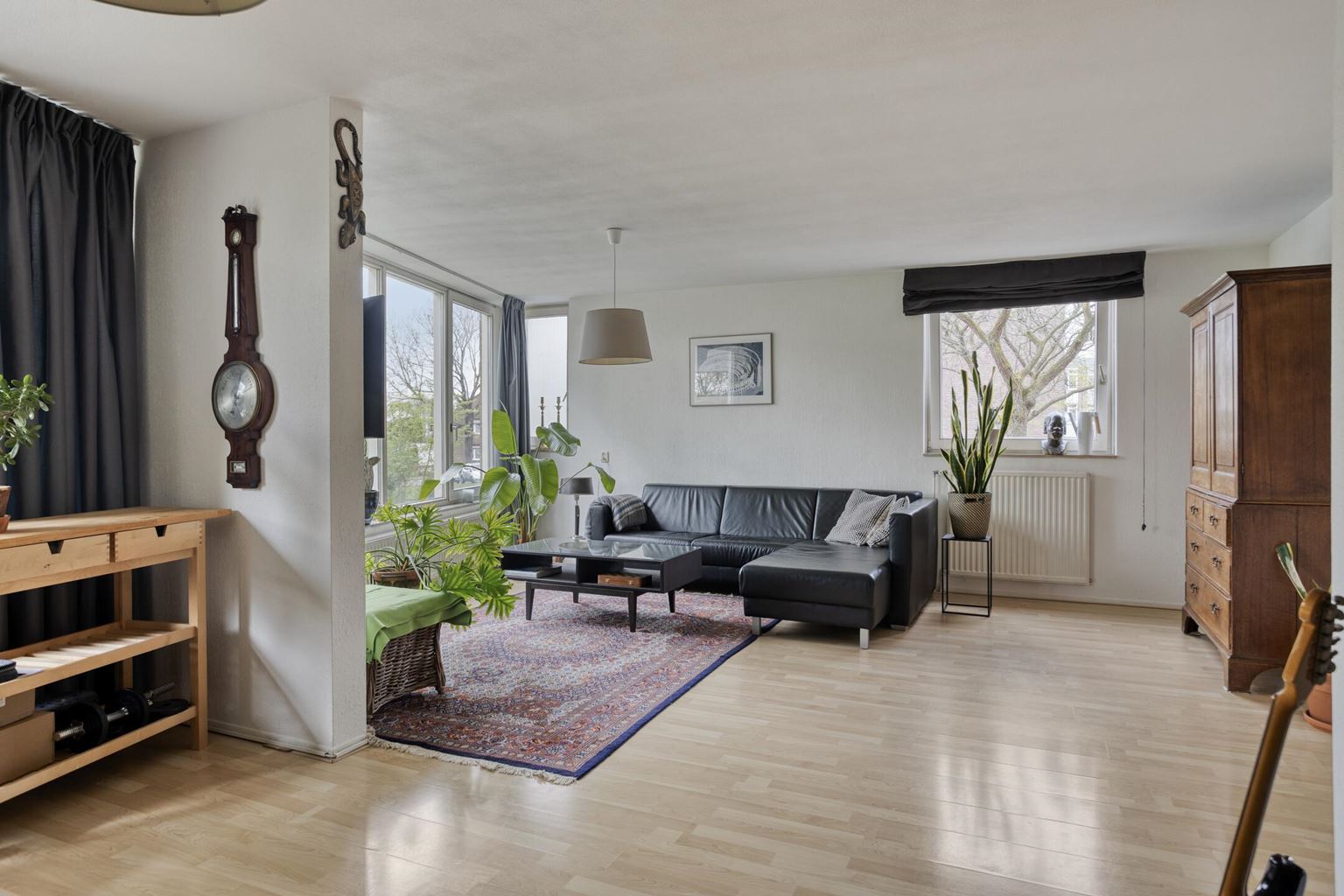 The bright and spacious living room (37 m²) is finished with a neat laminate floor and is openly connected to the semi-open kitchen. From the living room, there is direct access to the balcony (7 m²), where you can enjoy the peaceful green surroundings. The kitchen (8 m²) is practically designed in a corner layout and equipped with various appliances, including a 6-burner gas stove with extractor hood, dishwasher, refrigerator, freezer, and sink. The granite countertop gives the kitchen a well-maintained appearance.