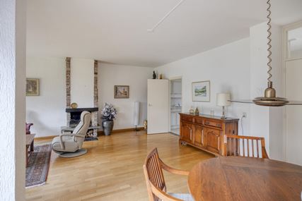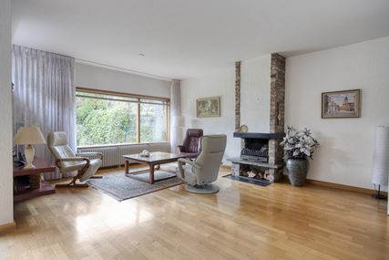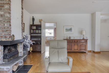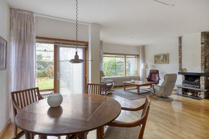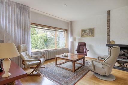 Light-filled living room (approx. 37 m²) with access to the kitchen and the garden. The living room has parquet flooring and a charming open fireplace.