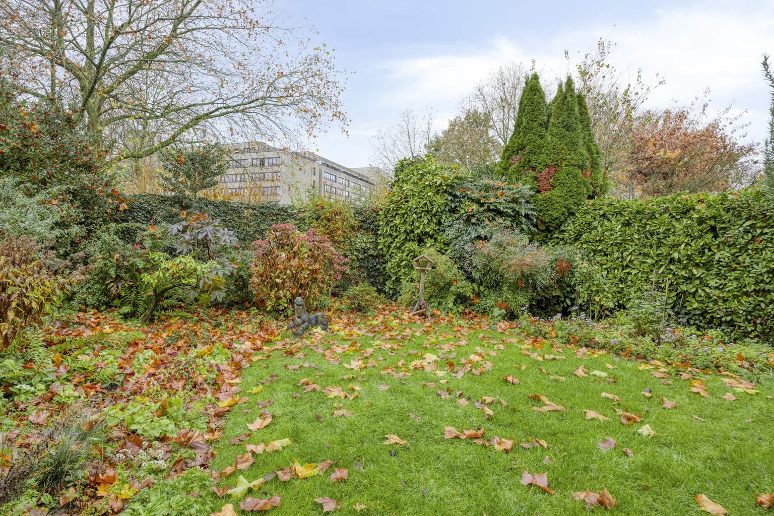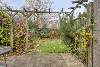 Fully enclosed backyard, facing southwest. The garden offers plenty of privacy and features a paved terrace with 2 sunshades (one of which is electrically operated), a lawn, and various mature plants. There is direct access to the garage (approx. 19 m²) from the garden, which is equipped with an electric sectional door, lighting, electricity, and laundry connections.