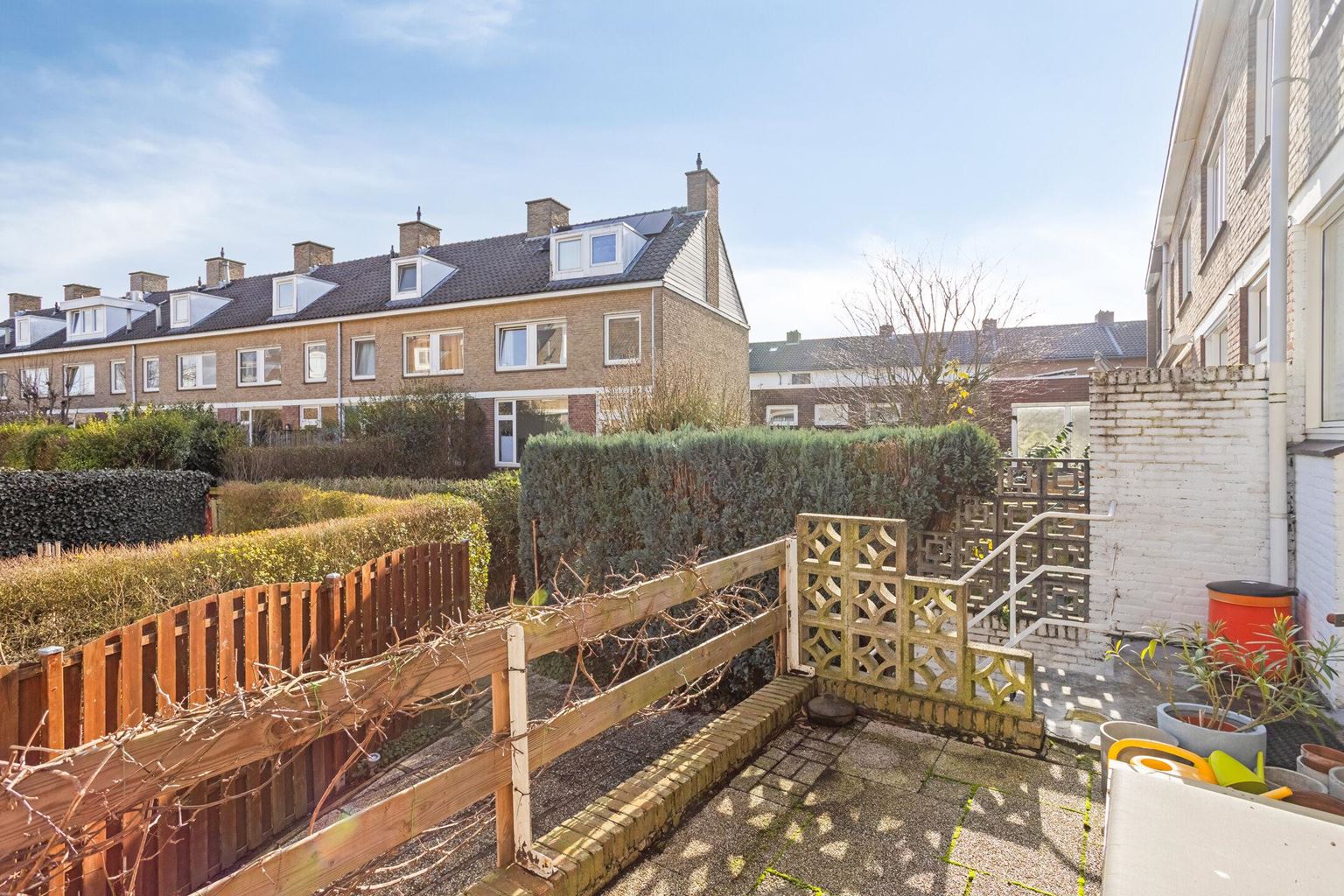The south-east facing back garden offers a practical and pleasant outdoor space and is divided into two levels. The lower part is at the level of the back entrance, which is easily accessible by bicycle and therefore ideal for storing bicycles. The higher terrace connects directly to the kitchen and is a nice place to sit and enjoy the outdoors.