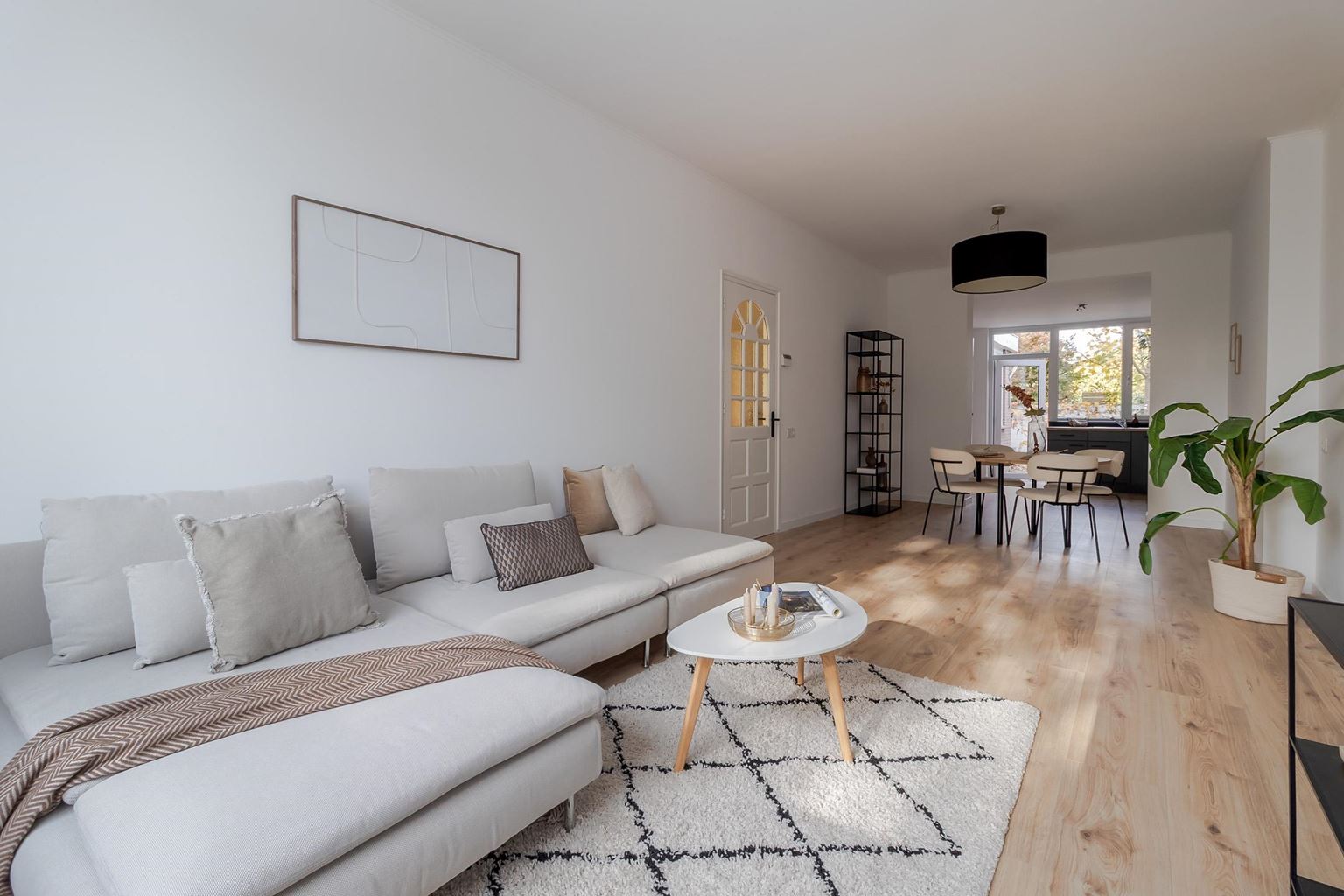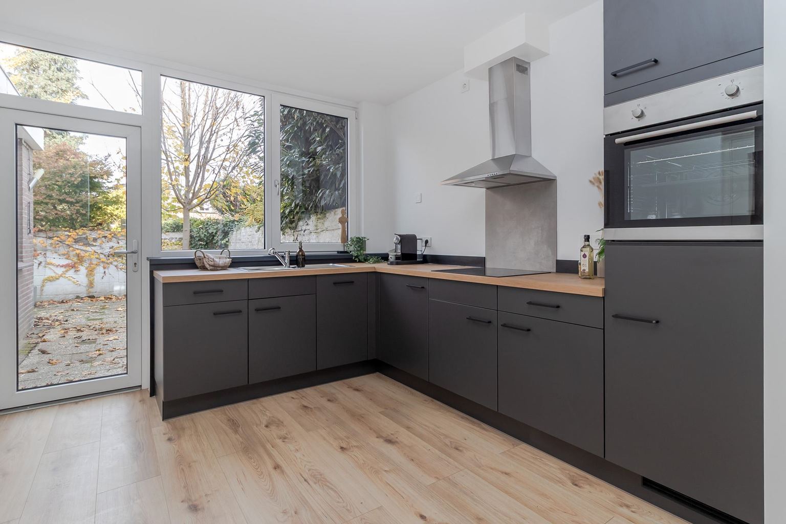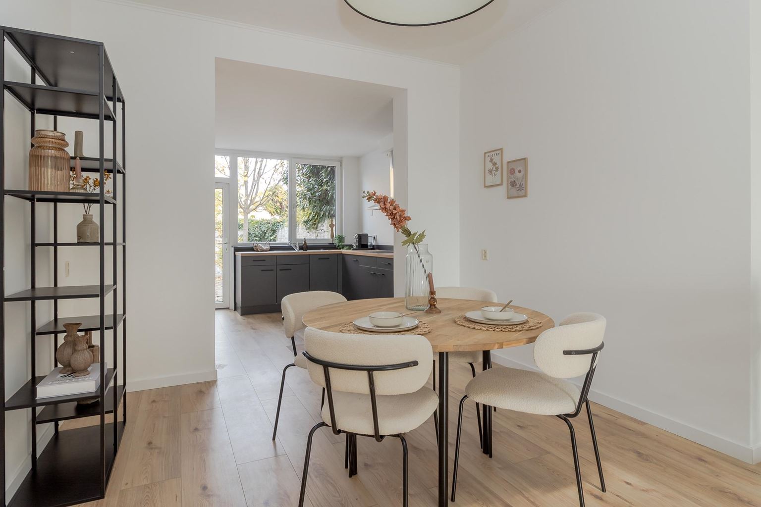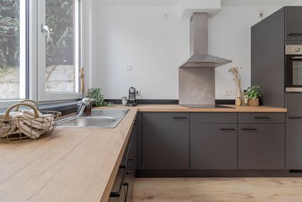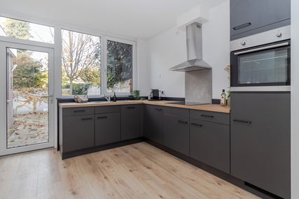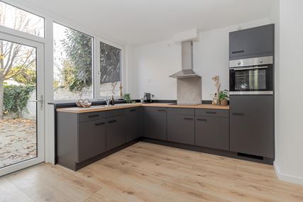 The front door opens onto the entrance hall of this modernised property. All rooms are directly accessible from the hall. The bright living room (28m²) has large windows at the front, providing pleasant natural light. Adjacent is the modern open-plan kitchen (11m²) with a corner layout, equipped with a sink, 4-burner induction hob with extractor hood, oven, dishwasher and refrigerator. The kitchen also provides access to the low-maintenance north-facing back garden.