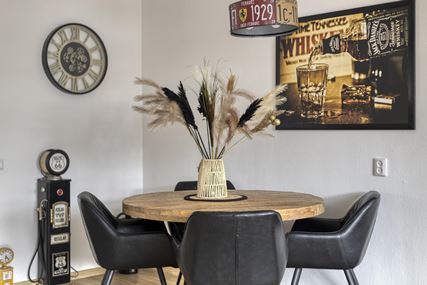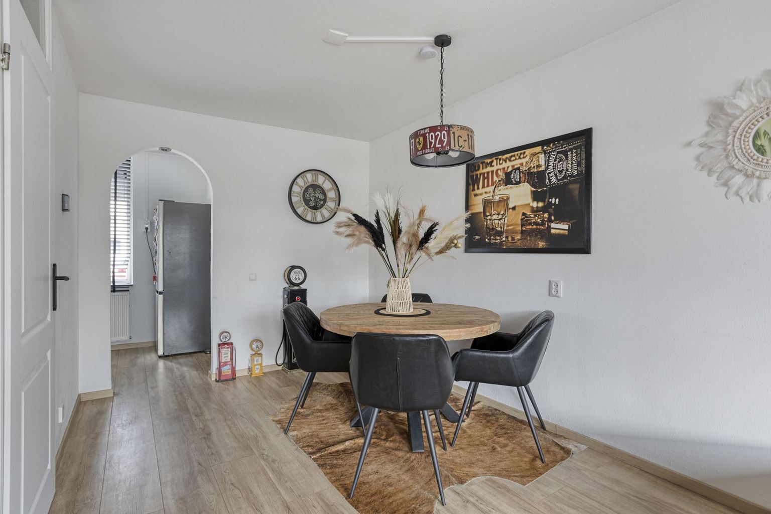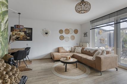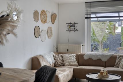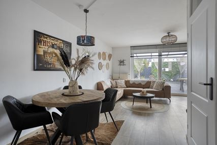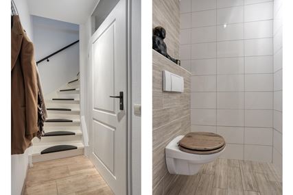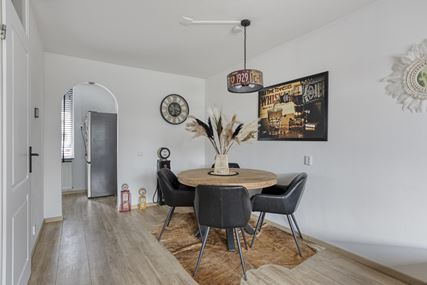 Entrance/hallway (approx. 2m²) with meter cupboard (automatic groups and smart meters) and access to the living room. Attractive L-shaped living room (approx. 26m²), with neat laminate flooring. The sitting room is located at the rear and has access to the back garden through sliding doors with insect screens. The dining area is located on the other side and provides access to the semi-open kitchen (approx. 7 m²), located at the front of the house. The kitchen has a luxury corner kitchen unit with upper and lower cabinets, drawers and the following (built-in) appliances: sink, dishwasher, 4-burner induction hob, designer extractor hood, oven and a separate fridge-freezer. The whole is neatly finished with a plastic worktop. Hallway with toilet and staircase to the first floor. The toilet (approx. 1m²) is partly tiled and equipped with a wall-mounted toilet.