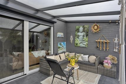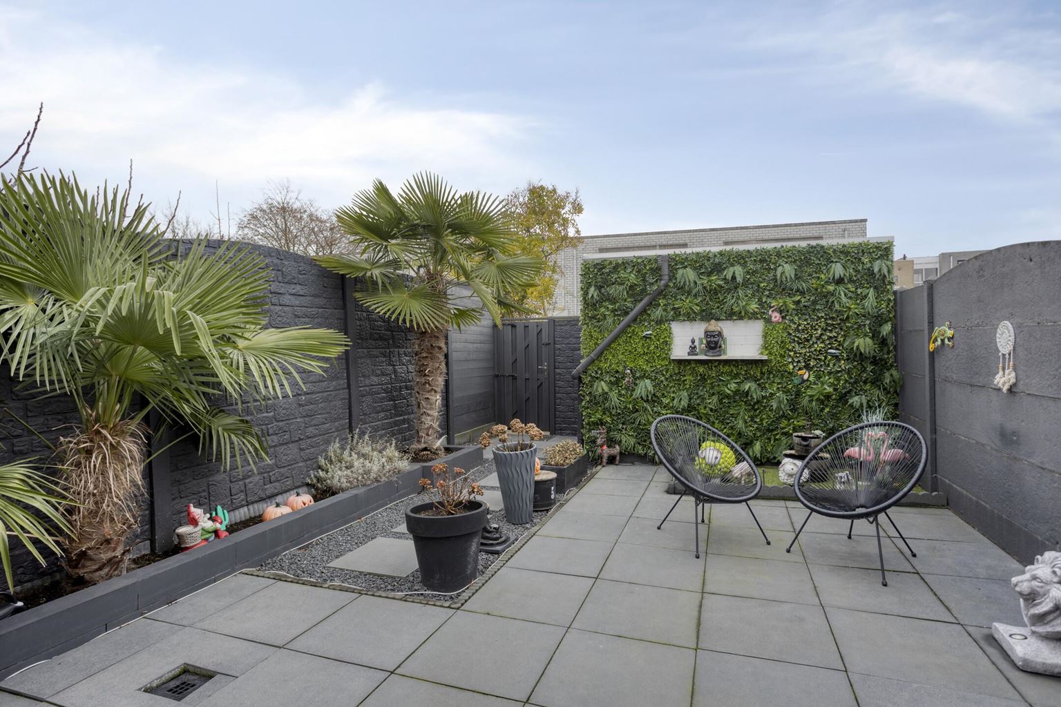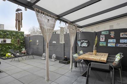 The low-maintenance back garden (approx. 50m²) faces southeast. The garden is largely tiled and also features a border with various (mature) plants, an outdoor storage shed (approx. 7m²) and a rear entrance. There is also a lovely covered terrace with built-in lighting, where you can enjoy warm summer evenings.