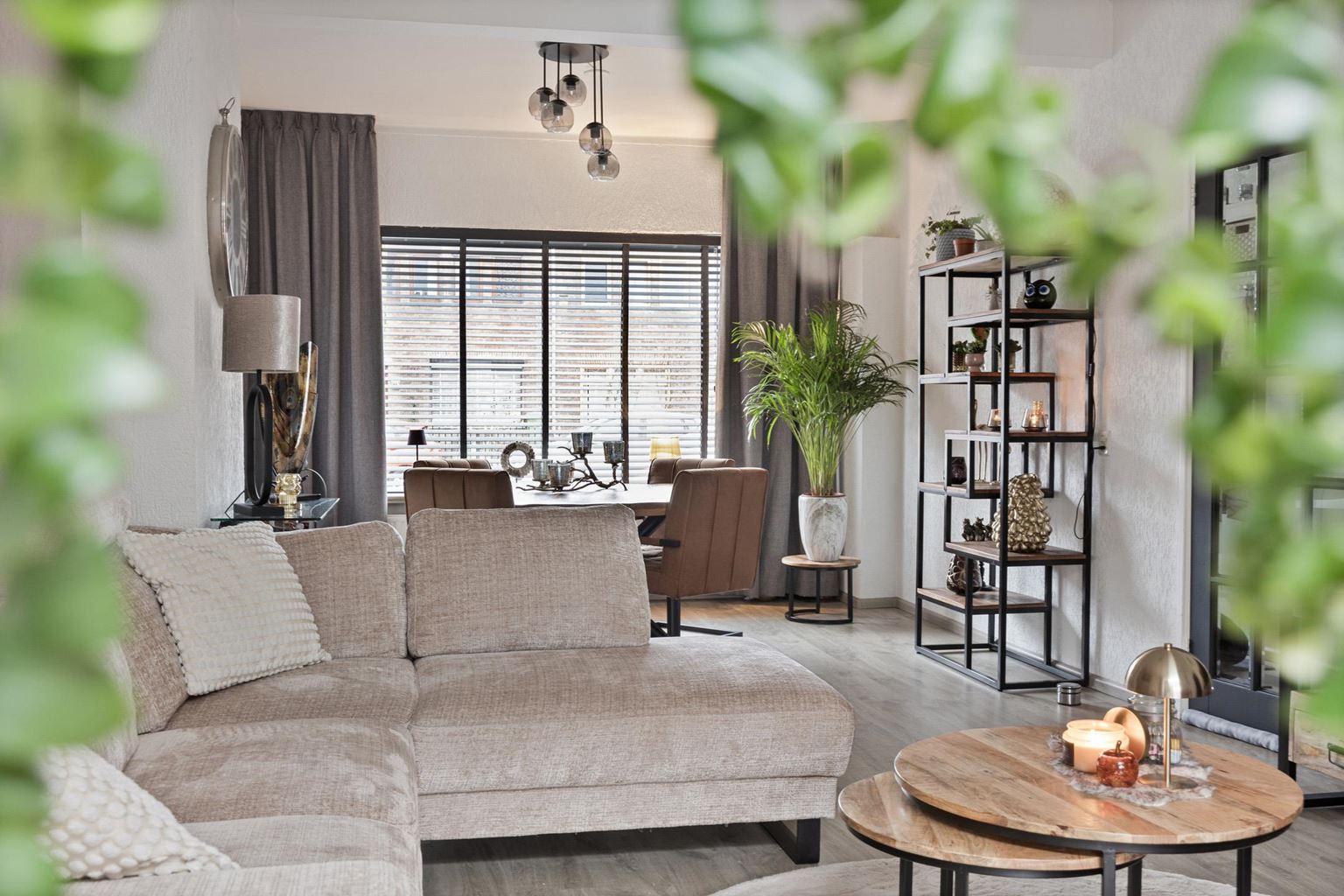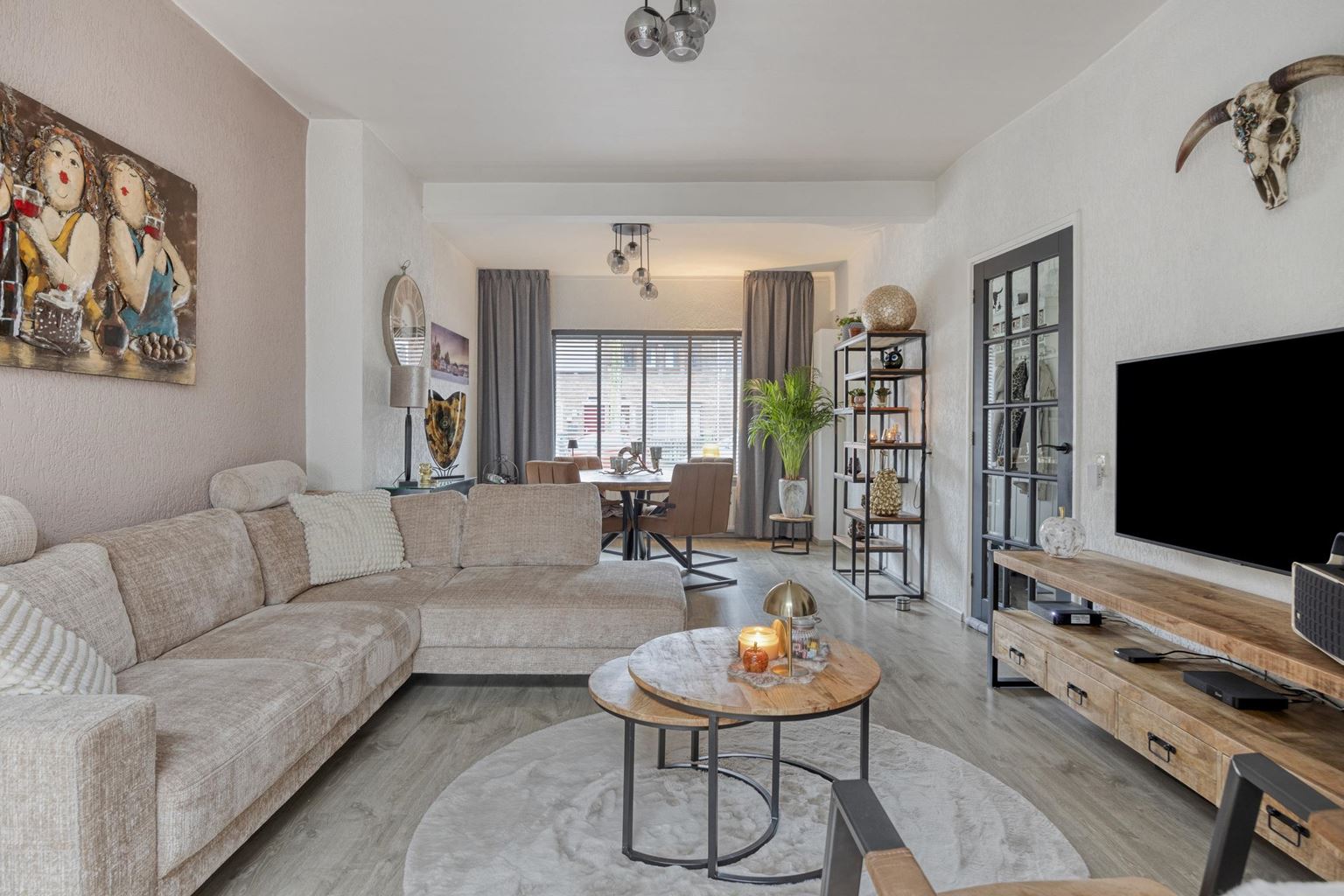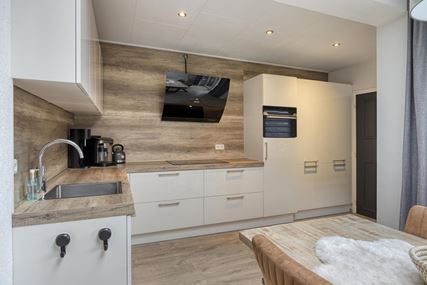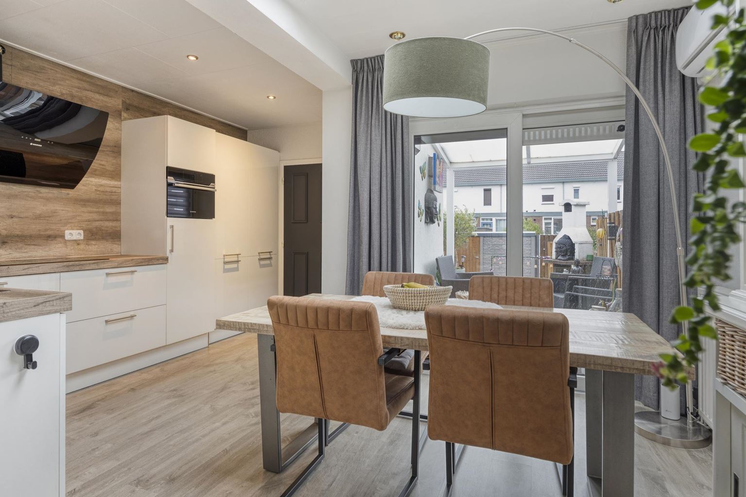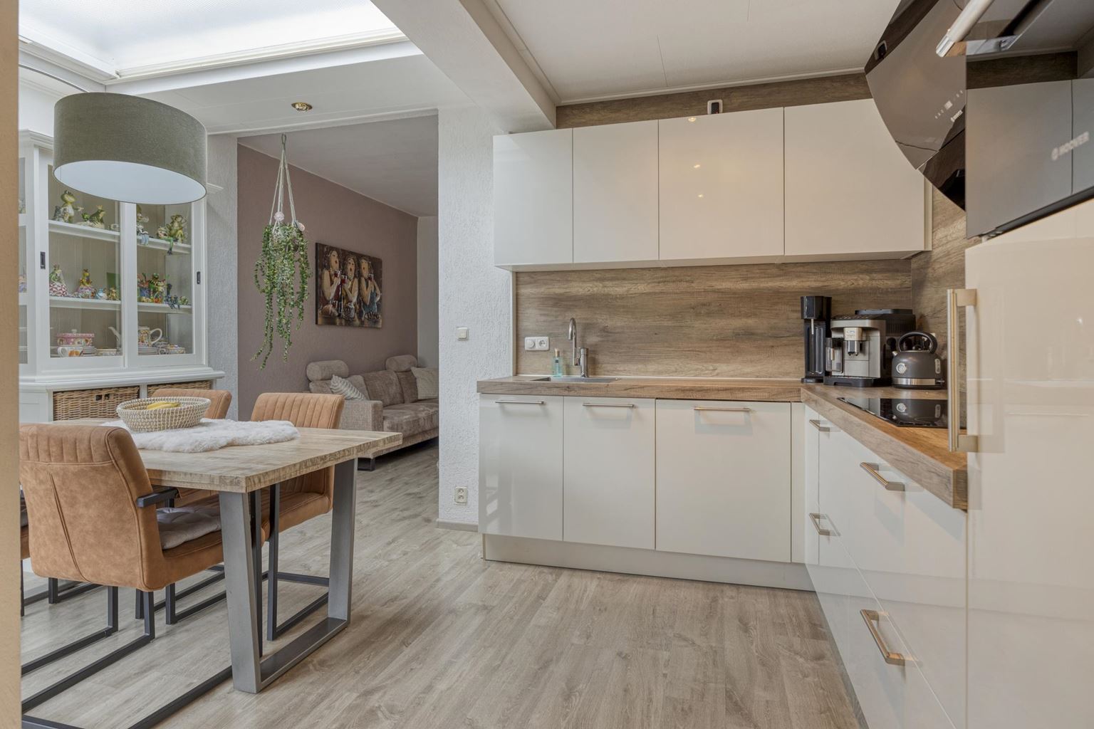 Entrance/hall with access to the living room. The spacious living room (27 m²) features laminate flooring, a fully insulated extension at the rear, air conditioning, and benefits from plenty of natural light. The luxury open-plan kitchen (16 m²), arranged in a corner layout, was renovated in 2019 and is equipped with a composite worktop and modern (built-in) appliances, including a 5-burner induction hob with designer extractor hood, sink, combination oven, dishwasher, and refrigerator.