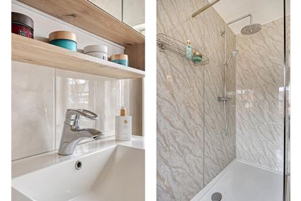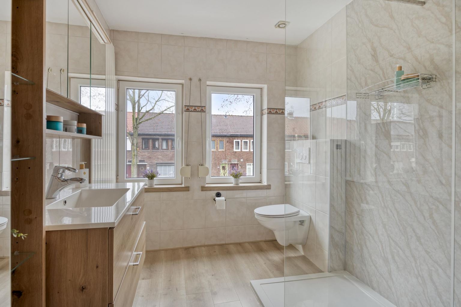 The bathroom (6 m²) was updated in 2024 and includes moisture-resistant laminate flooring, a walk-in shower with rain function, wall-hung toilet, washbasin with vanity unit, and a designer radiator. The property is equipped with mechanical ventilation, contributing to a healthy indoor climate.