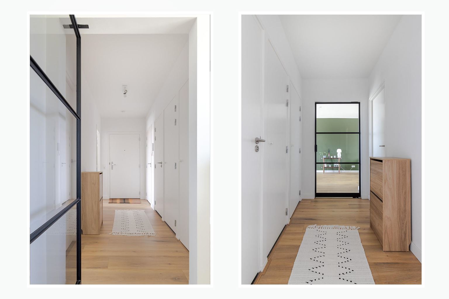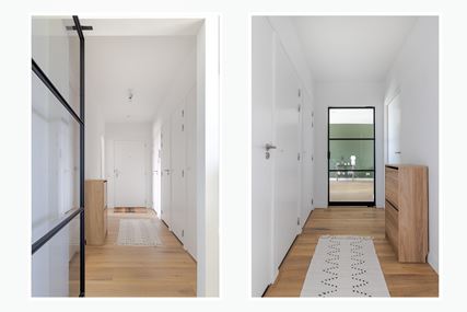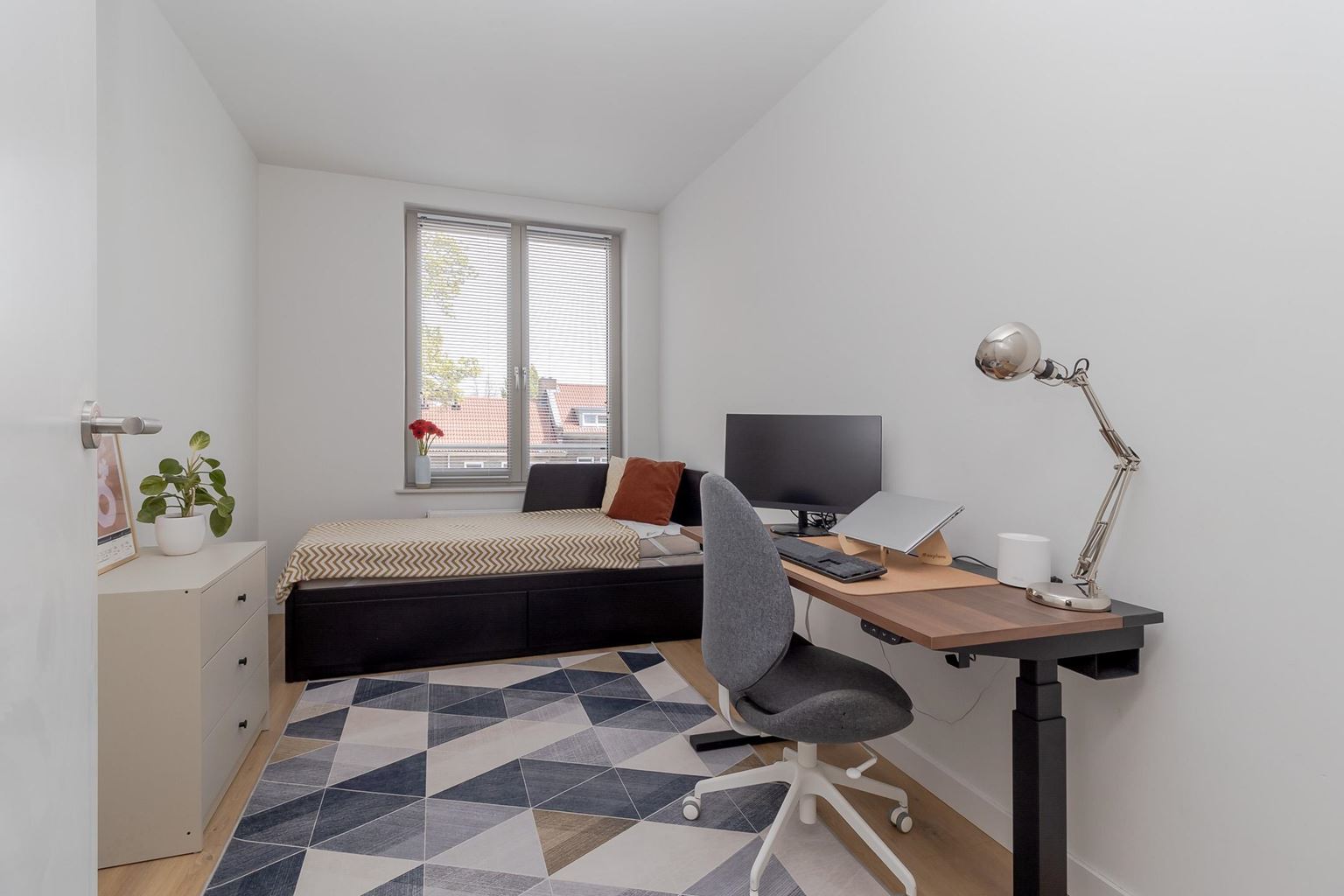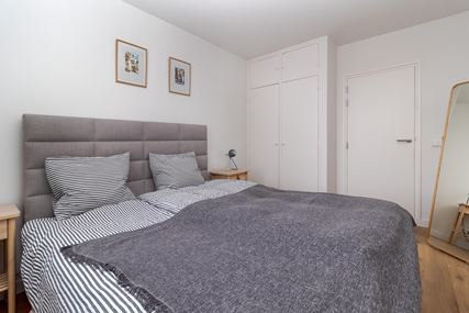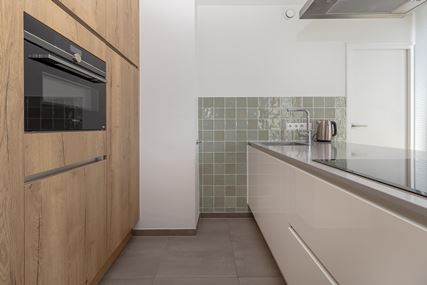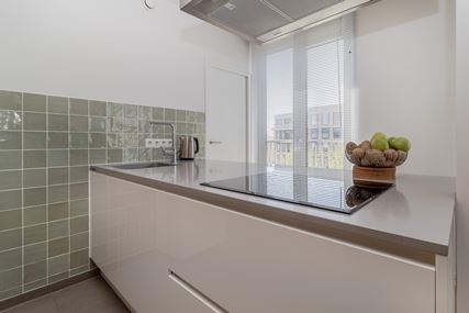 Behind the front door is a long hallway providing access to all rooms in the flat. The spacious living room (36m²) with open-plan kitchen (8m²) features large windows, allowing plenty of natural light to flood in. The front offers views of the Groene Loper, characterised by its wide, green avenues lined with large trees. At the rear, double French doors provide access to the east-facing balcony. The modern open-plan kitchen with a cooking island is fully equipped and features a 4-ring induction hob, extractor hood, oven, dishwasher and fridge-freezer, all by Siemens. Adjacent is the utility room with connections for white goods, which also serves as the technical room.