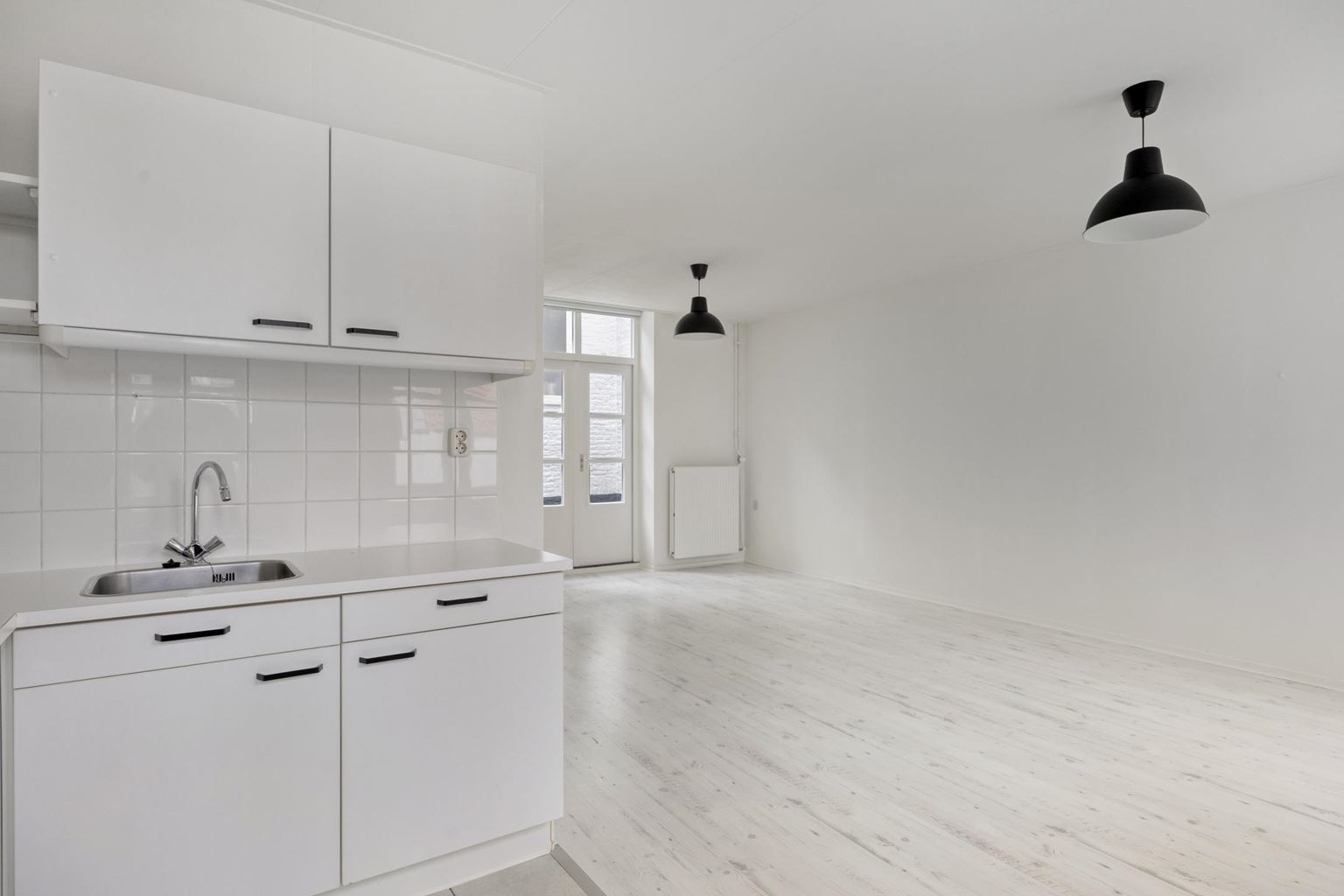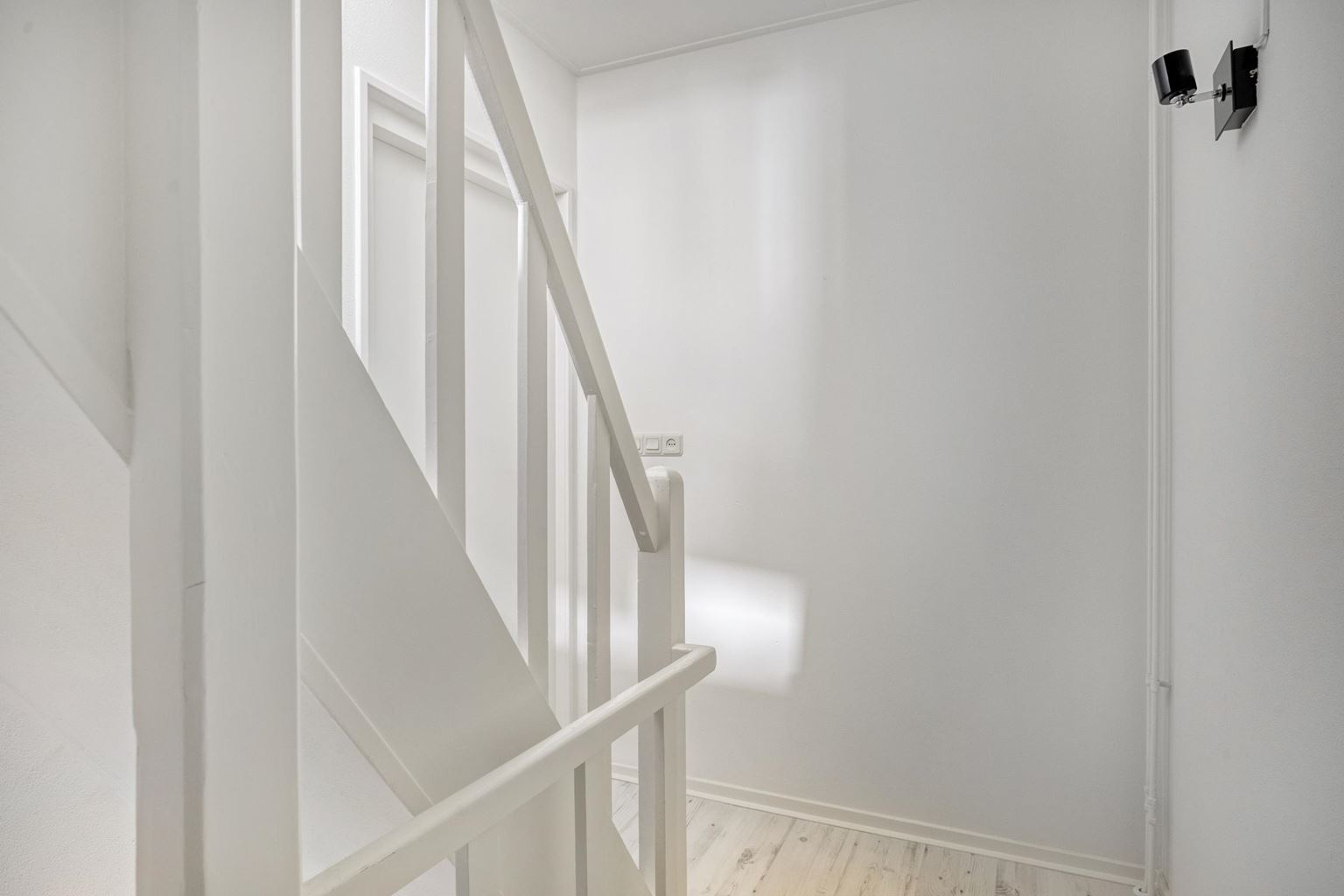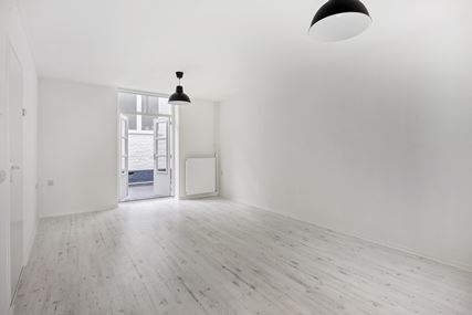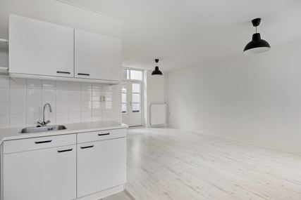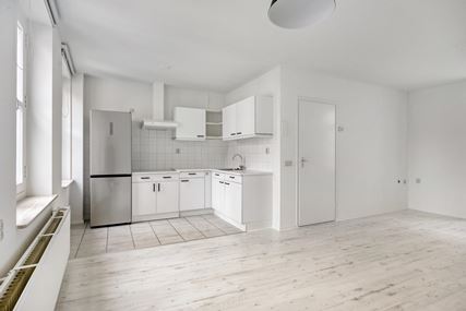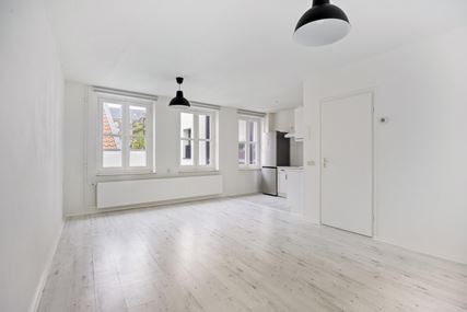 Accessible via a landing staircase, the landing (approx. 6m²) on the first floor provides access to the living room and the stairs to the second floor. Spacious, bright living room with an open-plan kitchen (total approx. 28m²). The kitchen faces the street and features a corner unit with upper and lower cabinets, a sink, extractor hood, and a separate fridge-freezer combination. The kitchen has a tiled floor, while the living room has light laminate flooring. The entire property is finished with plastered walls and a plastered ceiling. At the rear, there is access to a spacious roof terrace (approx. 17m²), where you can enjoy your private outside space in the middle the city center.