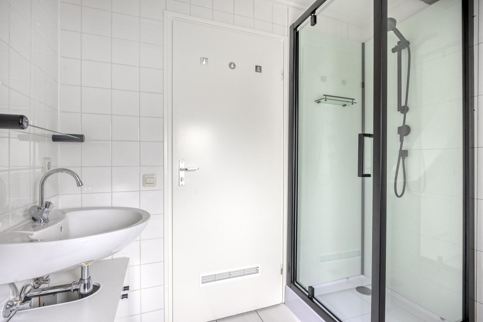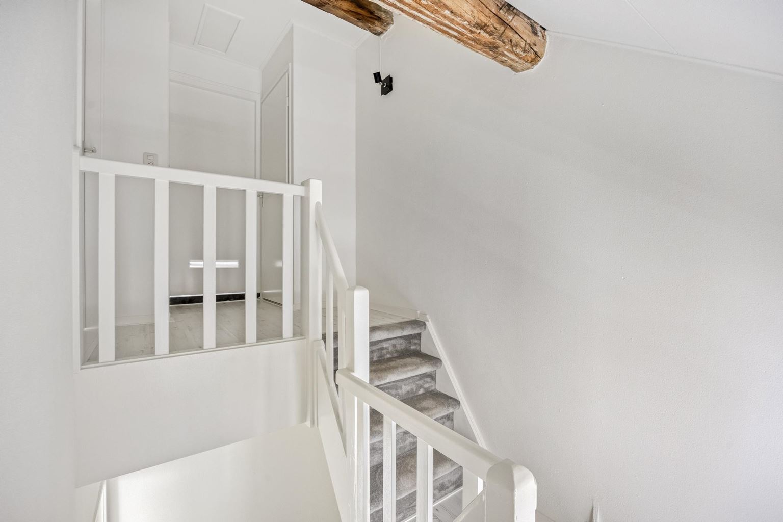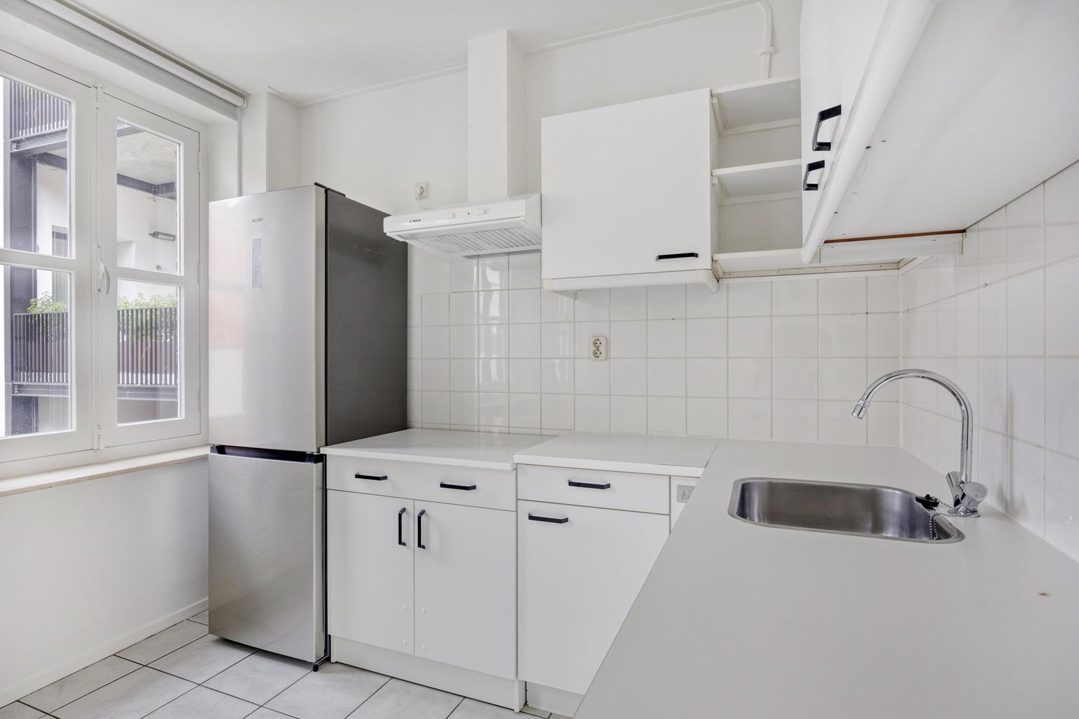 Accessible via a landing staircase, the landing (approx. 6m²) on the first floor provides access to the living room and the stairs to the second floor. Spacious, bright living room with an open-plan kitchen (total approx. 28m²). The kitchen faces the street and features a corner unit with upper and lower cabinets, a sink, extractor hood, and a separate fridge-freezer combination. The kitchen has a tiled floor, while the living room has light laminate flooring. The entire property is finished with plastered walls and a plastered ceiling. At the rear, there is access to a spacious roof terrace (approx. 17m²), where you can enjoy your private outside space in the middle the city center.