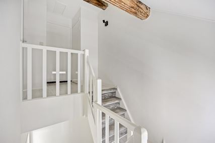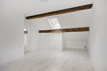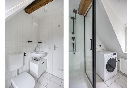 Accessible via a staircase, the second-floor landing (approx. 6.5m²) features a storage cupboard, boiler room, and access to the bathroom and bedroom. The boiler room houses the central heating boiler (brand: Remeha-Tzerra ACE HR Combi, 39C CW5 60/100, rented and built in 2020). The bathroom (approx. 5m²) is fully tiled and equipped with a toilet, a washbasin, a shower unit, and connections for laundry appliances. Above the bathroom/landing is a small attic for storage purposes. The spacious bedroom (approx. 18m²) features a dormer window at the front and a Velux skylight window at the rear. The original wooden beams are still preserved and visible, adding to the bedroom's charm. There is also a built-in sliding door cupboard for storing belongings.
