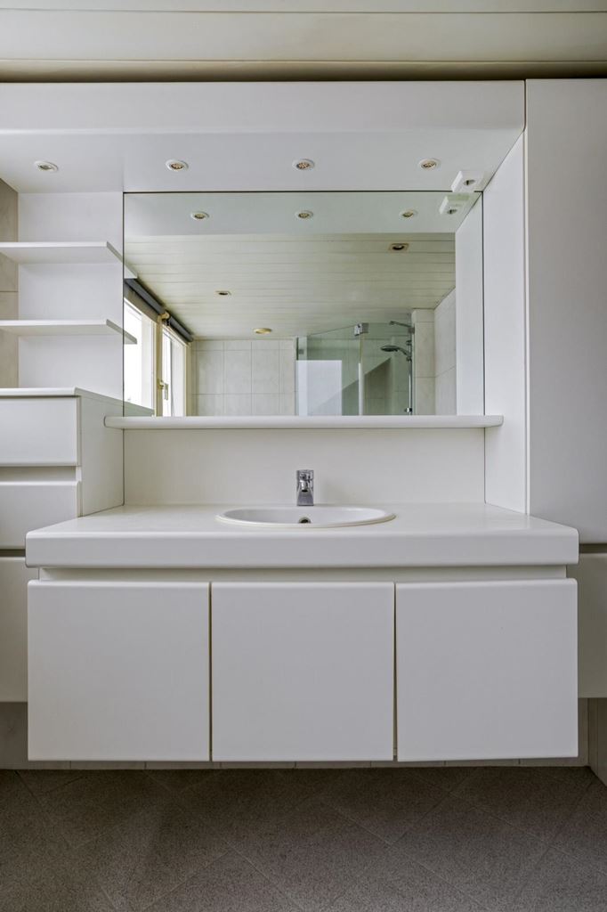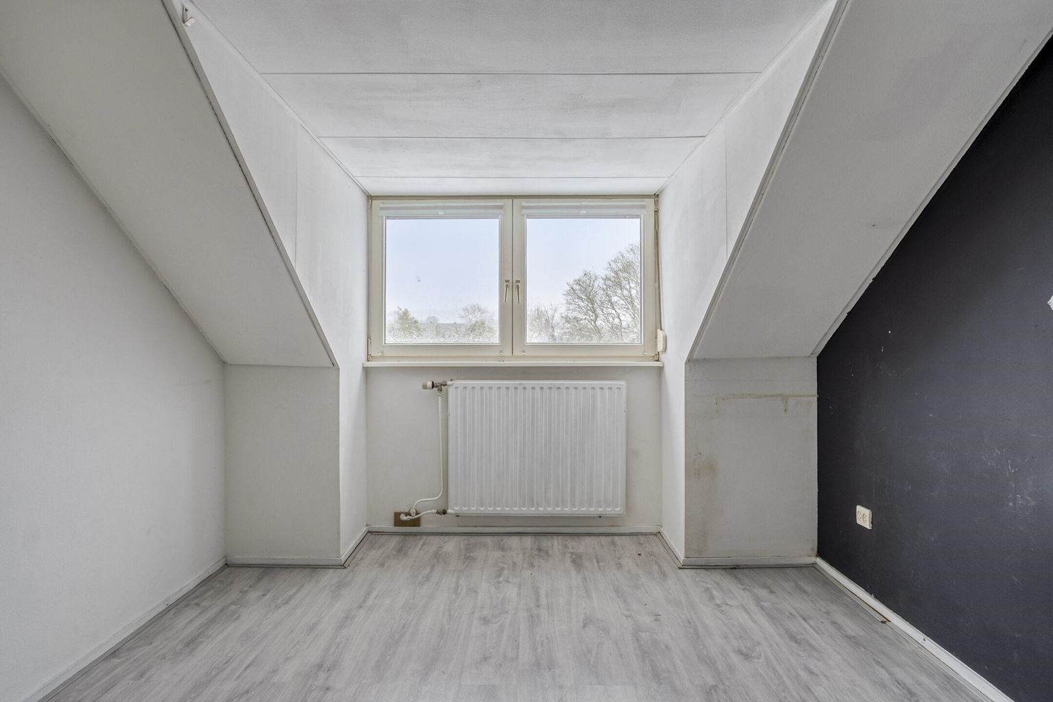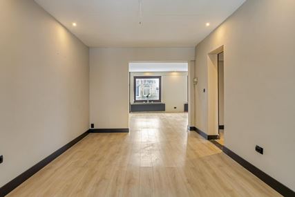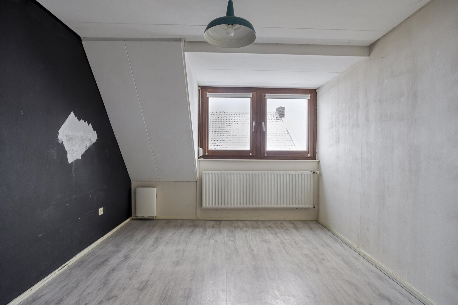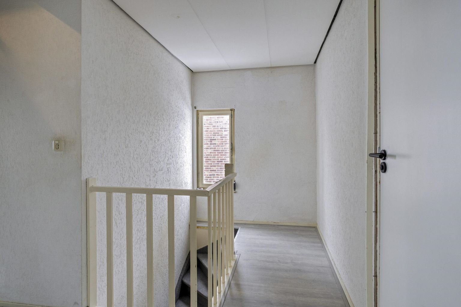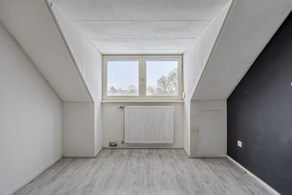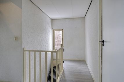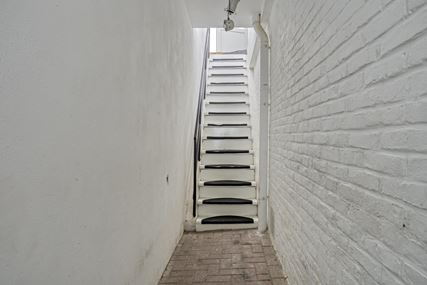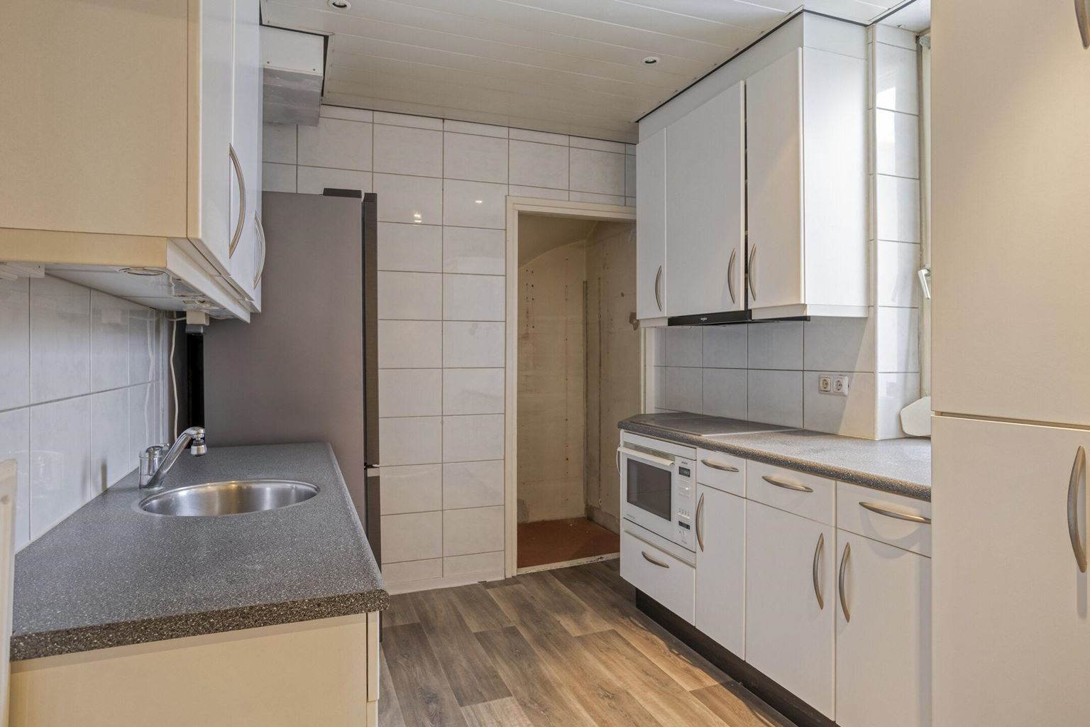 The upstairs flat is accessible via a closed staircase and immediately stands out for its very spacious layout. On the first floor, there is a particularly spacious living room that forms the heart of the home. Its size and open layout provide ample space for a comfortable sitting area, and the floor also offers excellent opportunities for creating a large open kitchen. The available space allows for various layout options, suitable for both modern and classic living concepts. The current kitchen is a closed variant with simple appliances, including a combination microwave, ceramic hob, extractor hood and sink. At the rear of this floor is a spacious, bright room that is directly connected to the roof terrace via sliding doors. This space benefits from plenty of daylight and forms a pleasant extension of the living area. The roof terrace offers a pleasant outdoor space with privacy.