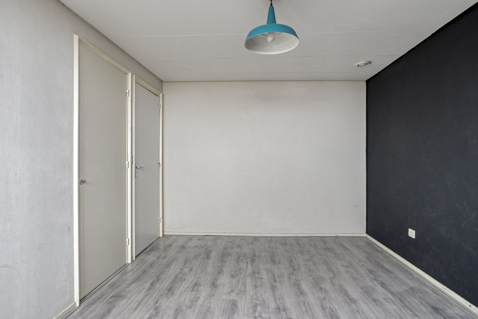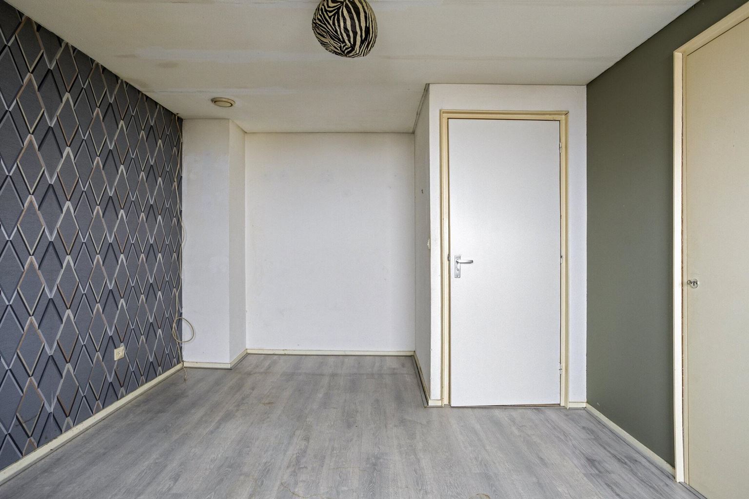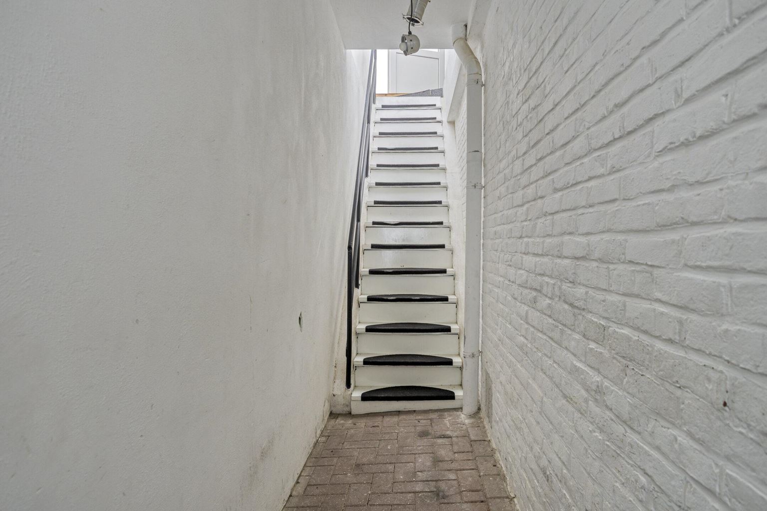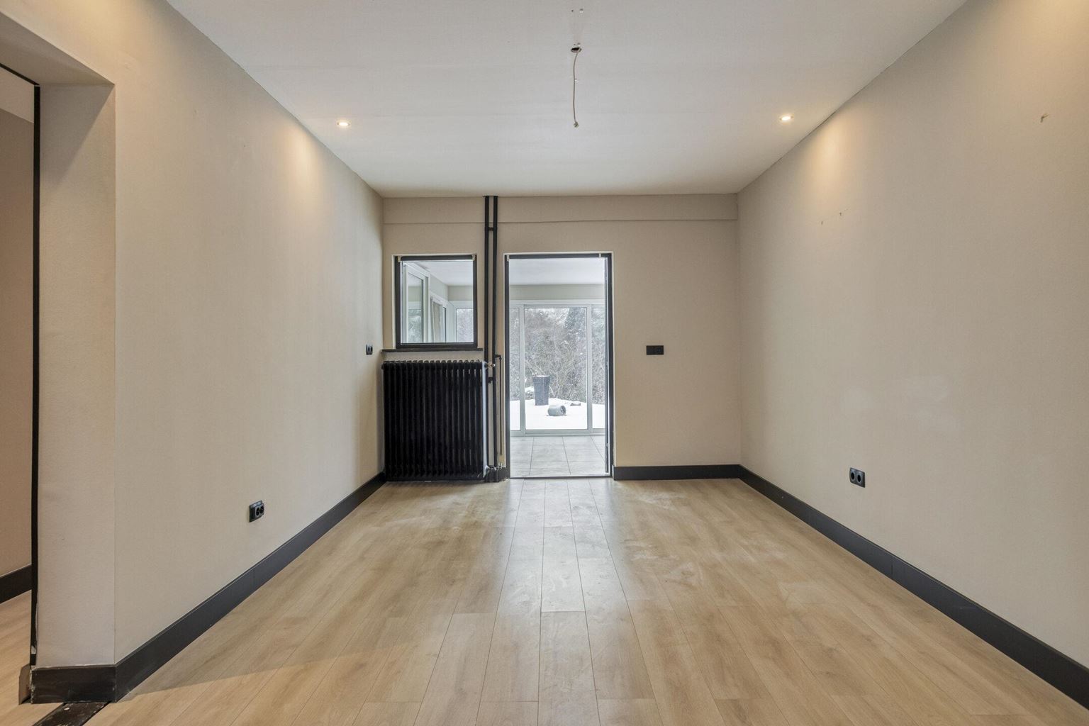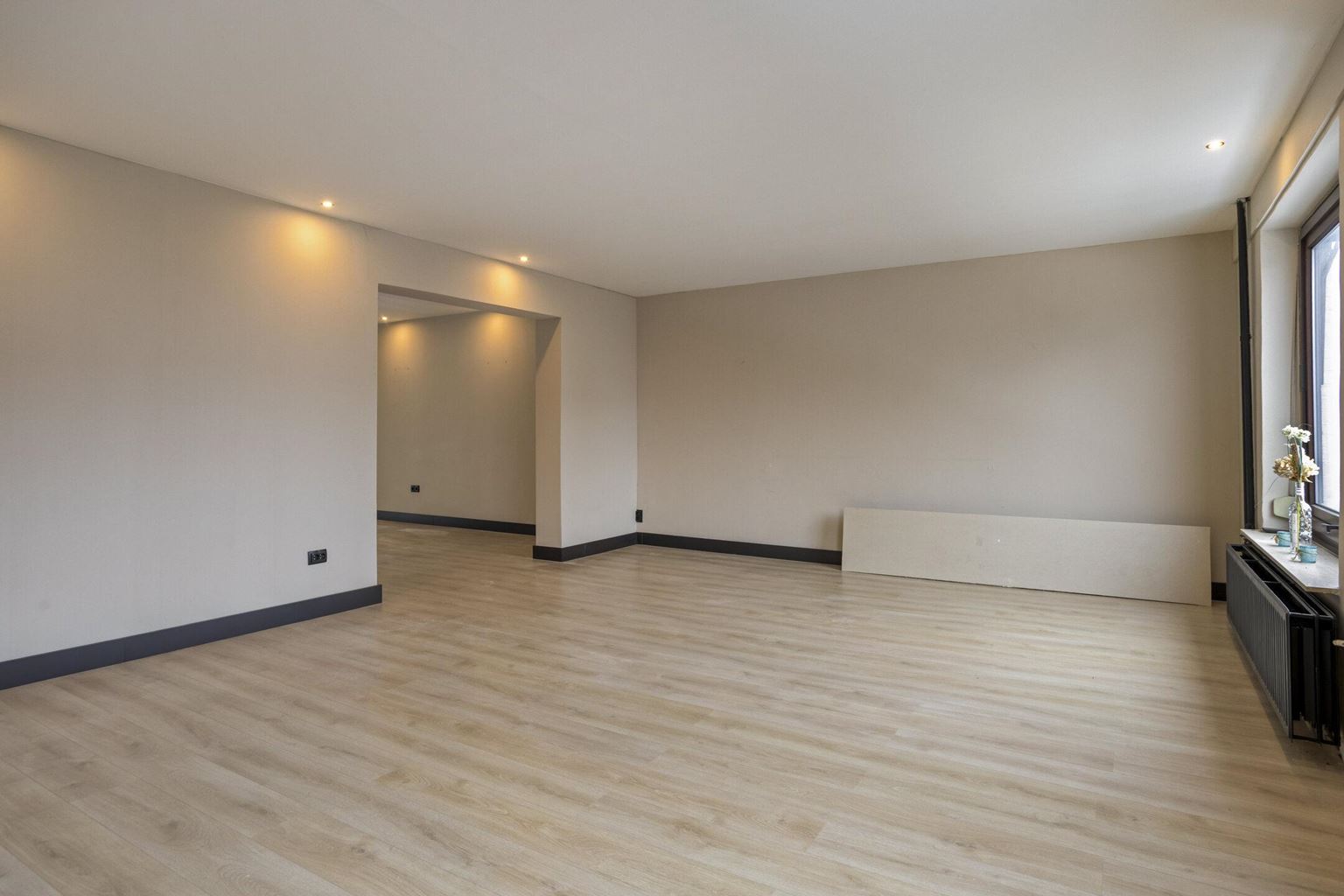 The upstairs flat is accessible via a closed staircase and immediately stands out for its very spacious layout. On the first floor, there is a particularly spacious living room that forms the heart of the home. Its size and open layout provide ample space for a comfortable sitting area, and the floor also offers excellent opportunities for creating a large open kitchen. The available space allows for various layout options, suitable for both modern and classic living concepts. The current kitchen is a closed variant with simple appliances, including a combination microwave, ceramic hob, extractor hood and sink. At the rear of this floor is a spacious, bright room that is directly connected to the roof terrace via sliding doors. This space benefits from plenty of daylight and forms a pleasant extension of the living area. The roof terrace offers a pleasant outdoor space with privacy.