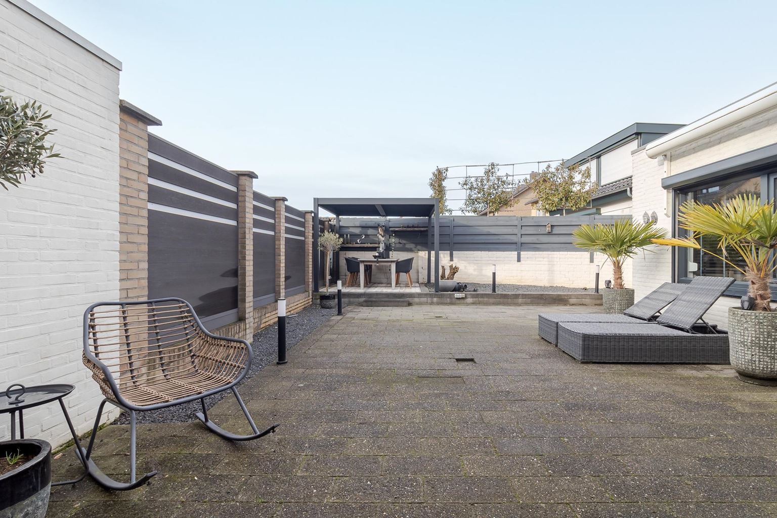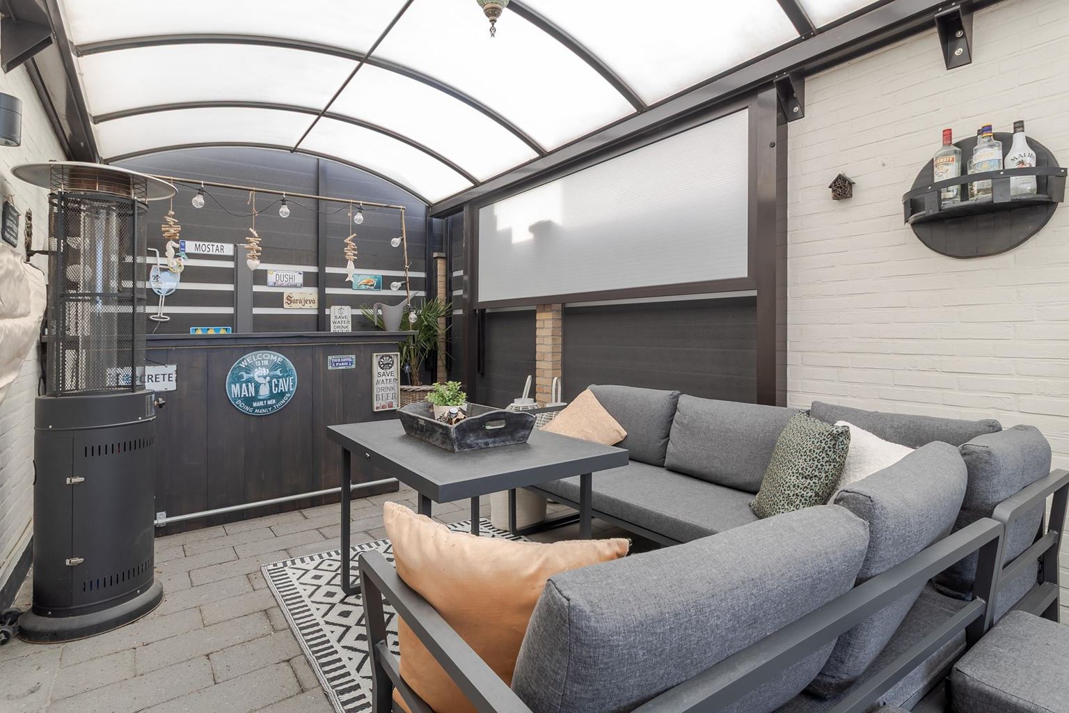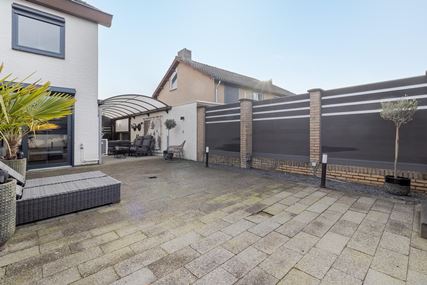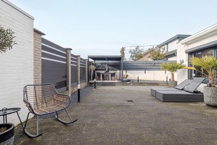 The west-facing back garden is fully tiled and laid out to be low-maintenance. Here you can enjoy the afternoon and evening sun to the fullest. The garden features an attractive pergola and a spacious canopy, under which you will find a cozy man cave, the perfect place to relax. From the back garden, you also have direct access to the garage, providing extra convenience and practical storage space.