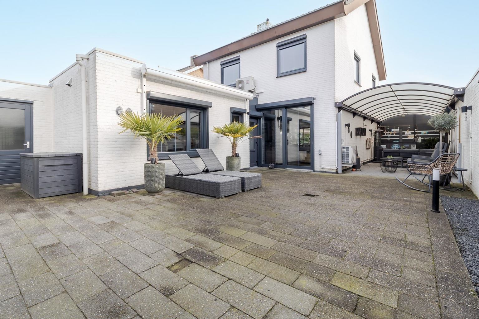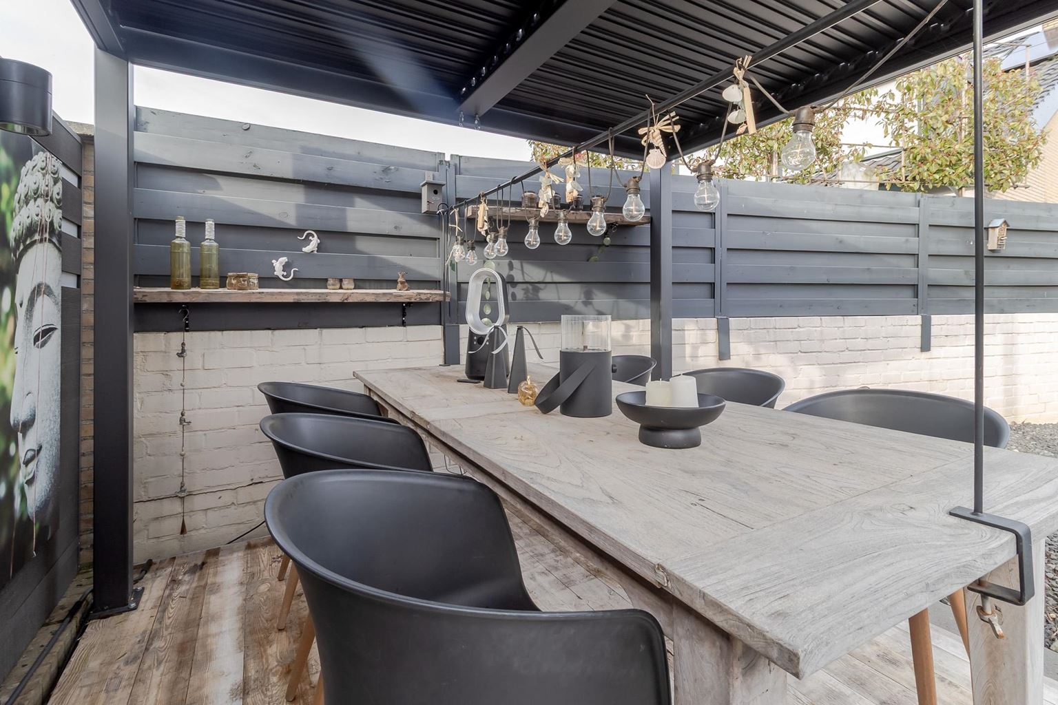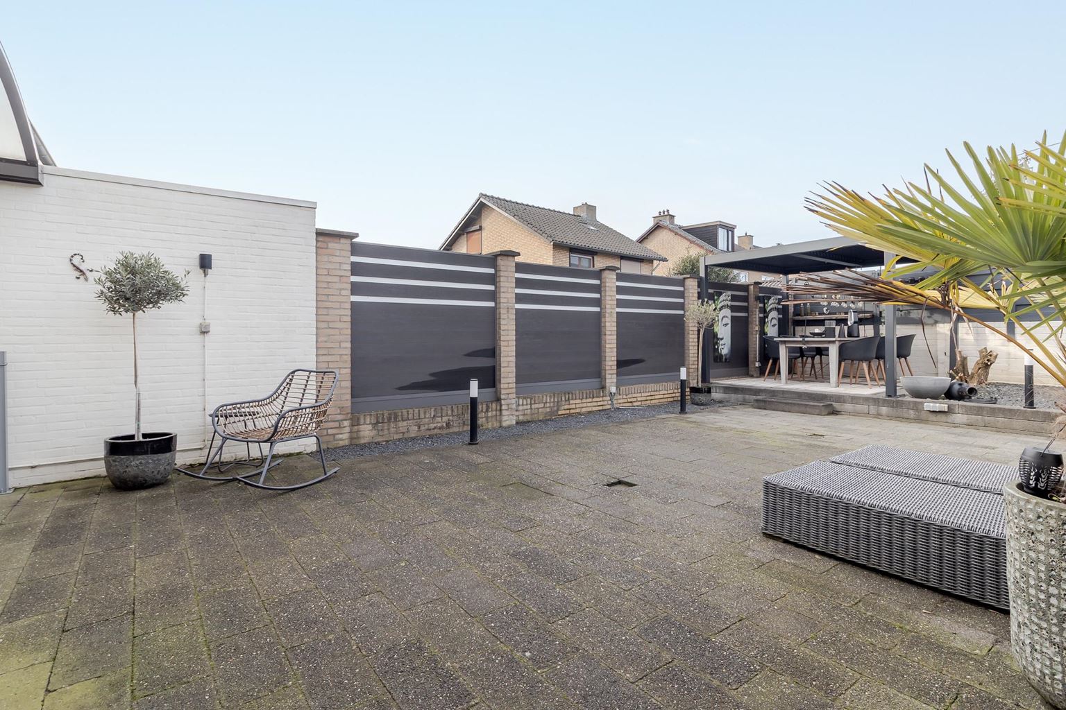 The west-facing back garden is fully tiled and laid out to be low-maintenance. Here you can enjoy the afternoon and evening sun to the fullest. The garden features an attractive pergola and a spacious canopy, under which you will find a cozy man cave, the perfect place to relax. From the back garden, you also have direct access to the garage, providing extra convenience and practical storage space.