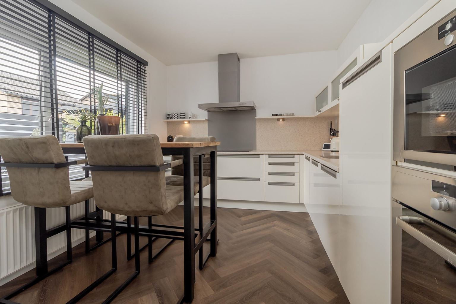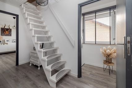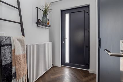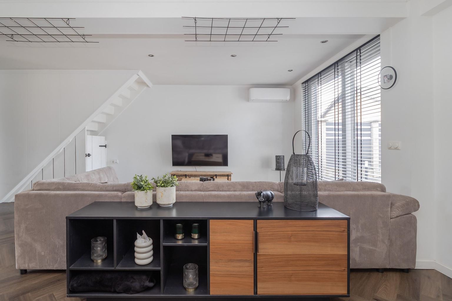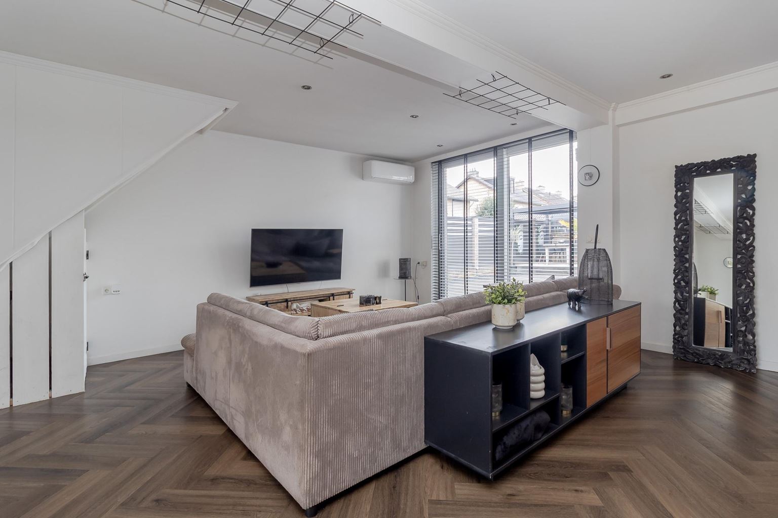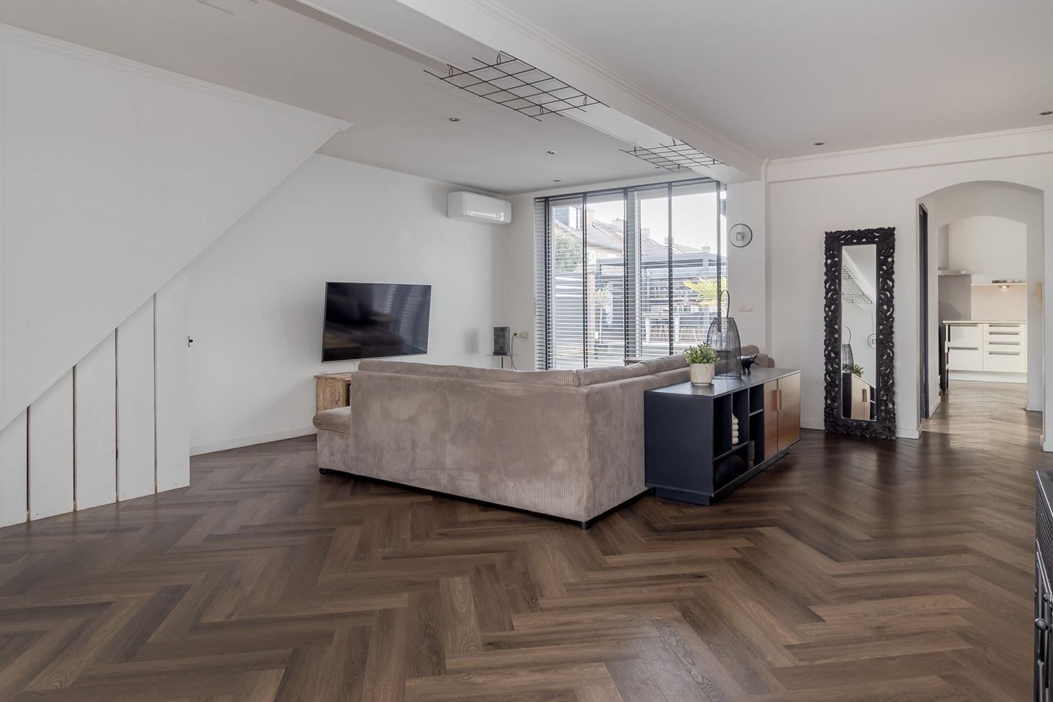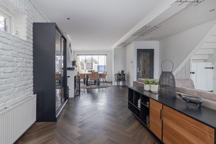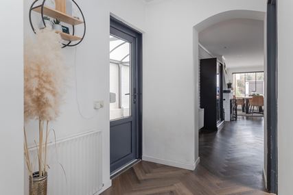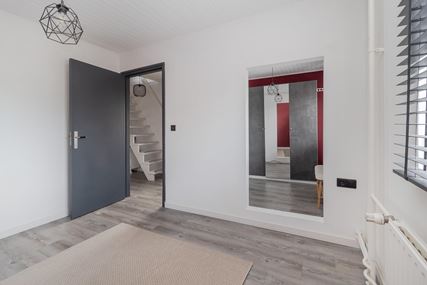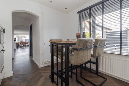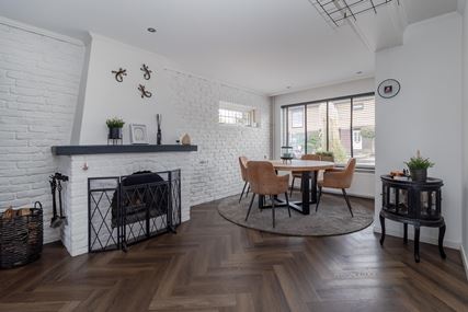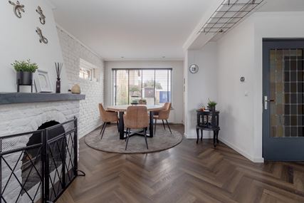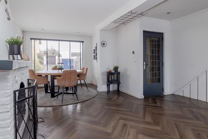 You enter the house through the entrance hall (approx. 6m²). Here you will find the cloakroom, the meter cupboard, and the staircase to the first floor. From the hall, you have access to the cozy living room. The spacious living room (approx. 42 m²) has a cozy fireplace, air conditioning, and sliding doors to the backyard, creating a pleasant transition between indoors and outdoors and allowing you to enjoy plenty of natural light. From the living room, you reach a hallway where the toilet is located, equipped with a standing toilet and a washbasin. From this hallway, you also have access to both the driveway and the backyard, which provides extra practical ease of use. At the rear of the house is the closed kitchen. The kitchen (approx. 11m²) is equipped with a wall-mounted kitchen unit with base cabinets and a plastic worktop. The following built-in appliances are included: an Atag 4-burner induction hob with Atag stainless steel extractor hood, dishwasher, tall refrigerator, microwave, and oven. The entire ground floor, with the exception of the toilet, has stylish PVC flooring in a Hungarian point pattern, which creates a luxurious and warm atmosphere. Both the living room and the kitchen have sleek stretch ceilings, giving the whole space a modern and well-maintained look.