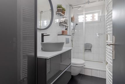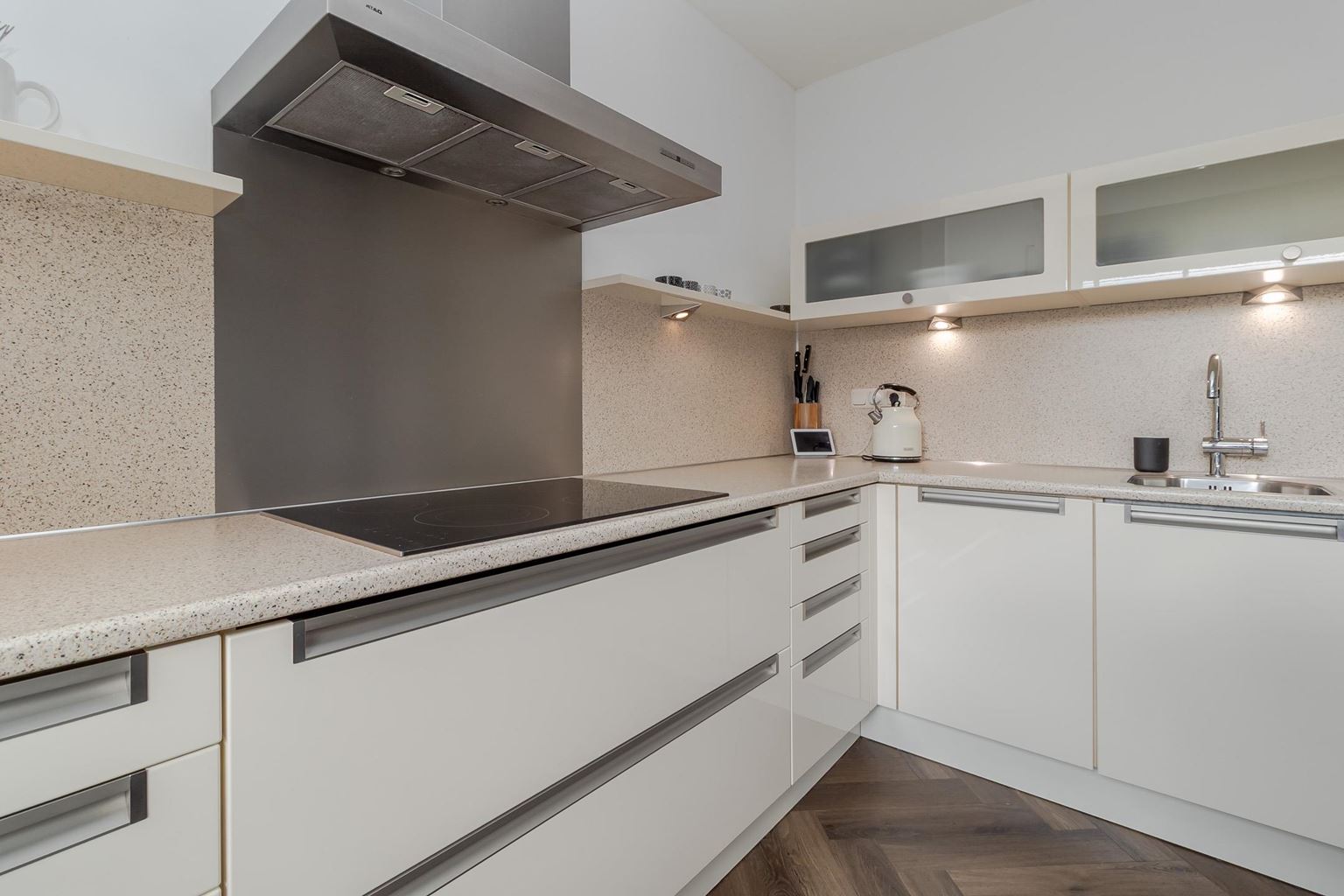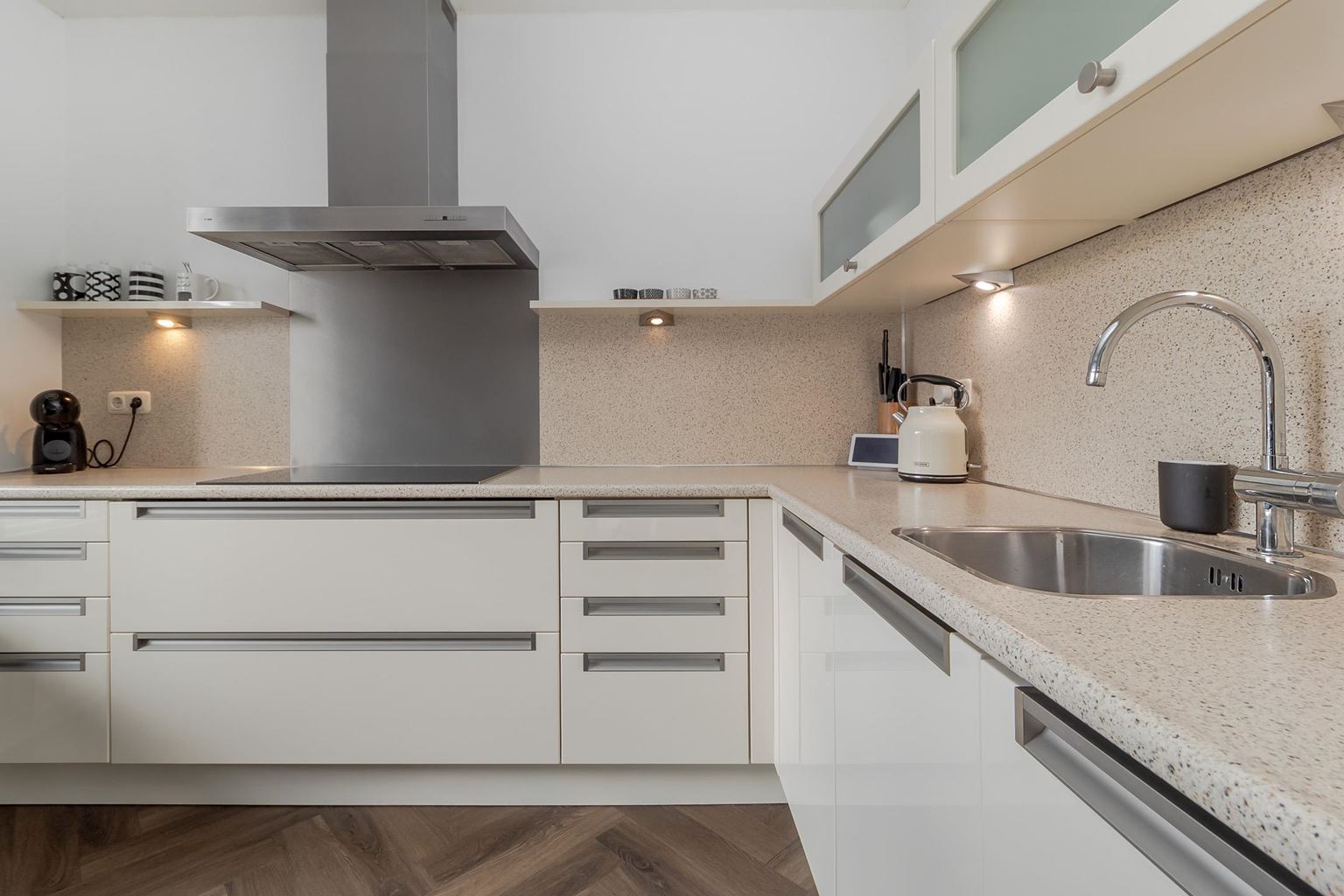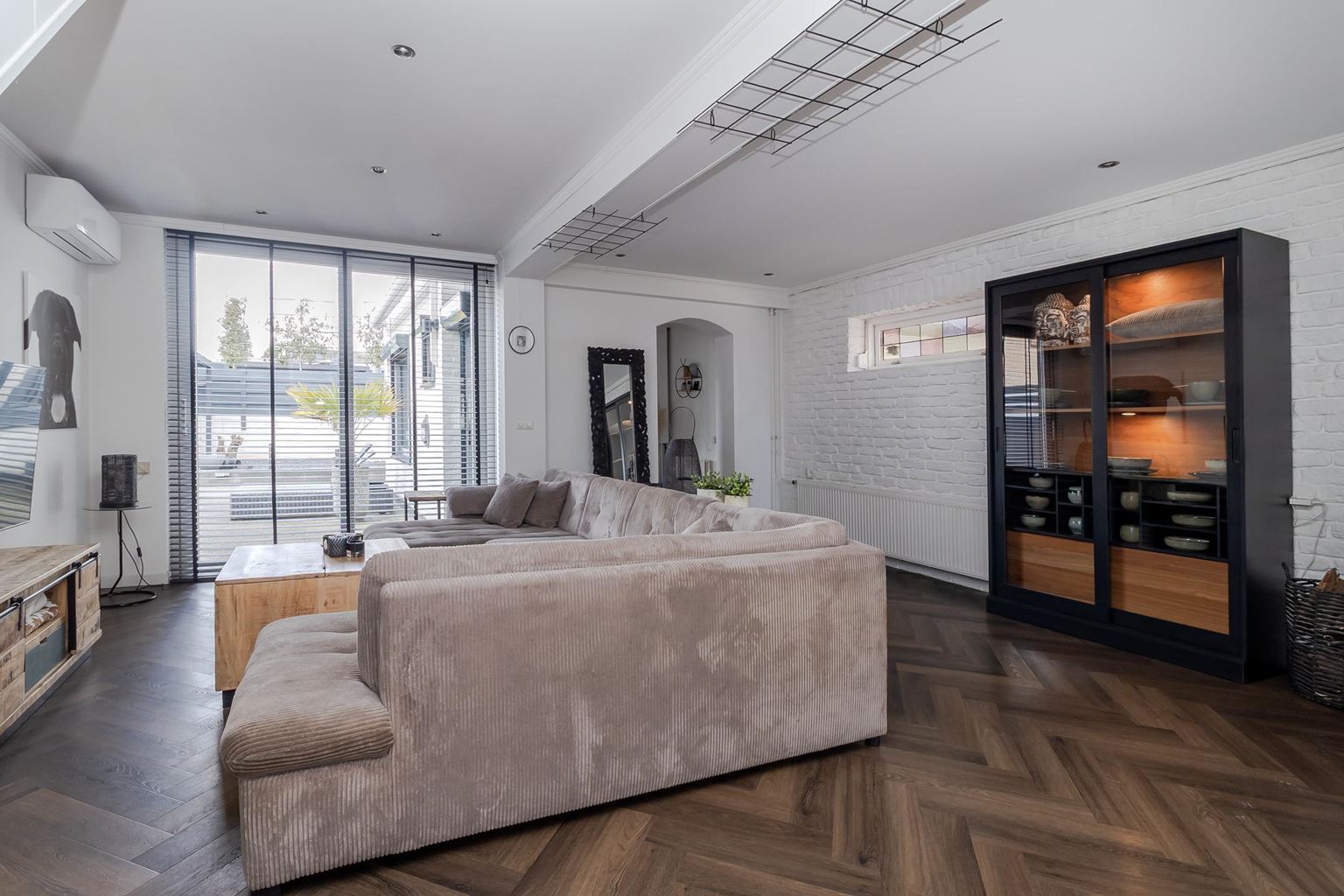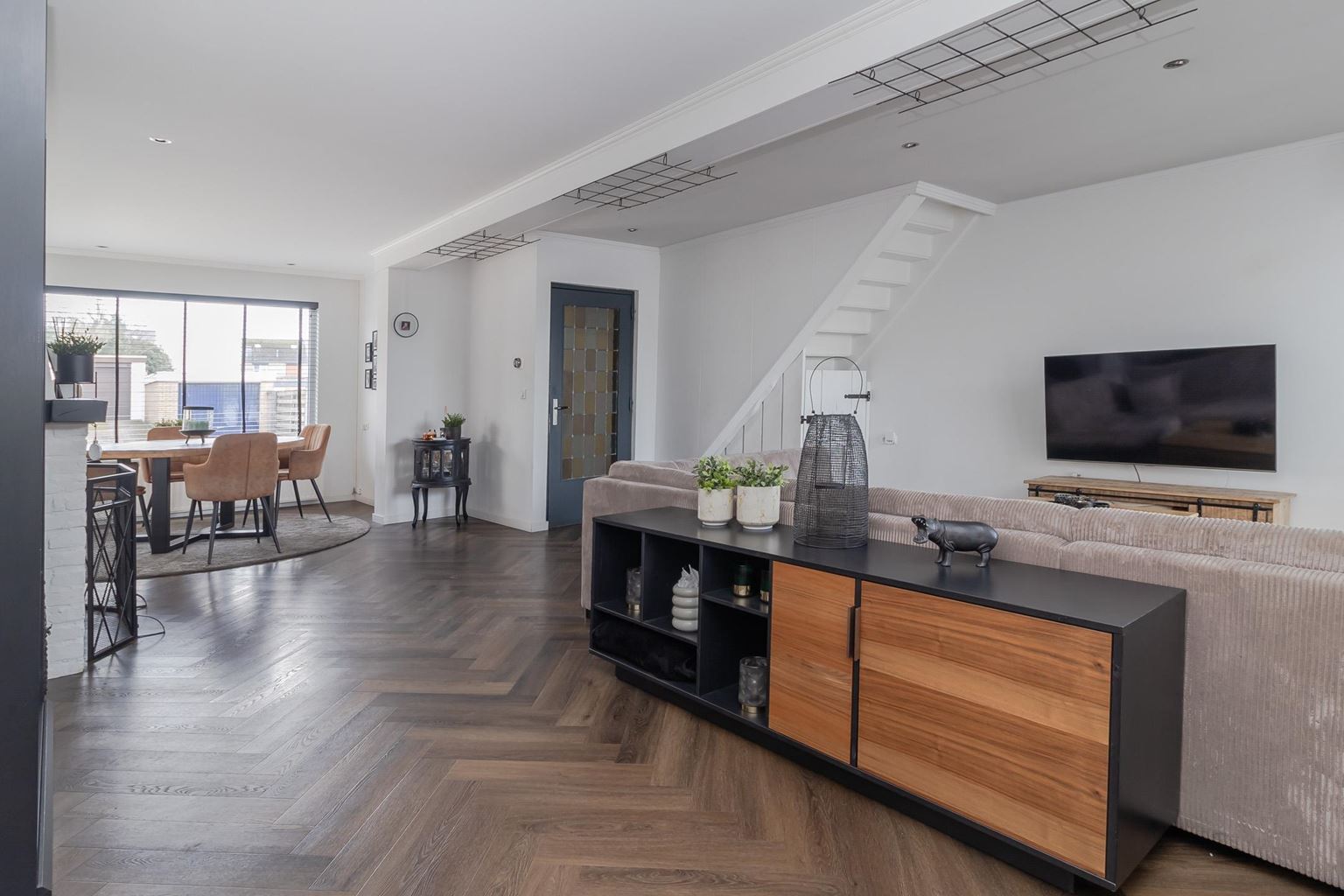 You enter the house through the entrance hall (approx. 6m²). Here you will find the cloakroom, the meter cupboard, and the staircase to the first floor. From the hall, you have access to the cozy living room. The spacious living room (approx. 42 m²) has a cozy fireplace, air conditioning, and sliding doors to the backyard, creating a pleasant transition between indoors and outdoors and allowing you to enjoy plenty of natural light. From the living room, you reach a hallway where the toilet is located, equipped with a standing toilet and a washbasin. From this hallway, you also have access to both the driveway and the backyard, which provides extra practical ease of use. At the rear of the house is the closed kitchen. The kitchen (approx. 11m²) is equipped with a wall-mounted kitchen unit with base cabinets and a plastic worktop. The following built-in appliances are included: an Atag 4-burner induction hob with Atag stainless steel extractor hood, dishwasher, tall refrigerator, microwave, and oven. The entire ground floor, with the exception of the toilet, has stylish PVC flooring in a Hungarian point pattern, which creates a luxurious and warm atmosphere. Both the living room and the kitchen have sleek stretch ceilings, giving the whole space a modern and well-maintained look.