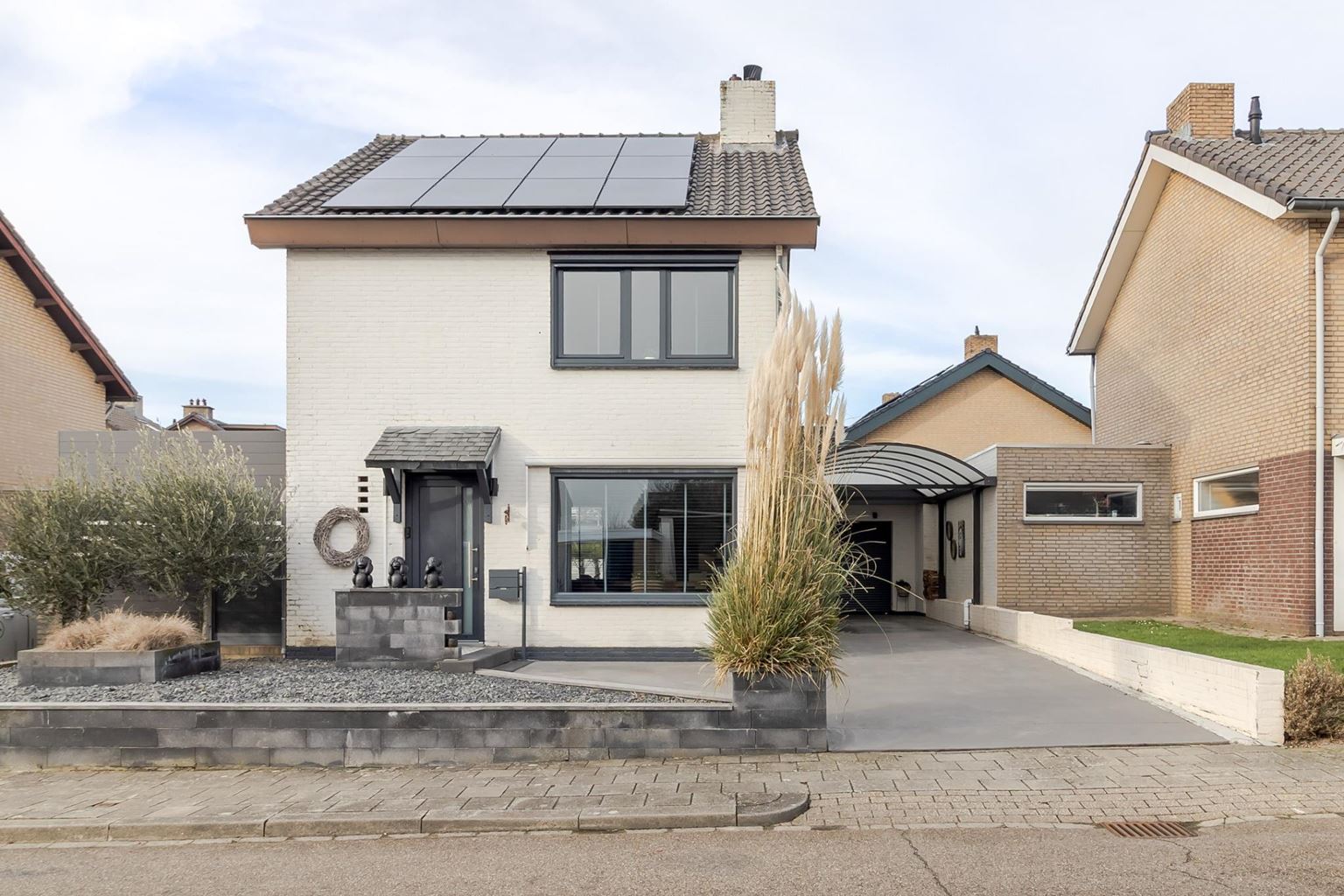 The front garden is neatly landscaped with a combination of gravel and a stylish flower box, planted with ornamental grass and two beautiful olive trees.