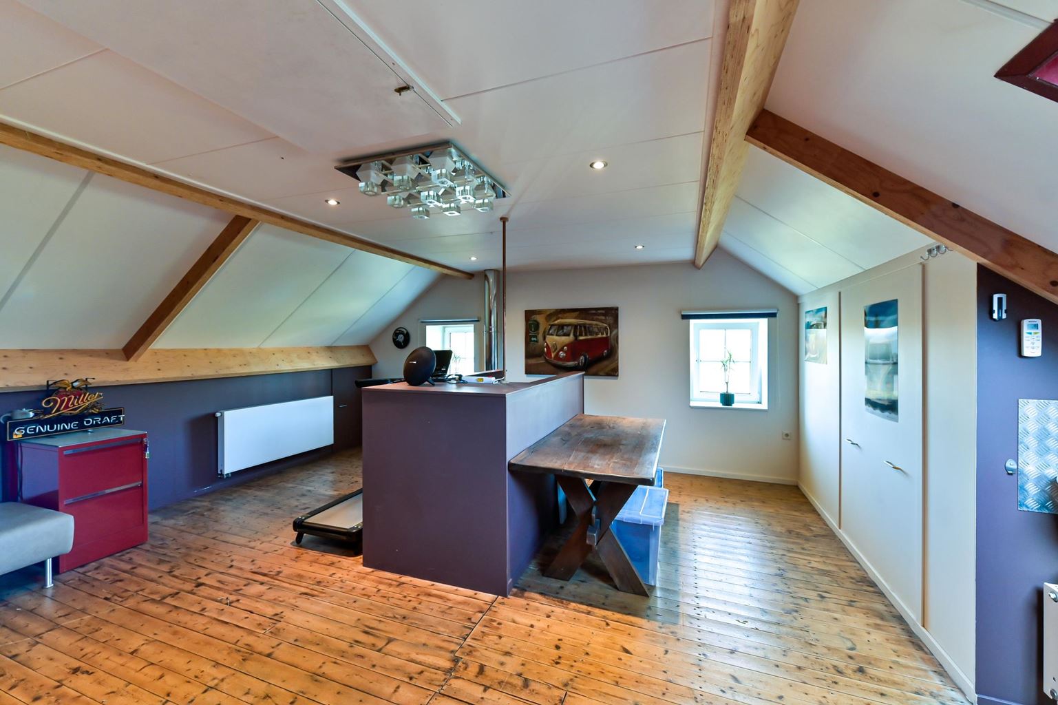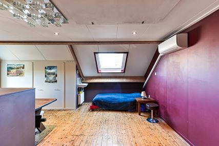 From the landing on the first floor, a wooden staircase provides access to the attic floor. This spacious bedroom (approx. 32 m²) is heated but also equipped with air conditioning and a washbasin. Here too, the beautiful original wooden floorboards are still present. Thanks to the spacious skylight and two windows at the front, this space does not feel like an attic. The central heating boiler is located behind the removable wall panel. From the attic, there is access to the loft for extra storage space. The roof is insulated with Unidek.