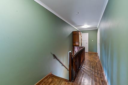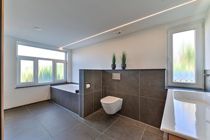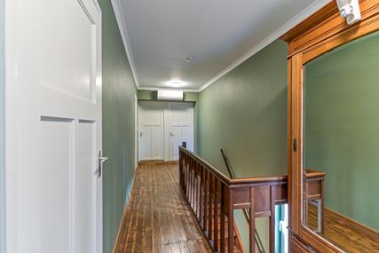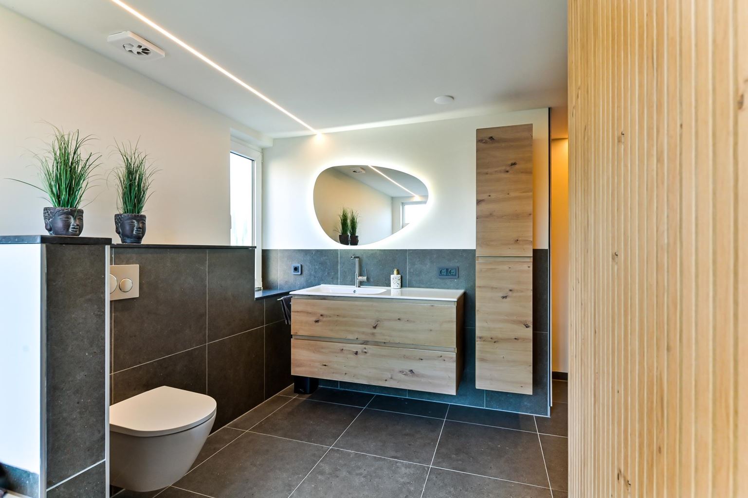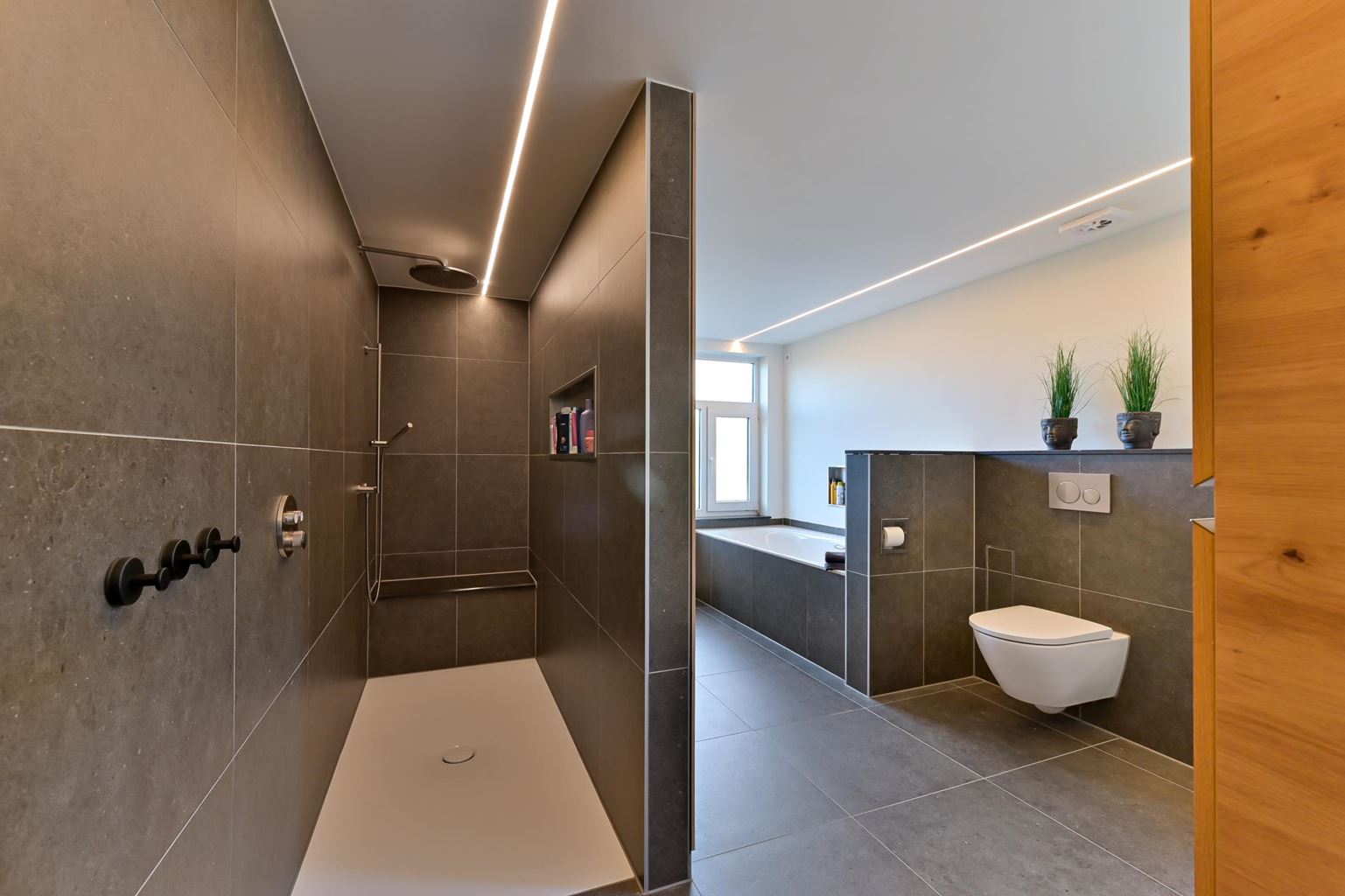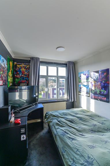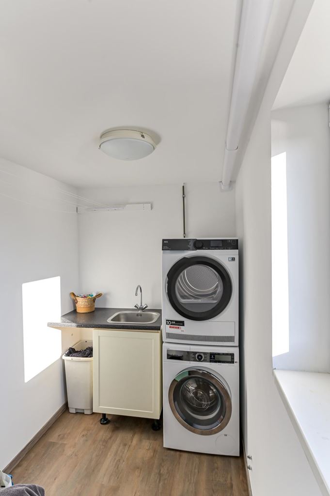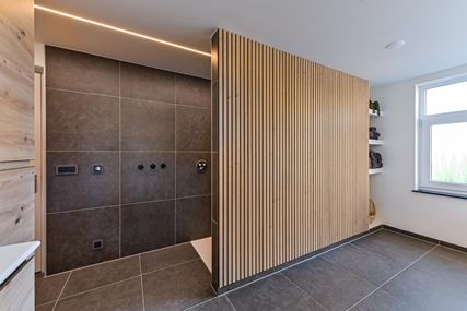 The spacious landing (with air conditioning) leads to the laundry room, bathroom, three bedrooms and the staircase to the second floor. The laundry room (approx. 3 m²) contains the white goods and a sink, ideally located on this floor close to the bedrooms. The modern bathroom, dating from 2025, is fully equipped with underfloor heating, a walk-in shower with bench, bathtub, wall-mounted toilet and washbasin in wood-look furniture. The modern bathroom, which was recently renovated (2025), is stylish and comfortably furnished. The space has a walk-in shower, wall-mounted toilet, washbasin in a wood-look cabinet and a bathtub, meeting all your comfort needs. Thanks to two windows, the bathroom enjoys pleasant natural light. The bathroom is largely tiled and finished with an eye for detail: sleek LED lighting is incorporated into the ceiling and the partition between the shower and the rest of the bathroom is covered with decorative wooden wall panels, creating a warm and modern look. Adjacent to this is the master bedroom (approx. 20 m²), which has air conditioning. Bedroom II (approx. 13 m²) and bedroom III (approx. 7 m²) are located at the front of the house. All bedrooms and the landing still have the original floorboards, except for bedroom III, which has been covered with carpet.