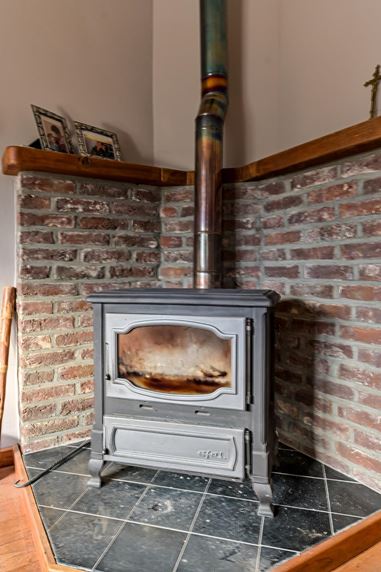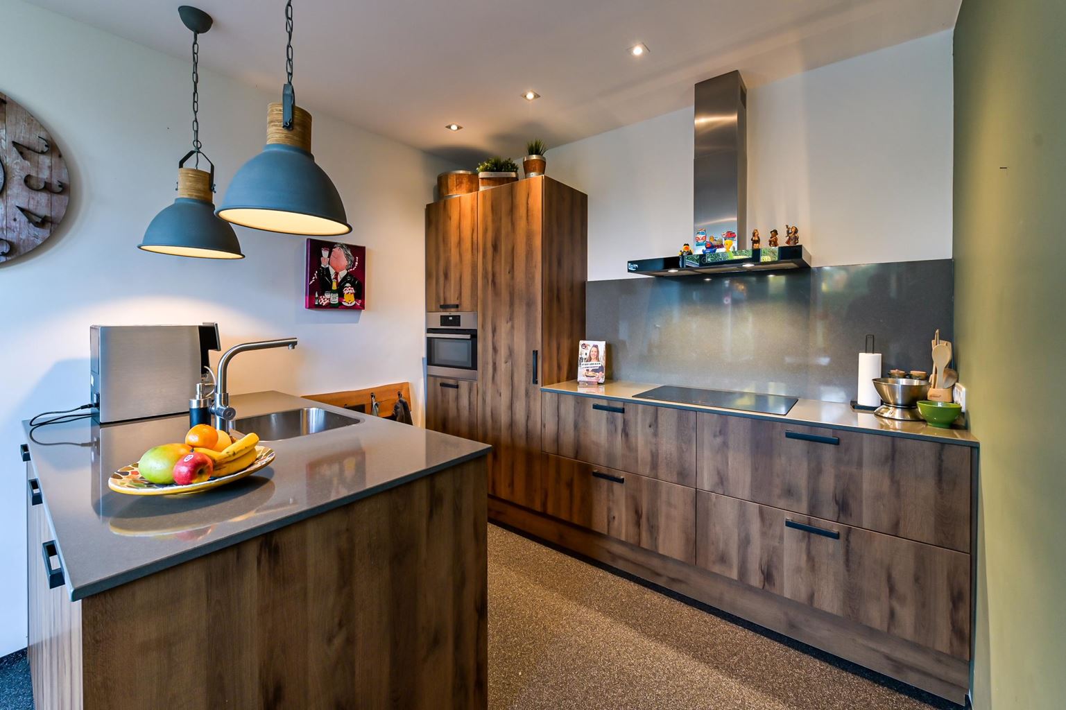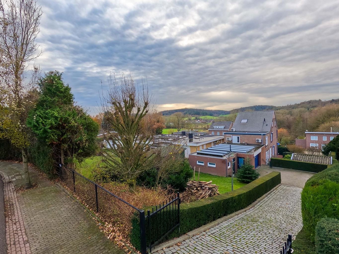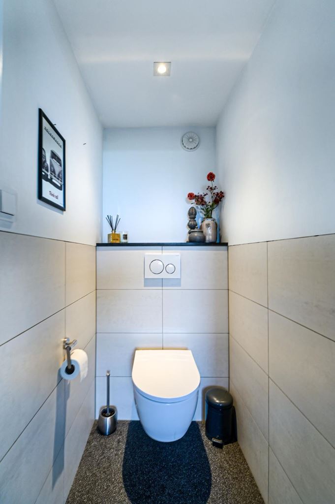 Entrance/hall (approx. 13 m²) providing access to the living room, kitchen, toilet, cellar and the hallway leading to the first floor. The L-shaped living room (approx. 37 m²) is divided into a dining and living area. The cosy living room is a wonderful place to relax and offers unobstructed, panoramic views of the Gerendal. The room has warm wooden flooring and is equipped with Daikin air conditioning, ensuring optimal comfort in every season. The wood-burning stove forms the atmospheric centrepiece of the room and not only provides cosiness, but also pleasant and efficient heat. The kitchen (approx. 20 m²) is located on the left side of the entrance and features an island and wood-look kitchen units. The island has a Quooker, sink and dishwasher (Miele). The wall units with base and wall cabinets are equipped with the following built-in appliances (AEG): a 4-burner induction hob, stainless steel extractor hood, refrigerator and combination microwave. The partially tiled modern toilet has a wall-mounted toilet. The hallway leading to the first floor has enough space for a wardrobe. The hall, kitchen, toilet and hallway have a gravel floor.