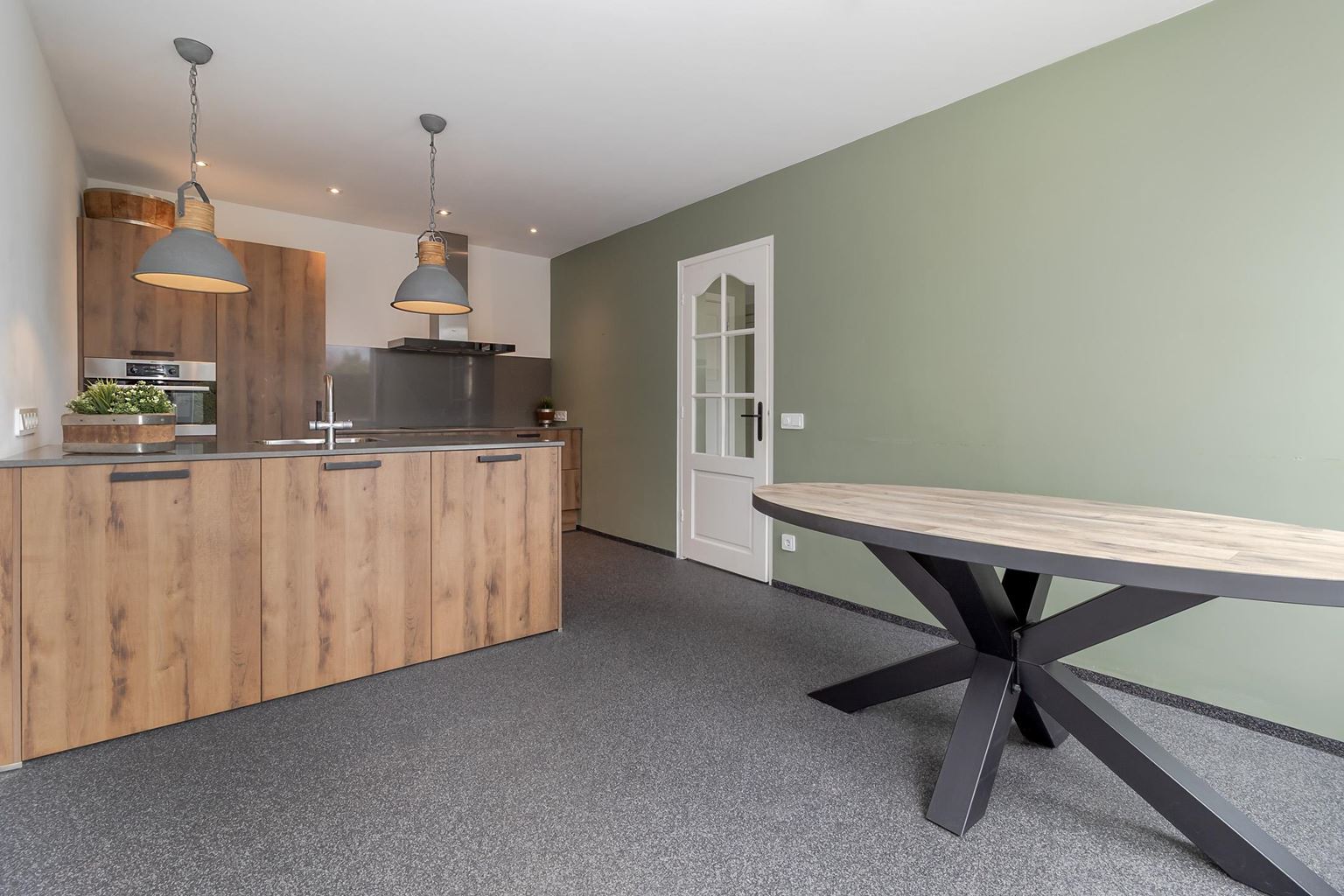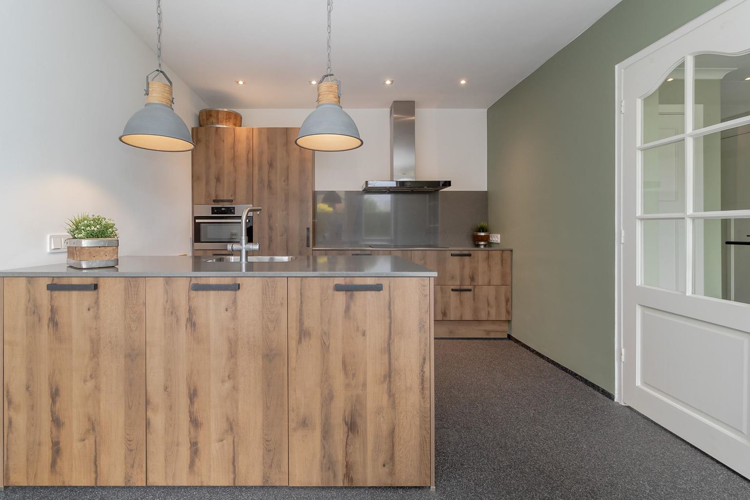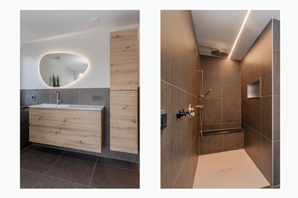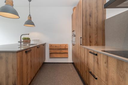 Entrance/hall (approx. 13 m²) providing access to the living room, kitchen, toilet, cellar and the hallway leading to the first floor. The L-shaped living room (approx. 37 m²) is divided into a dining and living area. The cosy living room is a wonderful place to relax and offers unobstructed, panoramic views of the Gerendal. The room has warm wooden flooring and is equipped with Daikin air conditioning, ensuring optimal comfort in every season. The wood-burning stove forms the atmospheric centrepiece of the room and not only provides cosiness, but also pleasant and efficient heat. The kitchen (approx. 20 m²) is located on the left side of the entrance and features an island and wood-look kitchen units. The island has a Quooker, sink and dishwasher (Miele). The wall units with base and wall cabinets are equipped with the following built-in appliances (AEG): a 4-burner induction hob, stainless steel extractor hood, refrigerator and combination microwave. The partially tiled modern toilet has a wall-mounted toilet. The hallway leading to the first floor has enough space for a wardrobe. The hall, kitchen, toilet and hallway have a gravel floor.