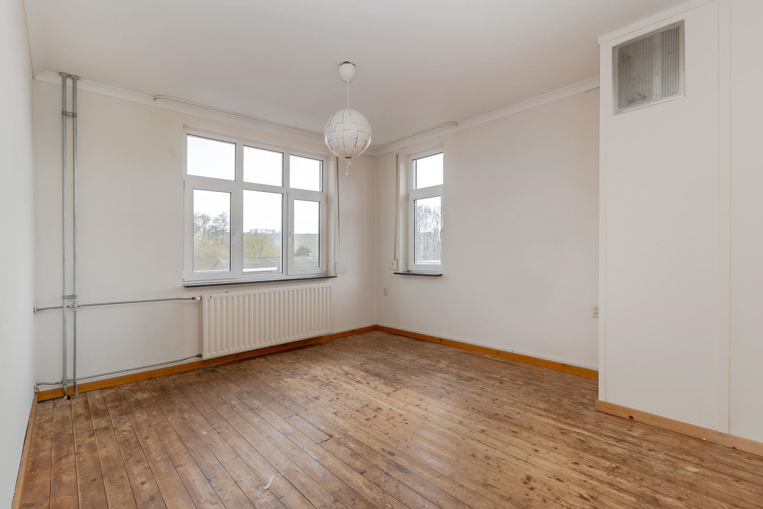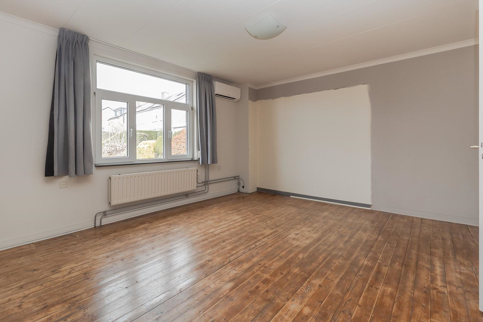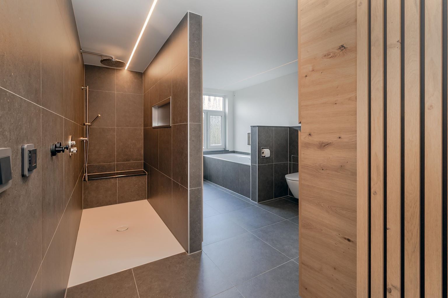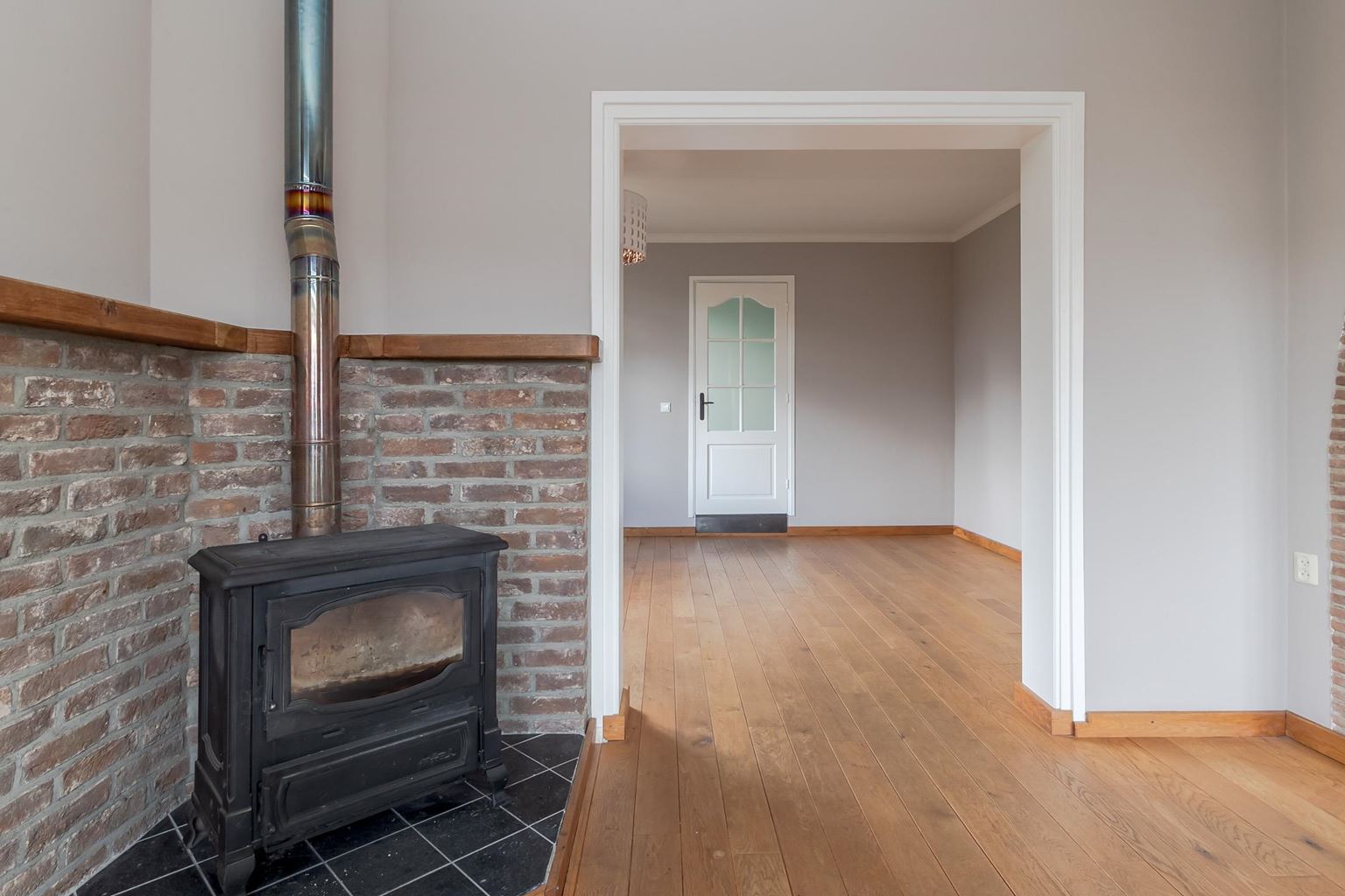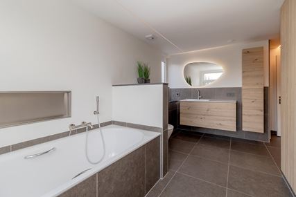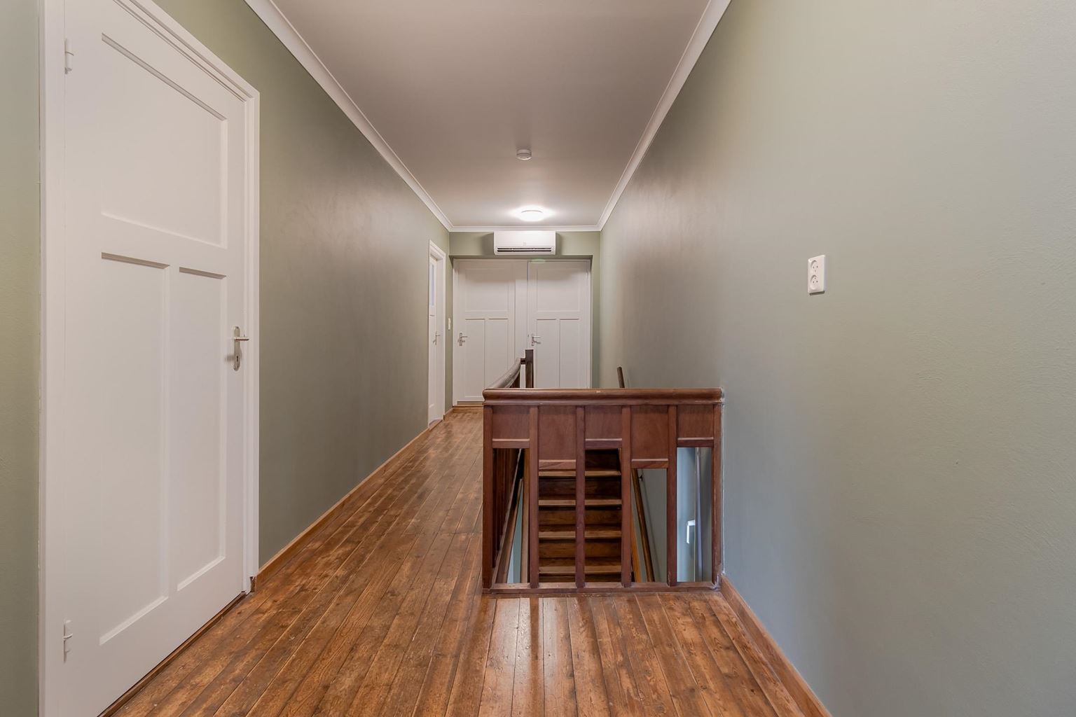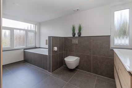 The spacious landing (with air conditioning) leads to the laundry room, bathroom, three bedrooms and the staircase to the second floor. The laundry room (approx. 3 m²) contains the white goods and a sink, ideally located on this floor close to the bedrooms. The modern bathroom, dating from 2025, is fully equipped with underfloor heating, a walk-in shower with bench, bathtub, wall-mounted toilet and washbasin in wood-look furniture. The modern bathroom, which was recently renovated (2025), is stylish and comfortably furnished. The space has a walk-in shower, wall-mounted toilet, washbasin in a wood-look cabinet and a bathtub, meeting all your comfort needs. Thanks to two windows, the bathroom enjoys pleasant natural light. The bathroom is largely tiled and finished with an eye for detail: sleek LED lighting is incorporated into the ceiling and the partition between the shower and the rest of the bathroom is covered with decorative wooden wall panels, creating a warm and modern look. Adjacent to this is the master bedroom (approx. 20 m²), which has air conditioning. Bedroom II (approx. 13 m²) and bedroom III (approx. 7 m²) are located at the front of the house. All bedrooms and the landing still have the original floorboards, except for bedroom III, which has been covered with carpet.