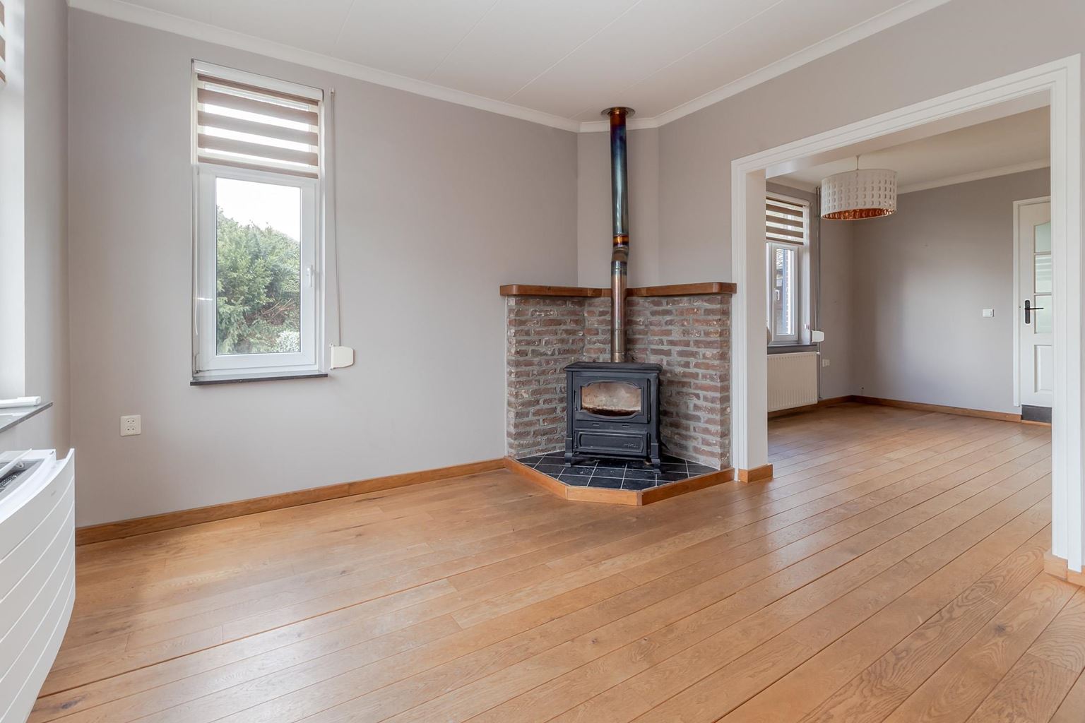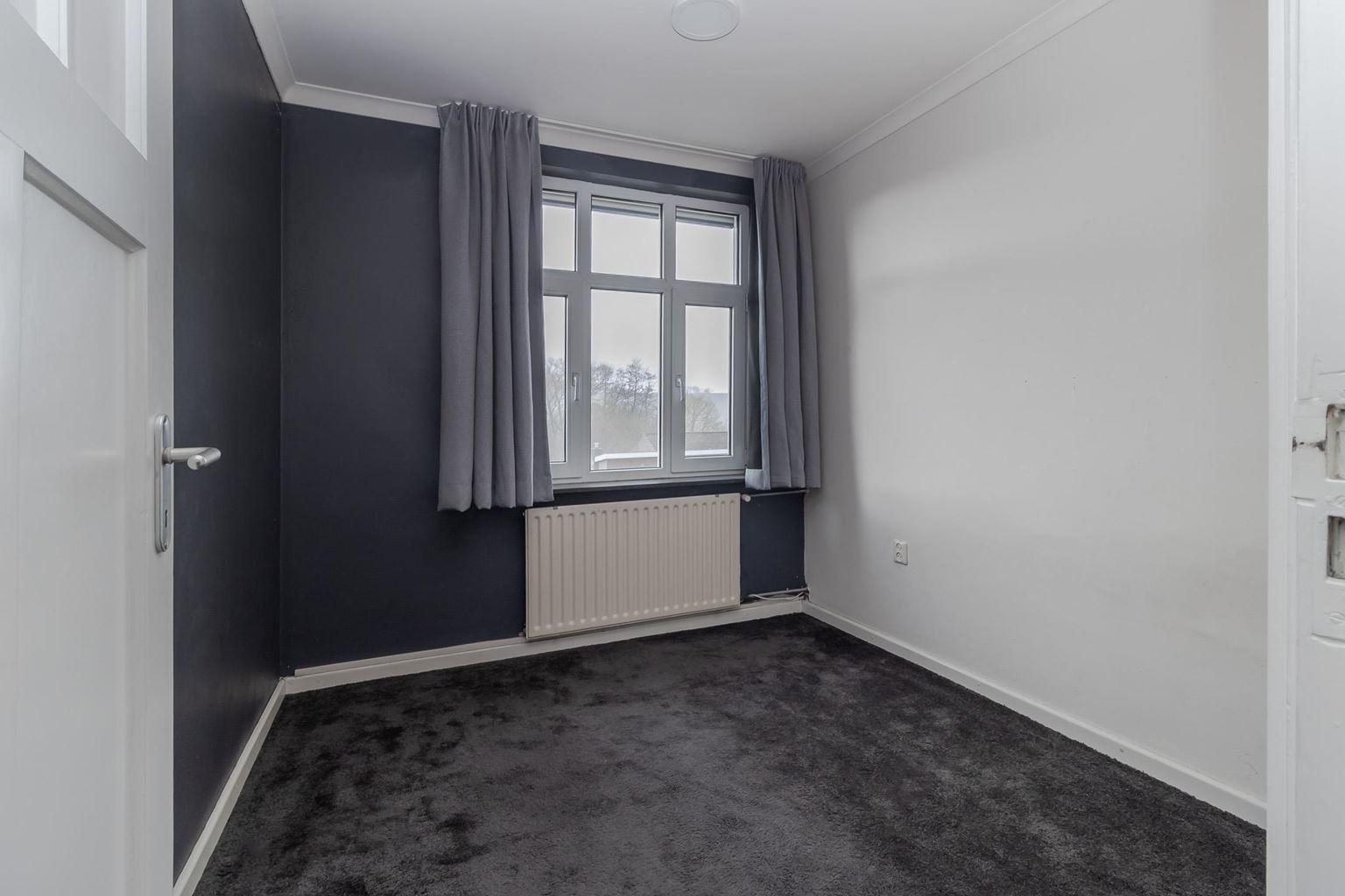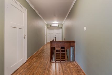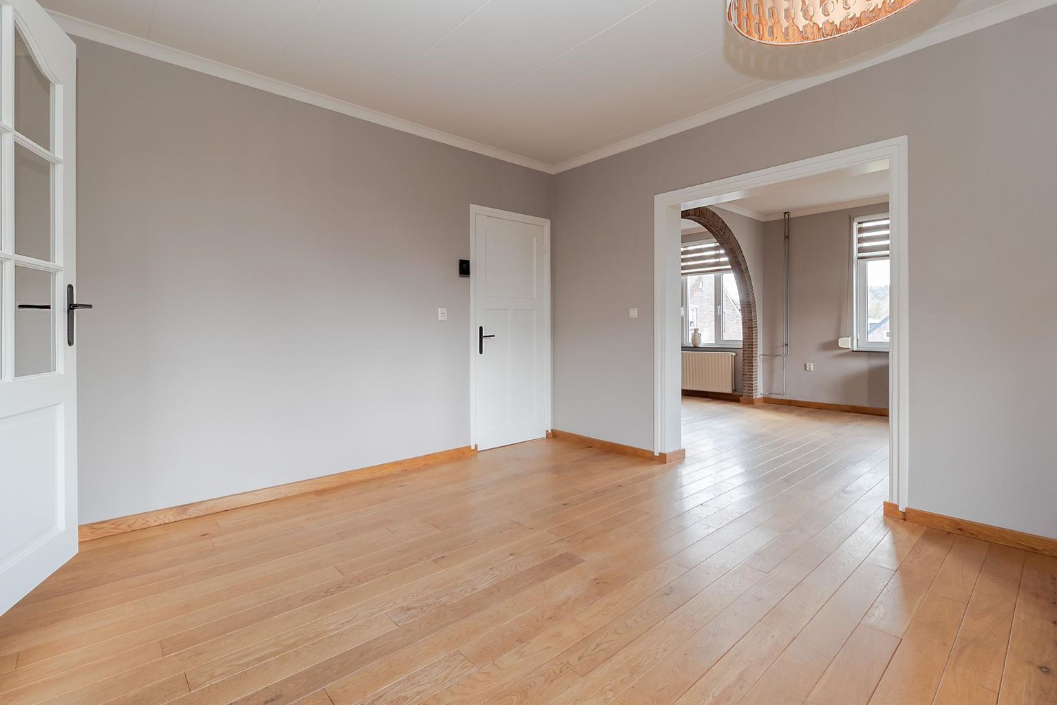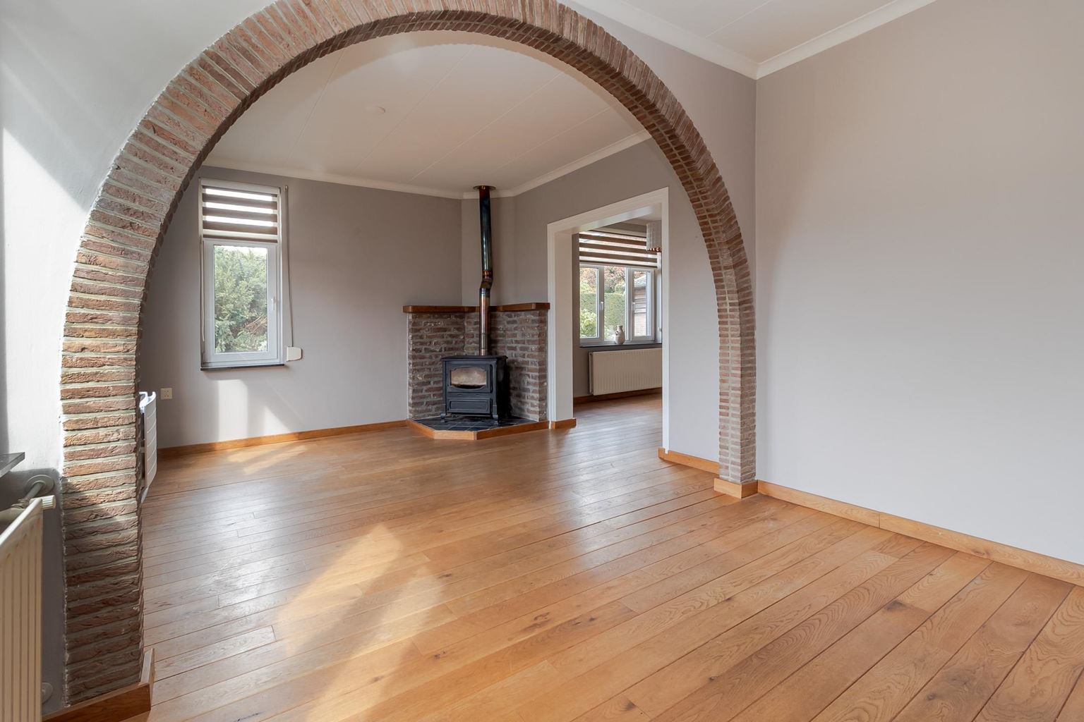 The spacious landing (with air conditioning) leads to the laundry room, bathroom, three bedrooms and the staircase to the second floor. The laundry room (approx. 3 m²) contains the white goods and a sink, ideally located on this floor close to the bedrooms. The modern bathroom, dating from 2025, is fully equipped with underfloor heating, a walk-in shower with bench, bathtub, wall-mounted toilet and washbasin in wood-look furniture. The modern bathroom, which was recently renovated (2025), is stylish and comfortably furnished. The space has a walk-in shower, wall-mounted toilet, washbasin in a wood-look cabinet and a bathtub, meeting all your comfort needs. Thanks to two windows, the bathroom enjoys pleasant natural light. The bathroom is largely tiled and finished with an eye for detail: sleek LED lighting is incorporated into the ceiling and the partition between the shower and the rest of the bathroom is covered with decorative wooden wall panels, creating a warm and modern look. Adjacent to this is the master bedroom (approx. 20 m²), which has air conditioning. Bedroom II (approx. 13 m²) and bedroom III (approx. 7 m²) are located at the front of the house. All bedrooms and the landing still have the original floorboards, except for bedroom III, which has been covered with carpet.