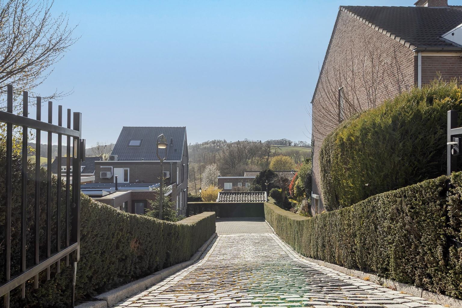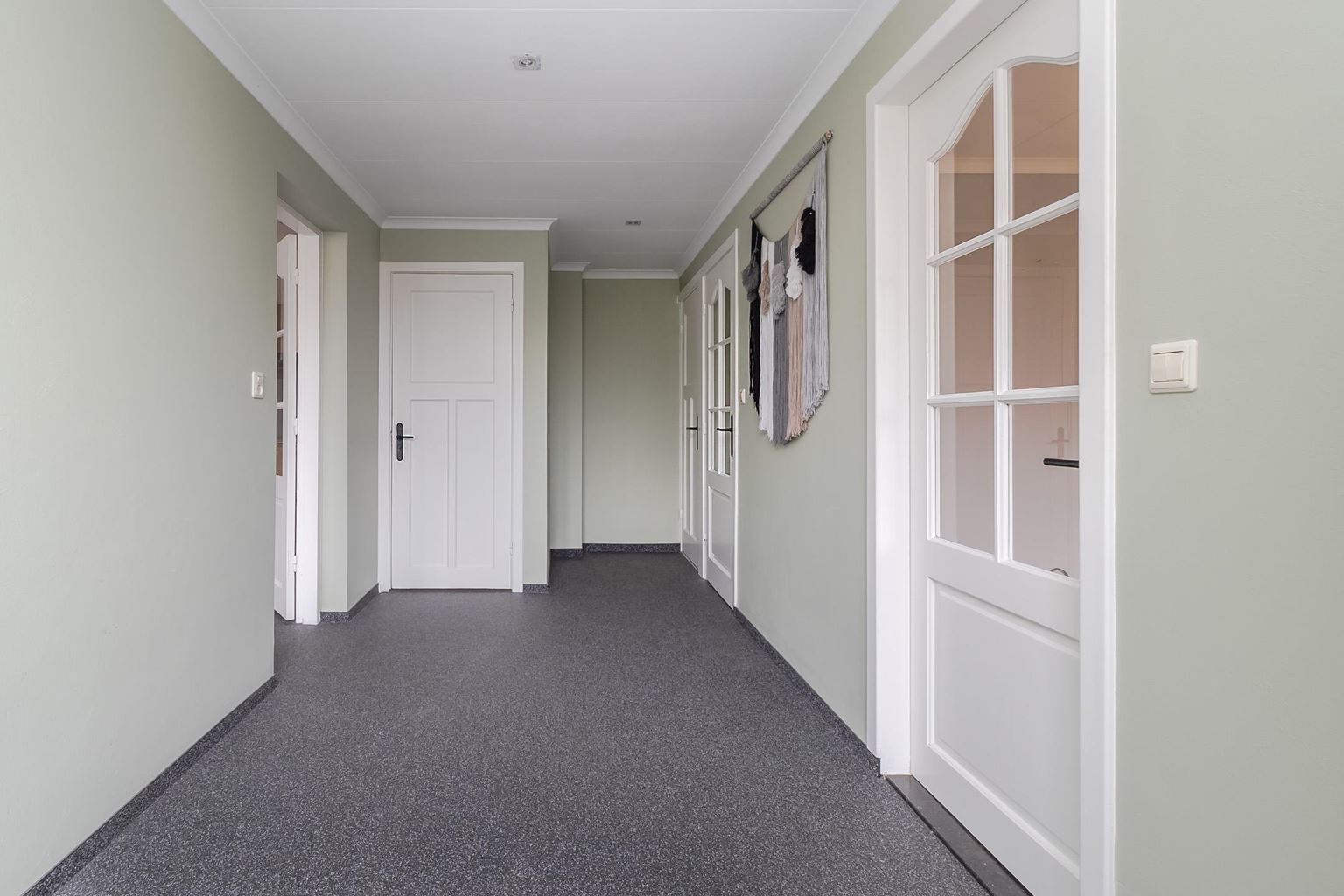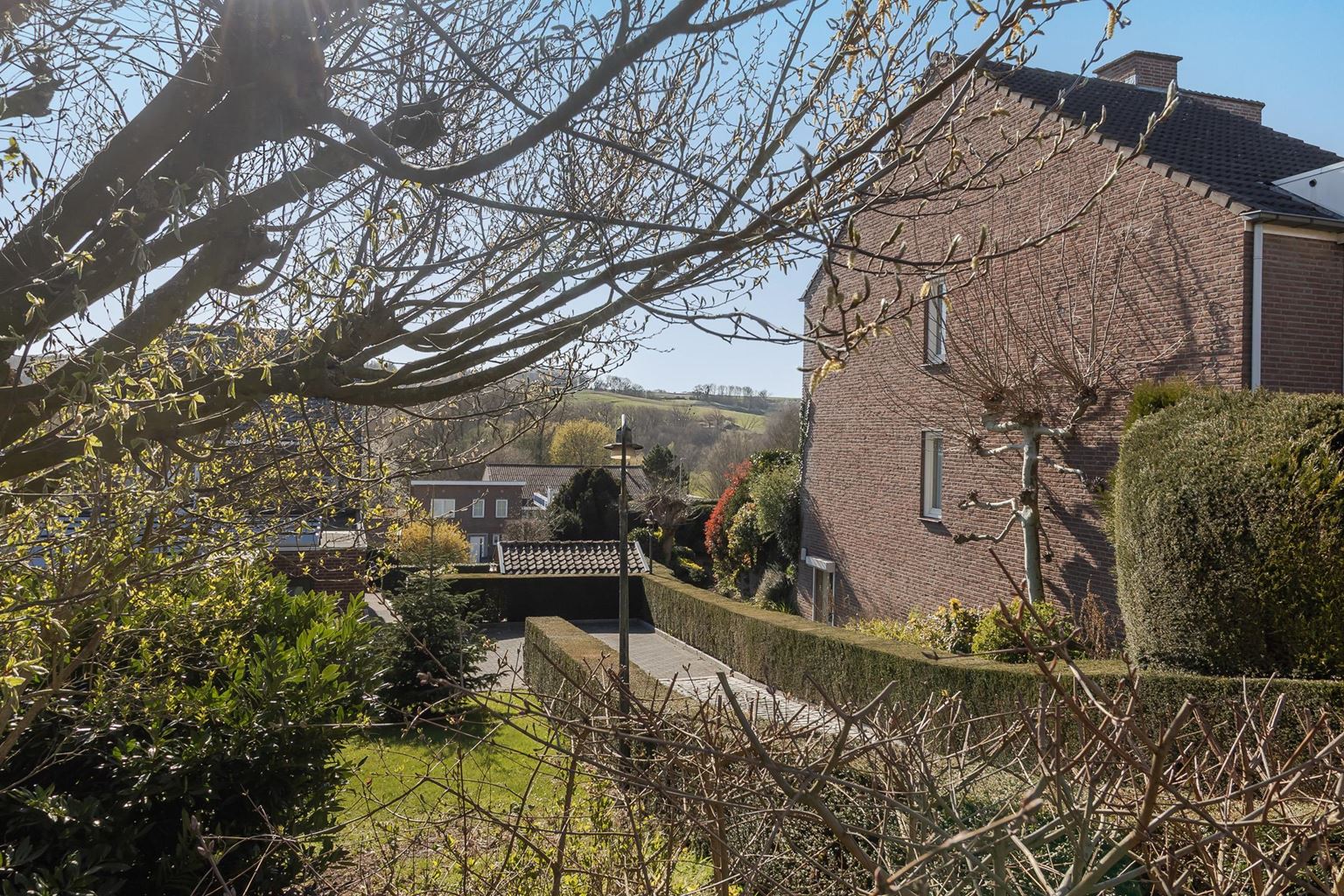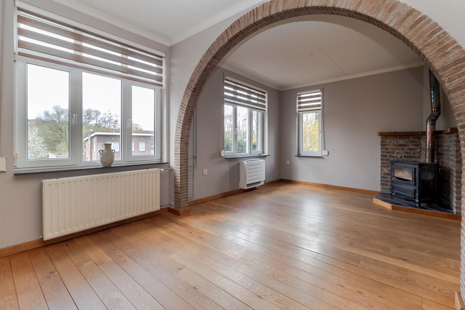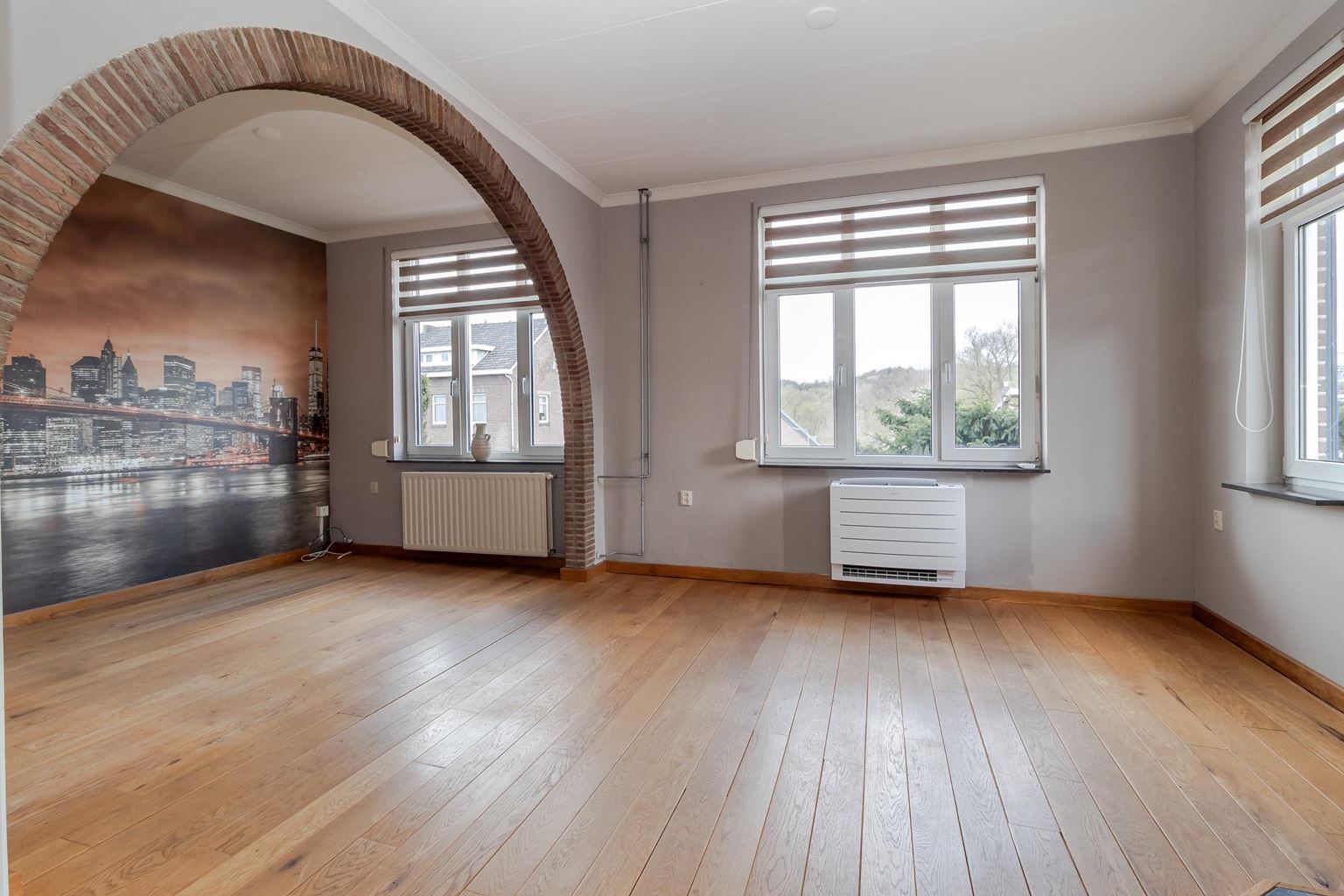 The spacious landing (with air conditioning) leads to the laundry room, bathroom, three bedrooms and the staircase to the second floor. The laundry room (approx. 3 m²) contains the white goods and a sink, ideally located on this floor close to the bedrooms. The modern bathroom, dating from 2025, is fully equipped with underfloor heating, a walk-in shower with bench, bathtub, wall-mounted toilet and washbasin in wood-look furniture. The modern bathroom, which was recently renovated (2025), is stylish and comfortably furnished. The space has a walk-in shower, wall-mounted toilet, washbasin in a wood-look cabinet and a bathtub, meeting all your comfort needs. Thanks to two windows, the bathroom enjoys pleasant natural light. The bathroom is largely tiled and finished with an eye for detail: sleek LED lighting is incorporated into the ceiling and the partition between the shower and the rest of the bathroom is covered with decorative wooden wall panels, creating a warm and modern look. Adjacent to this is the master bedroom (approx. 20 m²), which has air conditioning. Bedroom II (approx. 13 m²) and bedroom III (approx. 7 m²) are located at the front of the house. All bedrooms and the landing still have the original floorboards, except for bedroom III, which has been covered with carpet.