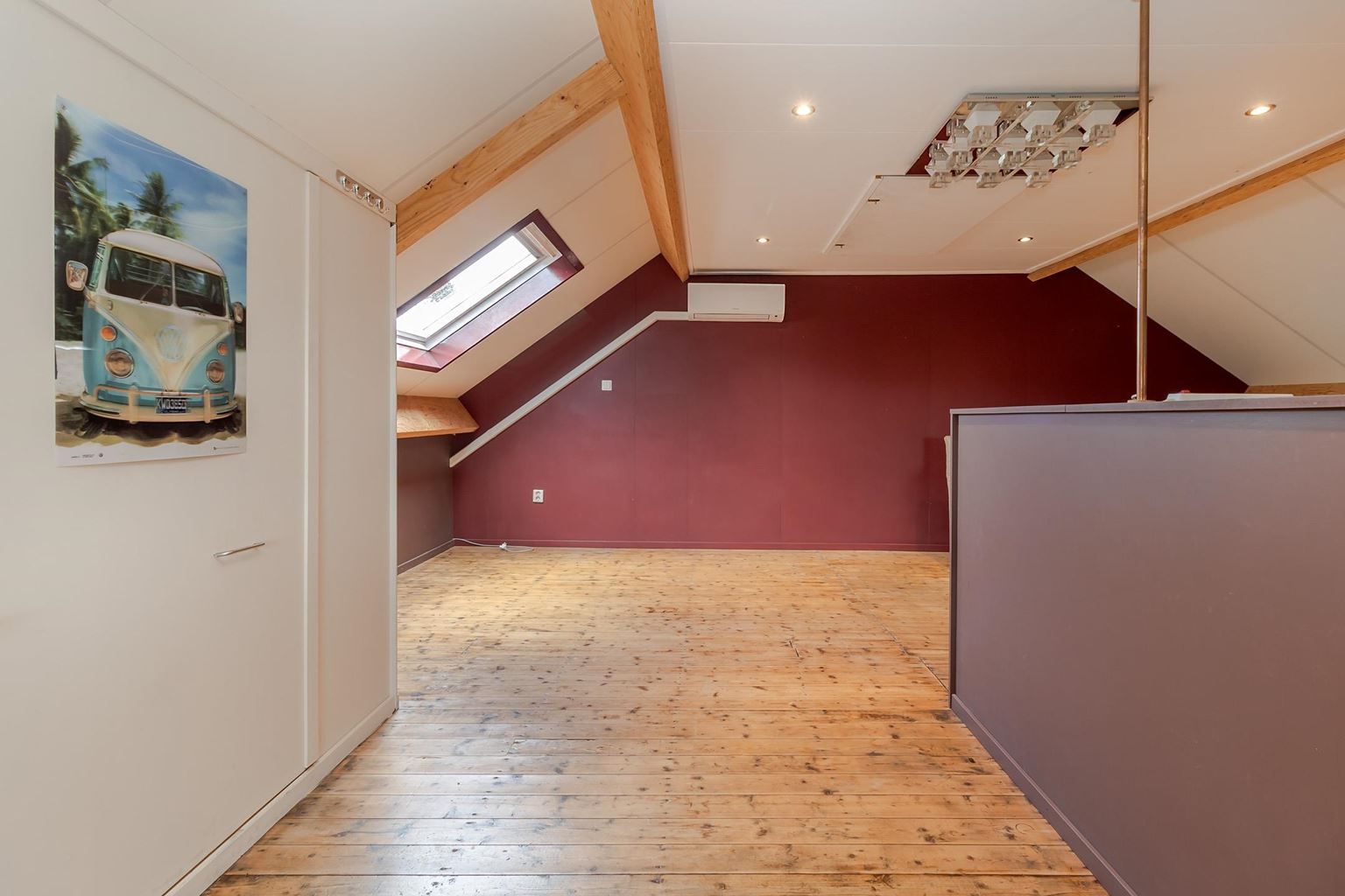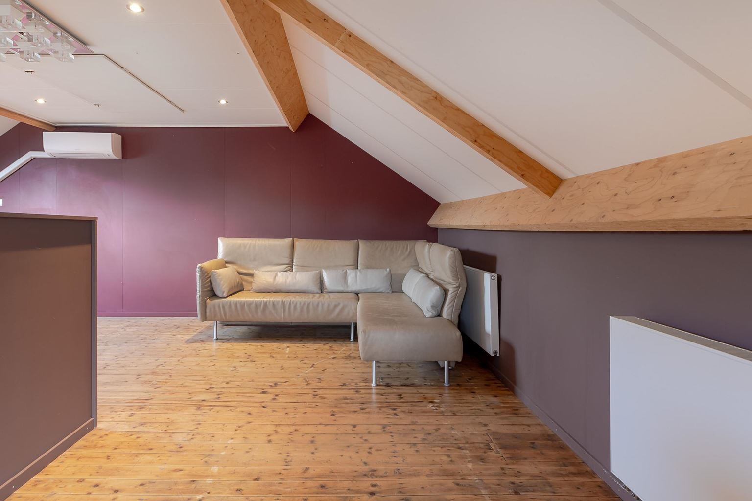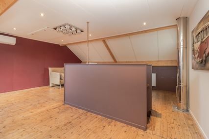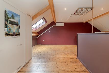 From the landing on the first floor, a wooden staircase provides access to the attic floor. This spacious bedroom (approx. 32 m²) is heated but also equipped with air conditioning and a washbasin. Here too, the beautiful original wooden floorboards are still present. Thanks to the spacious skylight and two windows at the front, this space does not feel like an attic. The central heating boiler is located behind the removable wall panel. From the attic, there is access to the loft for extra storage space. The roof is insulated with Unidek.