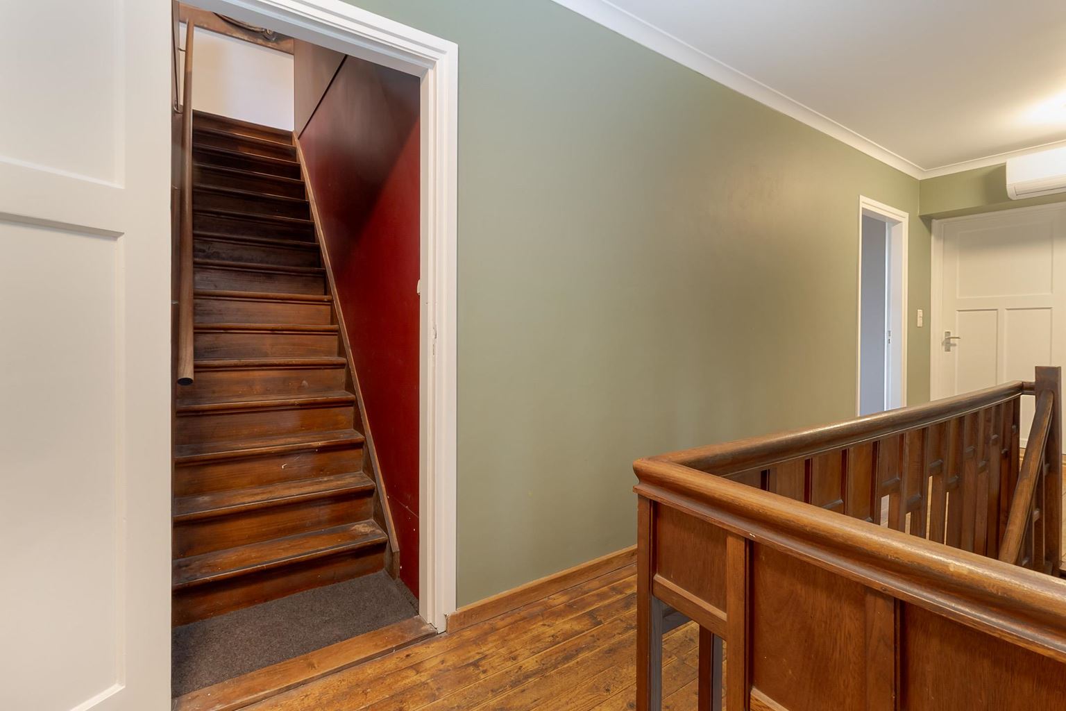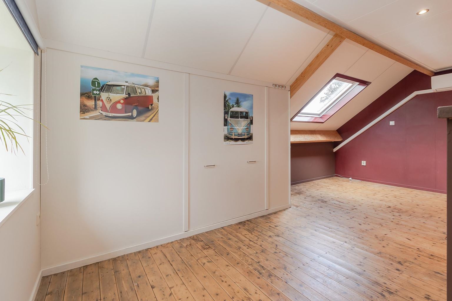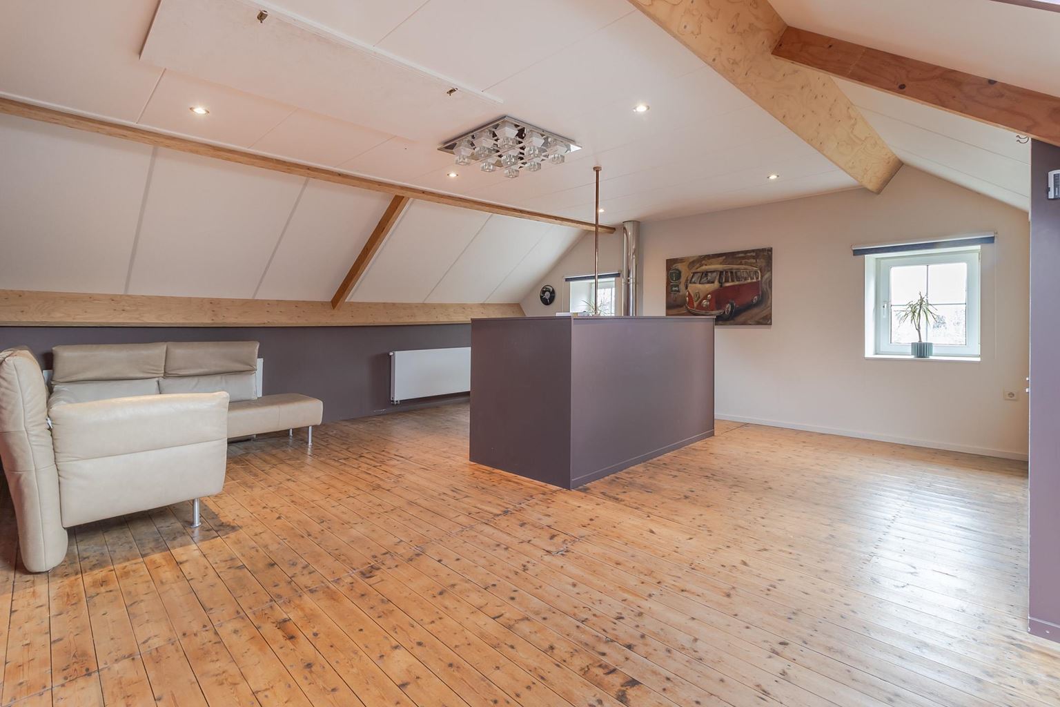 From the landing on the first floor, a wooden staircase provides access to the attic floor. This spacious bedroom (approx. 32 m²) is heated but also equipped with air conditioning and a washbasin. Here too, the beautiful original wooden floorboards are still present. Thanks to the spacious skylight and two windows at the front, this space does not feel like an attic. The central heating boiler is located behind the removable wall panel. From the attic, there is access to the loft for extra storage space. The roof is insulated with Unidek.