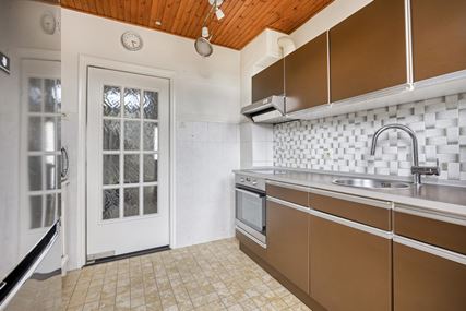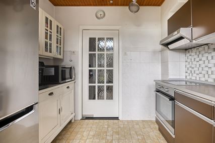 Royale entree met natuurstenen vloer en trappenhuis, meterkast en toilet met fonteintje. De woonkamer (ca.30m²) is voorzien van een parketvloer en houtkachel. De gesloten keuken (ca.7m²) beschikt over een eenvoudige maar nette keukenopstelling en biedt toegang tot het terras en de tuin. De keuken heeft een rechte opstelling en is voorzien van spoelbak, inductie, afzuigkap, koelkast, oven en magnetron. De garage (ca.18m²) is voorzien van een elektrische sectionaalpoort, bereikbaar vanaf de oprit en biedt toegang naar de tuin.