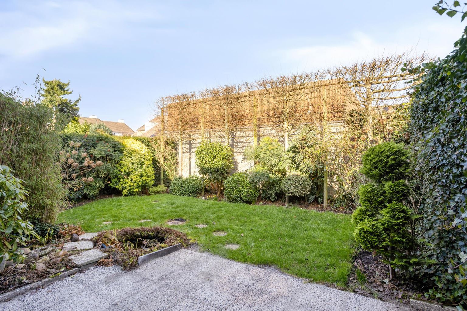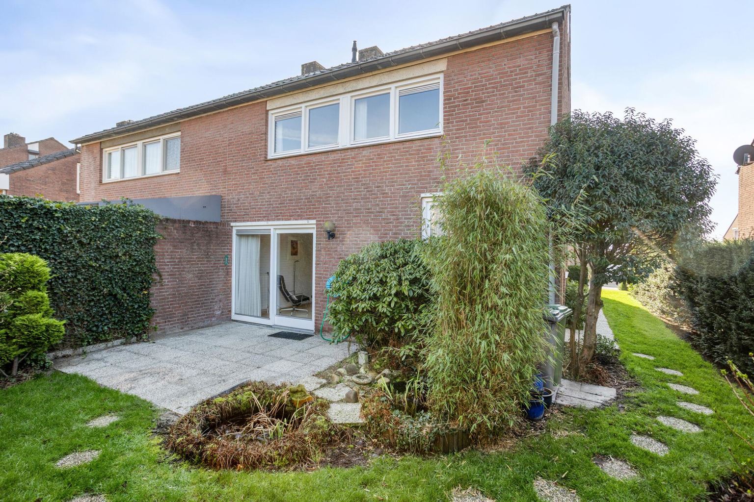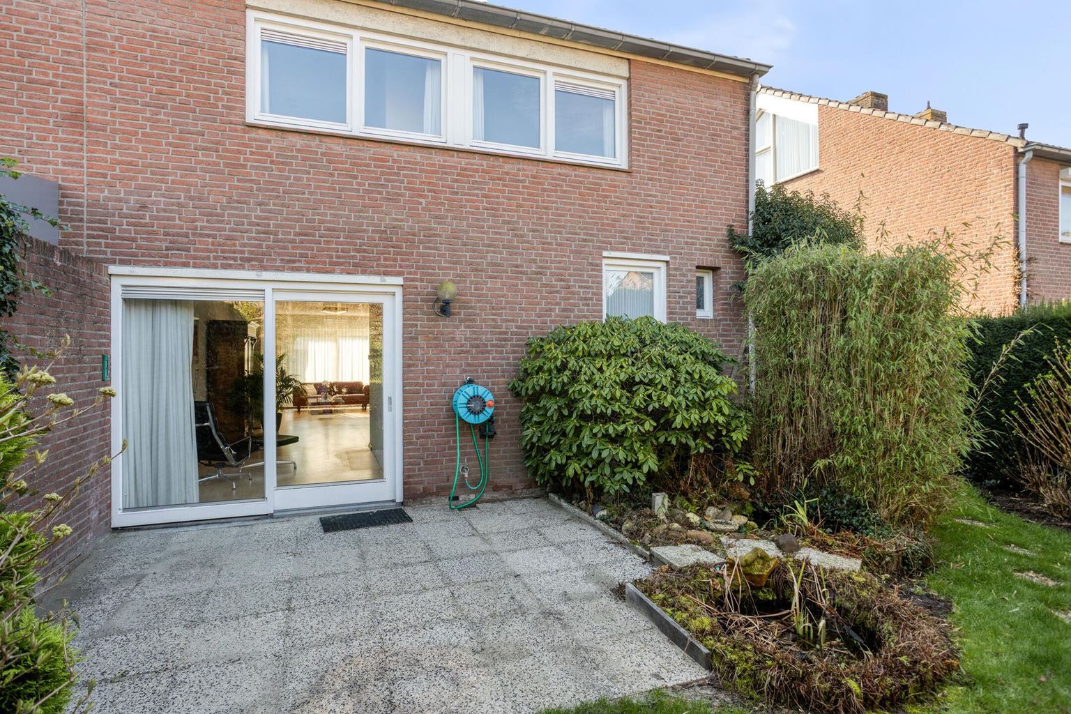 Fraai aangelegde voortuin, met gazon, hagen en beplanting en oprit voor de garage gelegen. Met toegang naar woning en achterom aan de linkerzijde via de zijtuin met looppad en gazon. De achtertuin op het noordwesten, met beklinkerd terras aansluitend aan de woning, met gazon, beplanting en leibomen.